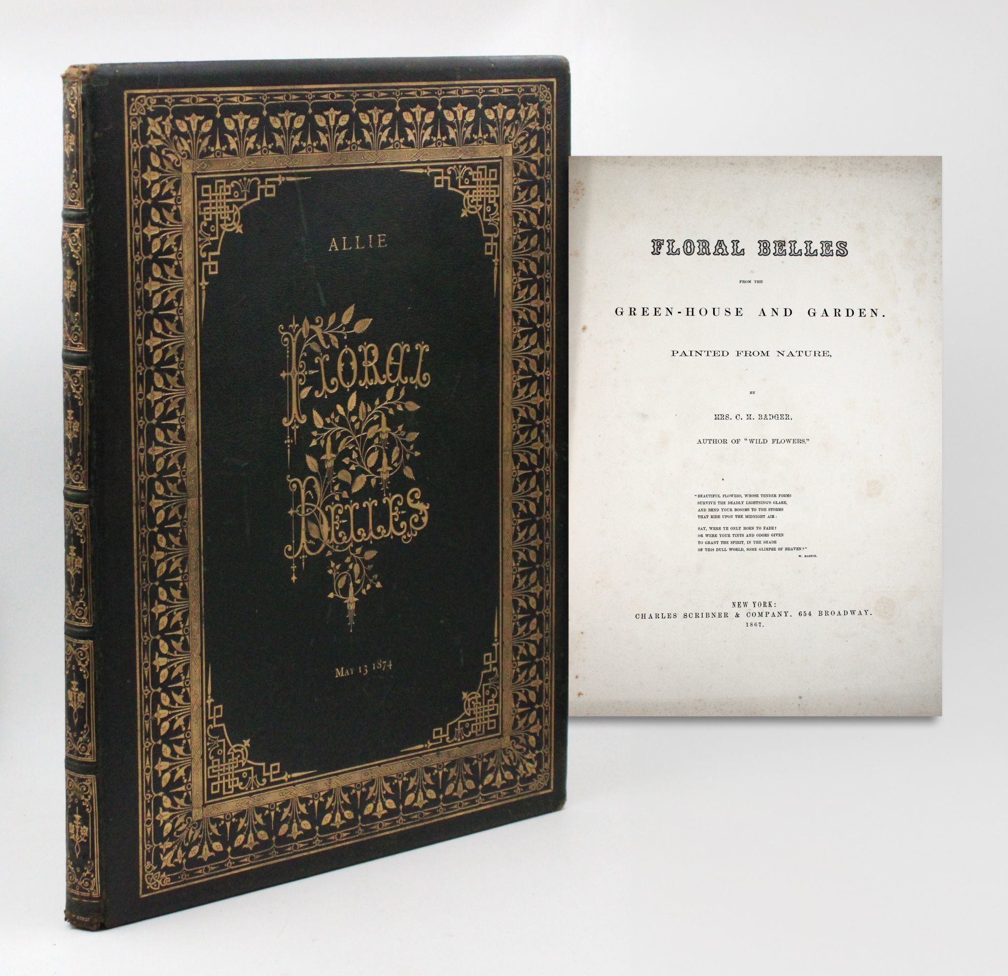 New York: Charles Scribner & Company, 1867. First edition. Hand colored lithographed frontispiece and fifteen hand colored lithographed plates, hand colored by Mrs. Badger. Folio. Publisher's dark green morocco gilt, marbled endpapers, gilt edges, worn at edges and scuffed on rear cover. Early owner's name in gilt on upper cover dated May 1874. First edition. Hand colored lithographed frontispiece and fifteen hand colored lithographed plates, hand colored by Mrs. Badger. Folio. Mrs. Badger was an illustrator with an intuitive feeling for the decorative, as she amply demonstrates in this book, a companion to her Wild Flowers published in 1859, although here focused on the greenhouse and garden. "Contains 16 very beautiful full page flower plates in many colors and shades. Each flower portrayed is also the subject for a poem which serves as text for the illustration" (Bennett).