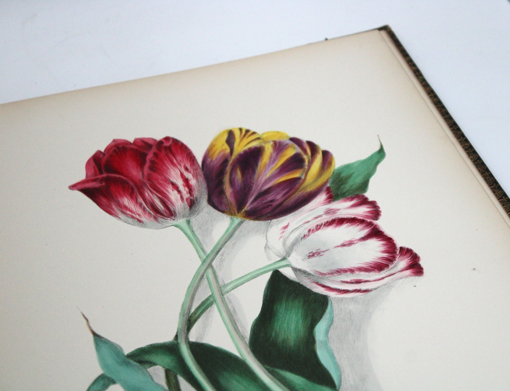 The plates, handcolored by Mrs. Badger over very light lithographed lines and without captions (thus giving the plates the appearance of original watercolors), were executed in an era when chromolithographs were fast replacing such skilled hand work. A contemporary advertisement for the work by the publisher, who priced the book $30 when issued, describes it as follows: "The volume is a stately folio, elegantly bound in Turkey morocco and the paper and presswork, and the whole mechanical execution are perfect. There are sixteen pictures in the volume — favorite or representative flowers — and each of them is painted from nature by the patient and laborious hand of the artist, and with such exquisite care and taste, and delicacy of touch as to vie with nature herself." A review of the work in a December 1866 issue of Hours at Home proclaimed the work "without exaggeration, a most unique, highly artistic and gorgeous affair — a work that reflects great credit on the artistic taste of the country, as well as on the genius and industry of the author."