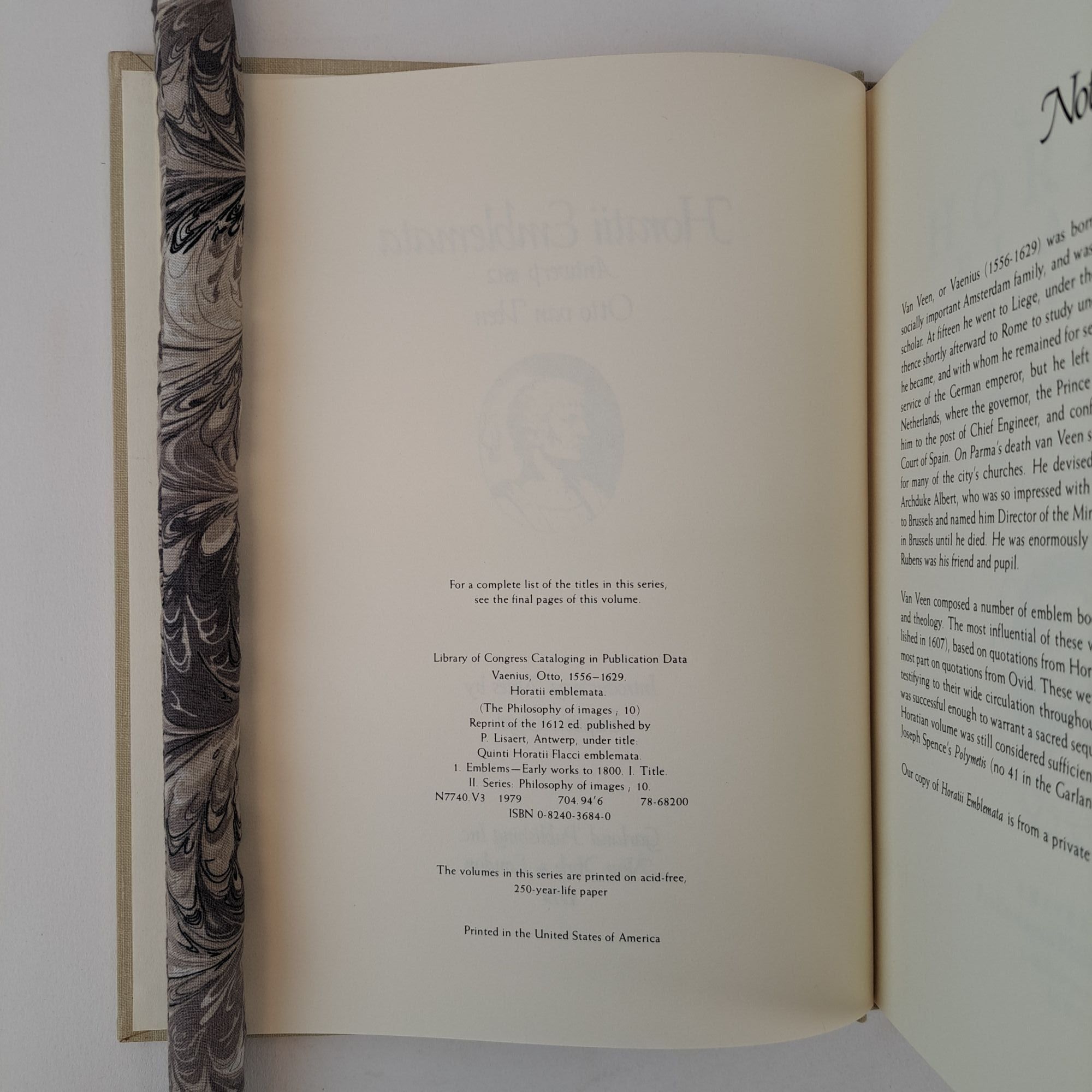New York and London: Garland Publishing, Inc, 1979. Facsimile Edition. Hardcover. Quarto, [6], 212, [4] pages. In Very Good condition. Bound in full grey cloth with black titling to spine. Binding with light soiling to surfaces of boards. Part of the Garland series THE PHILOSOPHY OF IMAGES, containing a facsimile of 1612 Antwerp edition of van Veen's work. Shelved in Room G. 1389684. Special Collections.