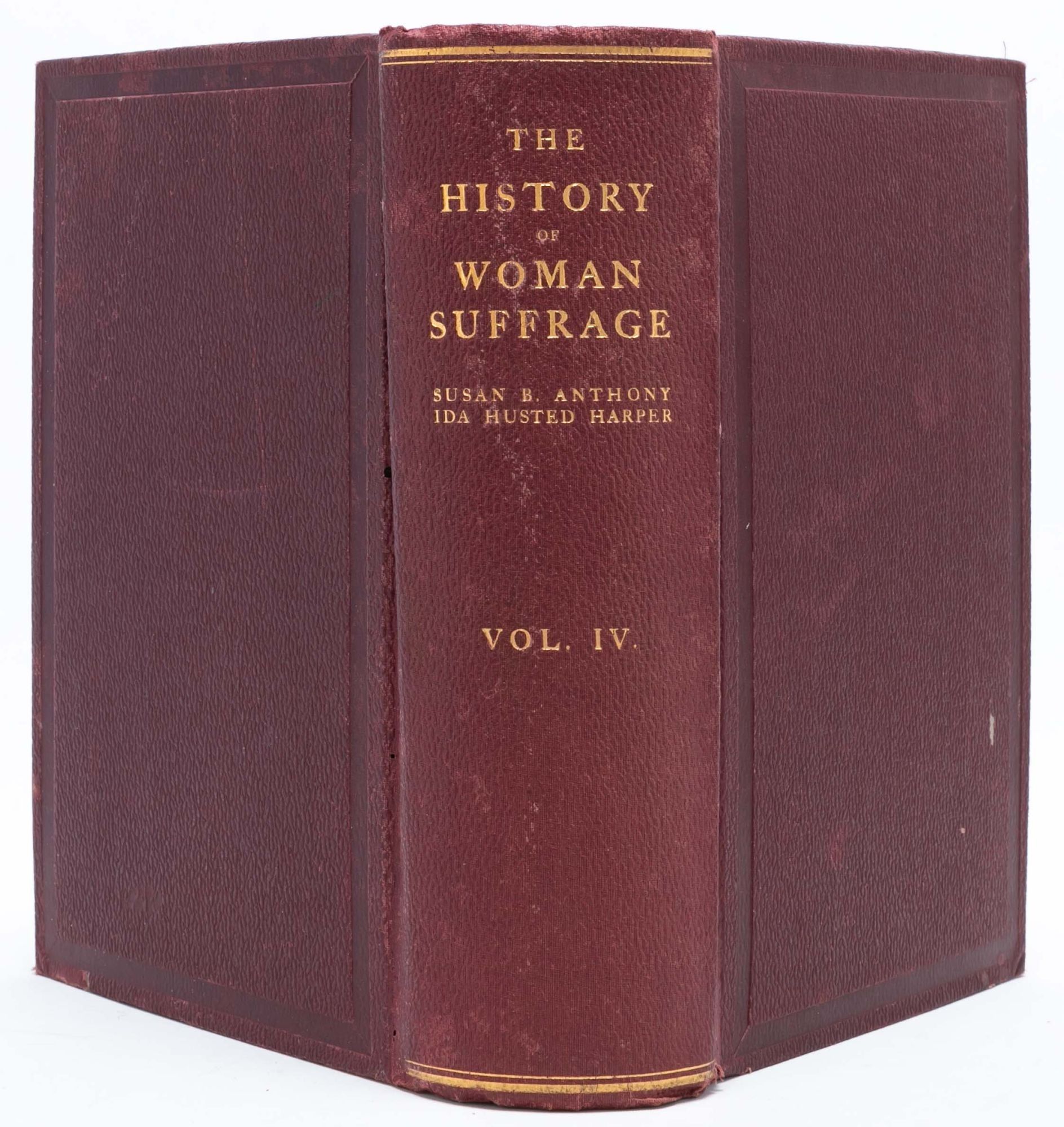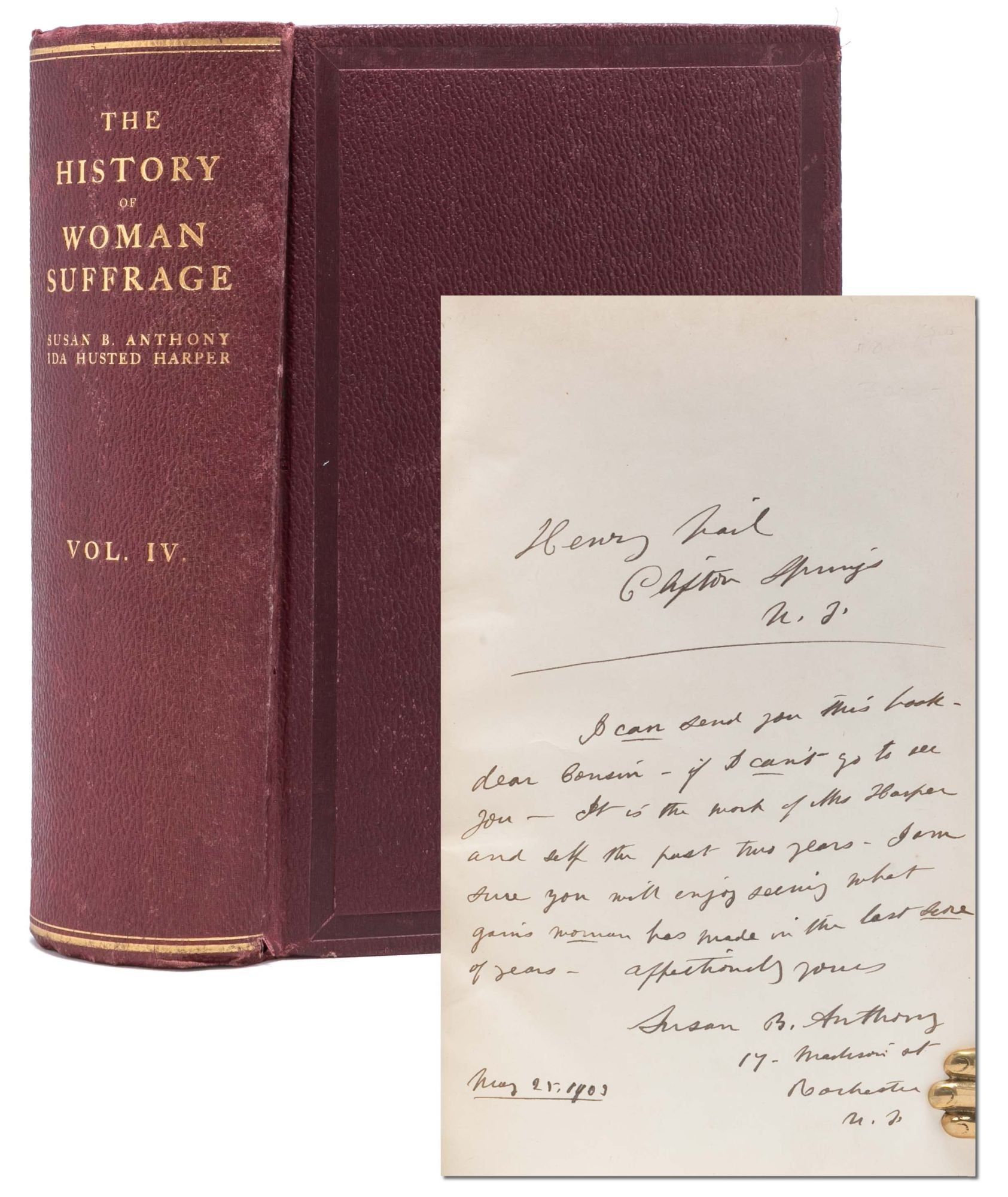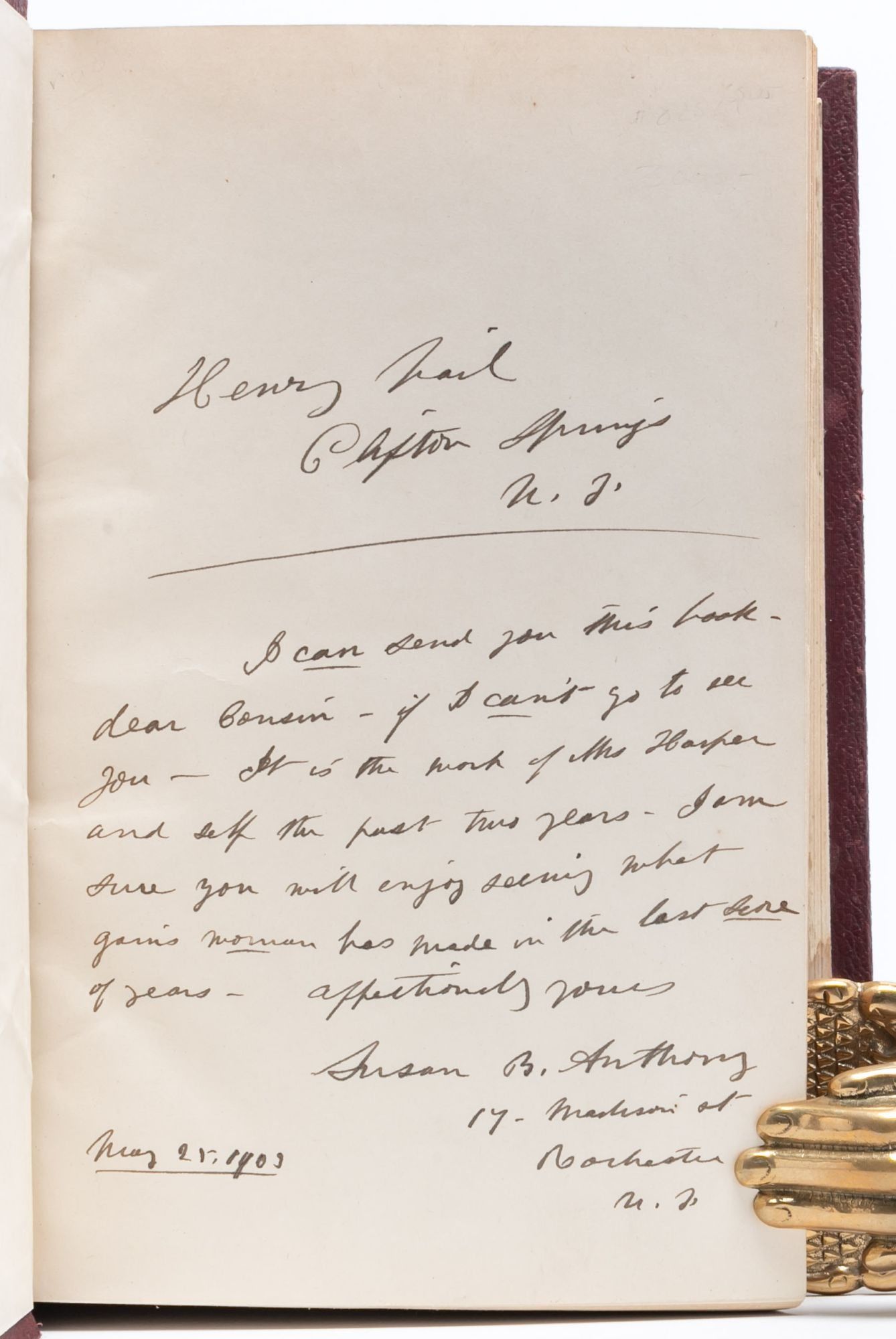 Rochester, New York: Susan B. Anthony, 1902. First edition. Very Good. First edition of volume four of Susan B. Anthony and Ida Husted Harper's monumental history of women's suffrage, inscribed by Anthony to her cousin Henry Vail on the front free endpaper: "I can send you this book - / dear Cousin - if I can't go to see / you - It is the work of Mrs. Harper / and self the past two years - I am / sure you will enjoy seeing what / gains woman has made in the last score / of years - affectionately yours / Susan B. Anthony / 17 Madison St / Rochester / NY / May 25, 1903." Publisher's maroon cloth titled in gilt. [li], 1144 pp., complete with eleven plates (including frontisportrait of Anthony). Slight edgewear, small chip to cloth on one board, and a bit of faint spotting. Minor toning to a couple leaves. Some dampstaining to fore-edge of text block, slightly encroaching on margins of the last hundred pages or so. Overall a Very Good, fresh copy.