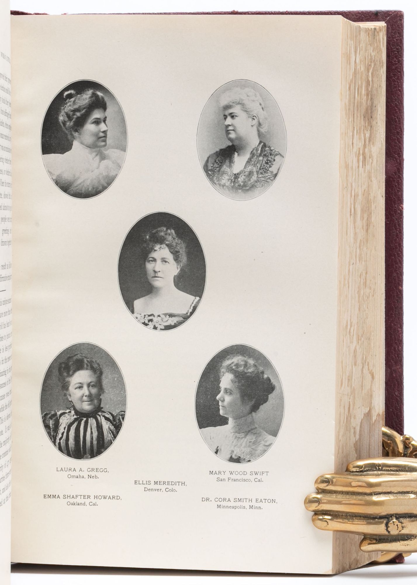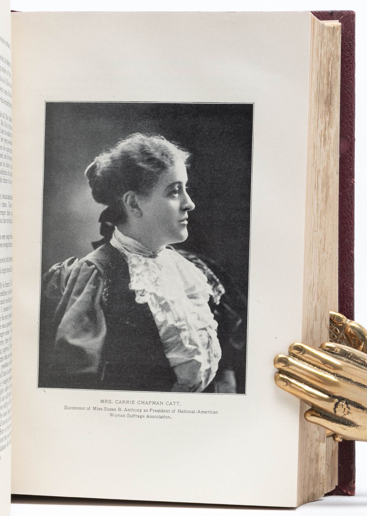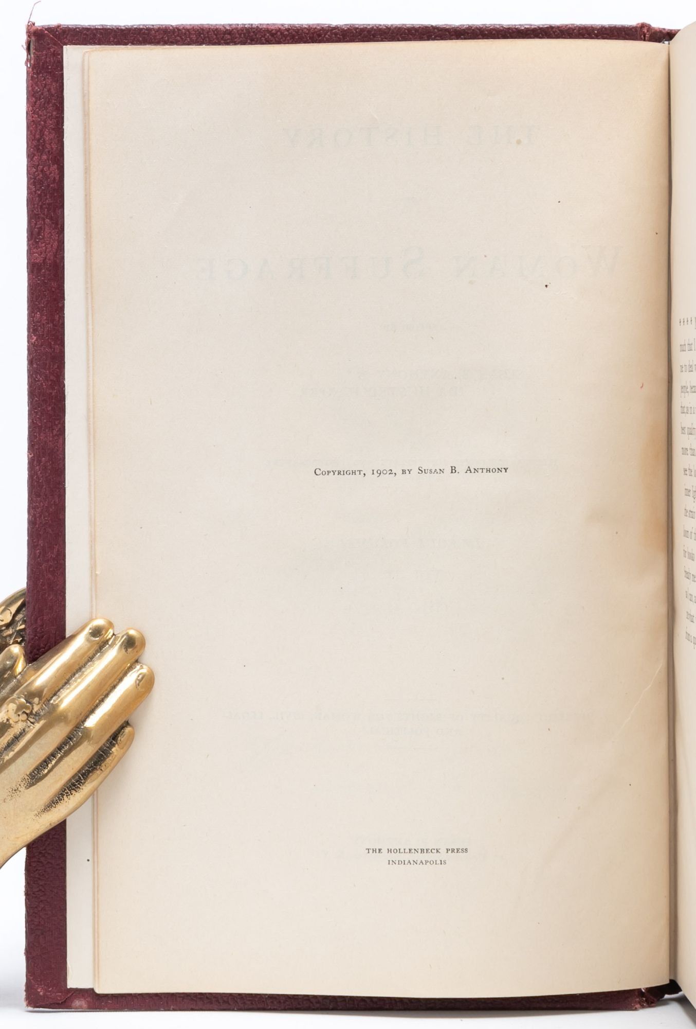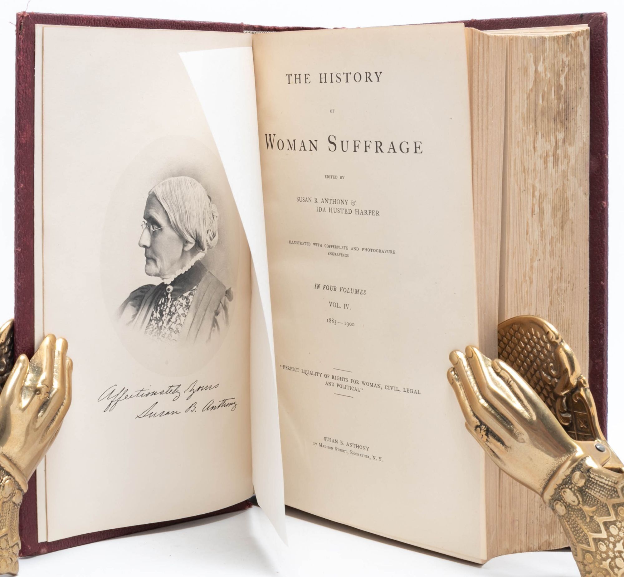 Rochester, New York: Susan B. Anthony, 1902. First edition. Very Good. First edition of volume four of Susan B. Anthony and Ida Husted Harper's monumental history of women's suffrage, inscribed by Anthony to her cousin Henry Vail on the front free endpaper: "I can send you this book - / dear Cousin - if I can't go to see / you - It is the work of Mrs. Harper / and self the past two years - I am / sure you will enjoy seeing what / gains woman has made in the last score / of years - affectionately yours / Susan B. Anthony / 17 Madison St / Rochester / NY / May 25, 1903." Publisher's maroon cloth titled in gilt. [li], 1144 pp., complete with eleven plates (including frontisportrait of Anthony). Slight edgewear, small chip to cloth on one board, and a bit of faint spotting. Minor toning to a couple leaves. Some dampstaining to fore-edge of text block, slightly encroaching on margins of the last hundred pages or so. Overall a Very Good, fresh copy.