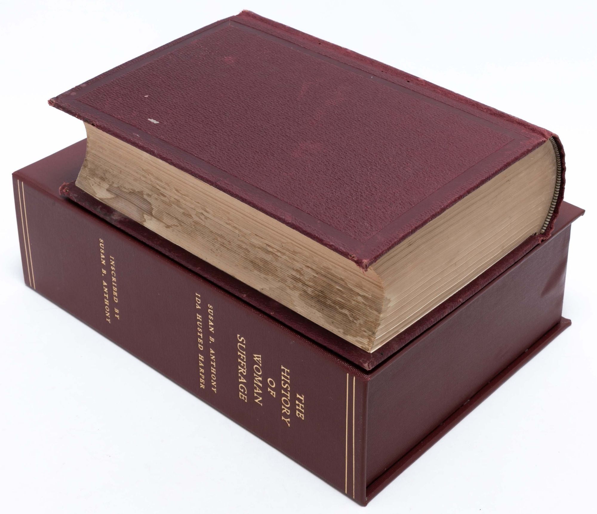 The History of Woman Suffrage eventually spanned six volumes published between 1881 and 1922, with Vol. IV being the last published during Anthony's lifetime (1820 - 1906). Spanning over 5,000 pages and drawing on primary sources from the National Woman Suffrage Association leaders and their archives, the work is still considered one of the most important accounts of this American equality movement. For Anthony, it was critical that women write themselves into United States history as well as leave a road map for future activists. To this end, when it became clear in 1885 that this comprehensive project would cost more money than it would raise, she purchased the rights to the contents and plates for Volumes I-II and published Volumes III-IV as sole owner (with her imprint appearing on the title-page of the present volume). The fifteen years that passed between the publication of Volume III (1887) and Volume IV had seen a massive and effective expansion of voting rights to women on the state level; and a federal law nicknamed the Susan B. Anthony Amendment had been proposed for ratification to extend voting rights to women at the national level. Anthony's inscription to her cousin references these huge gains made in women's rights, acknowledging the recent successes of the suffrage movement and anticipating the future victories that would continue after her death. The final two volumes of The History of Woman Suffrage were published under the direction of Ida Husted Harper and Anthony's protegee Matilda Gage. Very Good.