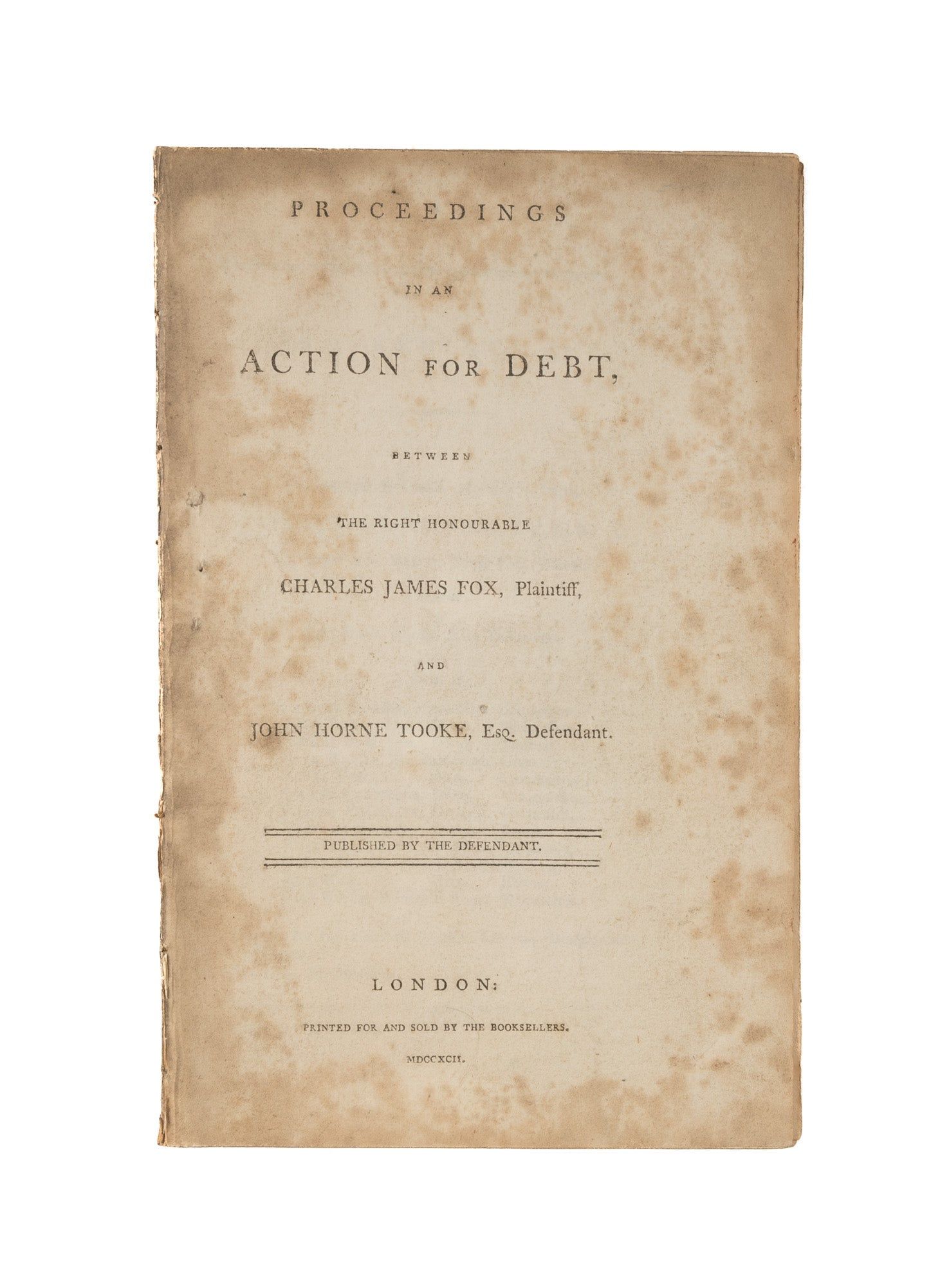 1792. An Important 1792 Trial Related to an Election From the Library of Anne Renier [Trial]. Tooke, John Horne [1736-1812], Defendant. Fox, Charles James [1749-1806], Plaintiff. Johnson, Joseph [1738-1809], Publisher. Proceedings in an Action for Debt, Between the Right Honorable Charles James Fox, Plaintiff, And John Horne Tooke, Esq. Defendant. Published by the Defendant. London: Printed for and Sold by the Booksellers, 1792. 39, [1] pp. Octavo (8-1/4" x 5-1/4"). Disbound stab-stitched pamphlet. Moderate toning, light foxing, light rubbing to extremities, final two leaves partially detached, owner name "Renier" to verso of title page, owner initials "AR" to verso of final leaf. $250. * First edition, one of two issues from 1792. This was a legally and politically important trial. Tooke, one of the great English radicals of the period, opposed Fox in the Westminster elections of 1790. Defeated by a large majority, he petitioned the House of Commons for redress based on allegations of riotous conduct by the electors. The action was declared frivolous and Tooke was sued by Fox for ?198 damage. To make matters worse, under the 1789 law against vexatious suits, Tooke was held liable as well for costs. The trial, heard before Lord Kenyon, gave Tooke a platform from which he condemned Parliamentary corruption and spoke eloquently against the severe limitations imposed upon juries in this and other trials of a similar nature--from a legal point of view perhaps the most interesting feature of the trial. Counsel for Fox was Thomas Erskine. Despite its topicality, this pamphlet had an unusually long history; it was re-issued in 1793, 1812, 1815 and 1819. This copy belonged to Anne Renier [1911?-1988]. She and her husband, Fernand Gabriel Renier [1905-1988], were important collectors of popular books, pamphlets and ephemera. English Short-Title Catalogue N11983.