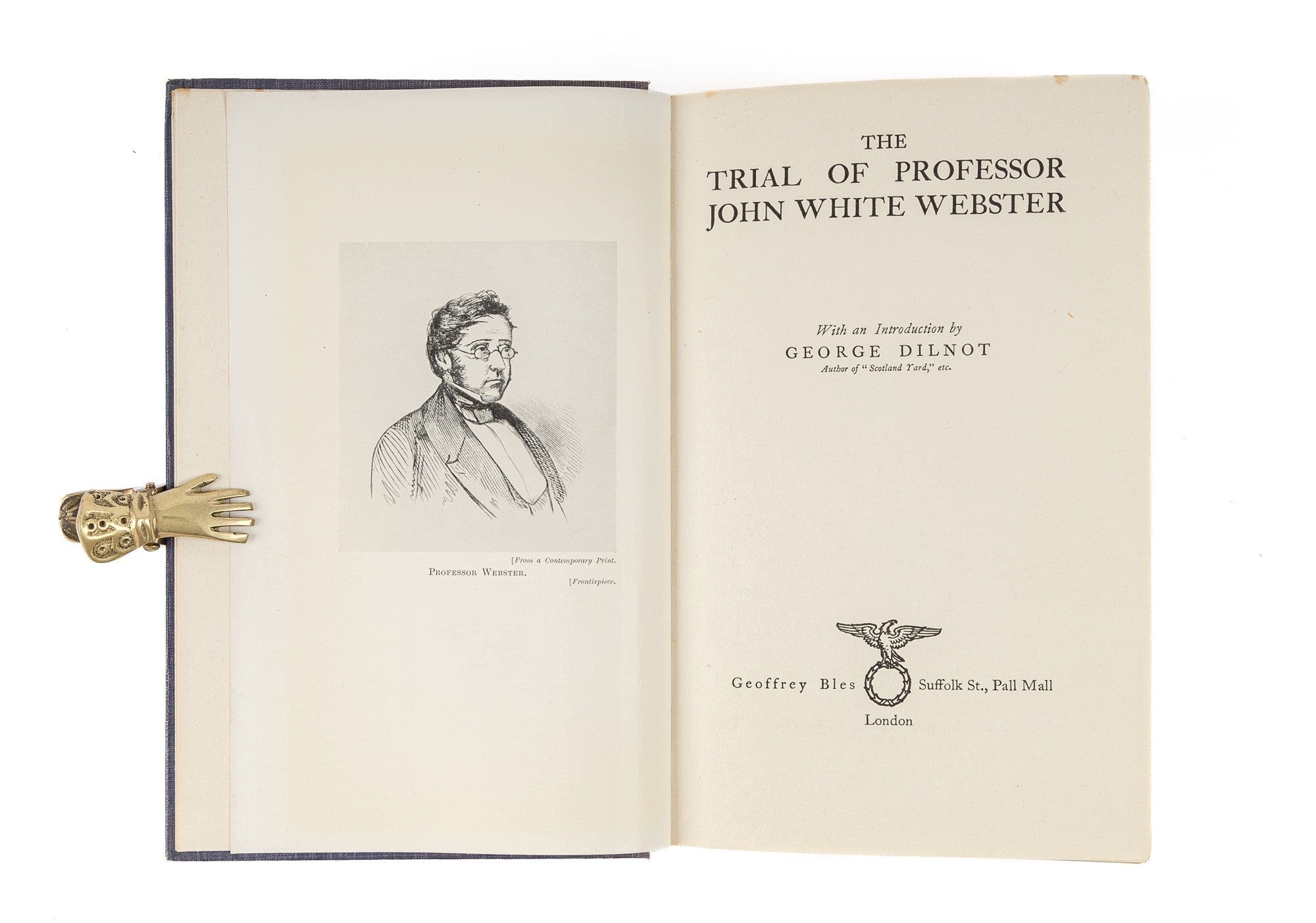 1928. [Webster, John White]. Dilnot, George. The Trial of Professor of John White Webster. With an Introduction by George Dilnot. Author of "Scotland Yard," etc. New York: Charles Scribner's Sons, 1928. Illustrated. viii, 275 pp. Famous Trials Series. Original cloth. Moderate shelfwear with some rubbing and sunning to spine. Internally clean. $15. * First edition. The most famous medico-legal murder trial of the 19th century on which a conviction was gained based upon circumstantial evidence. Indeed for many years "the trial of Professor Webster remained a leading case on the value of circumstantial evidence." Marke 1008.
