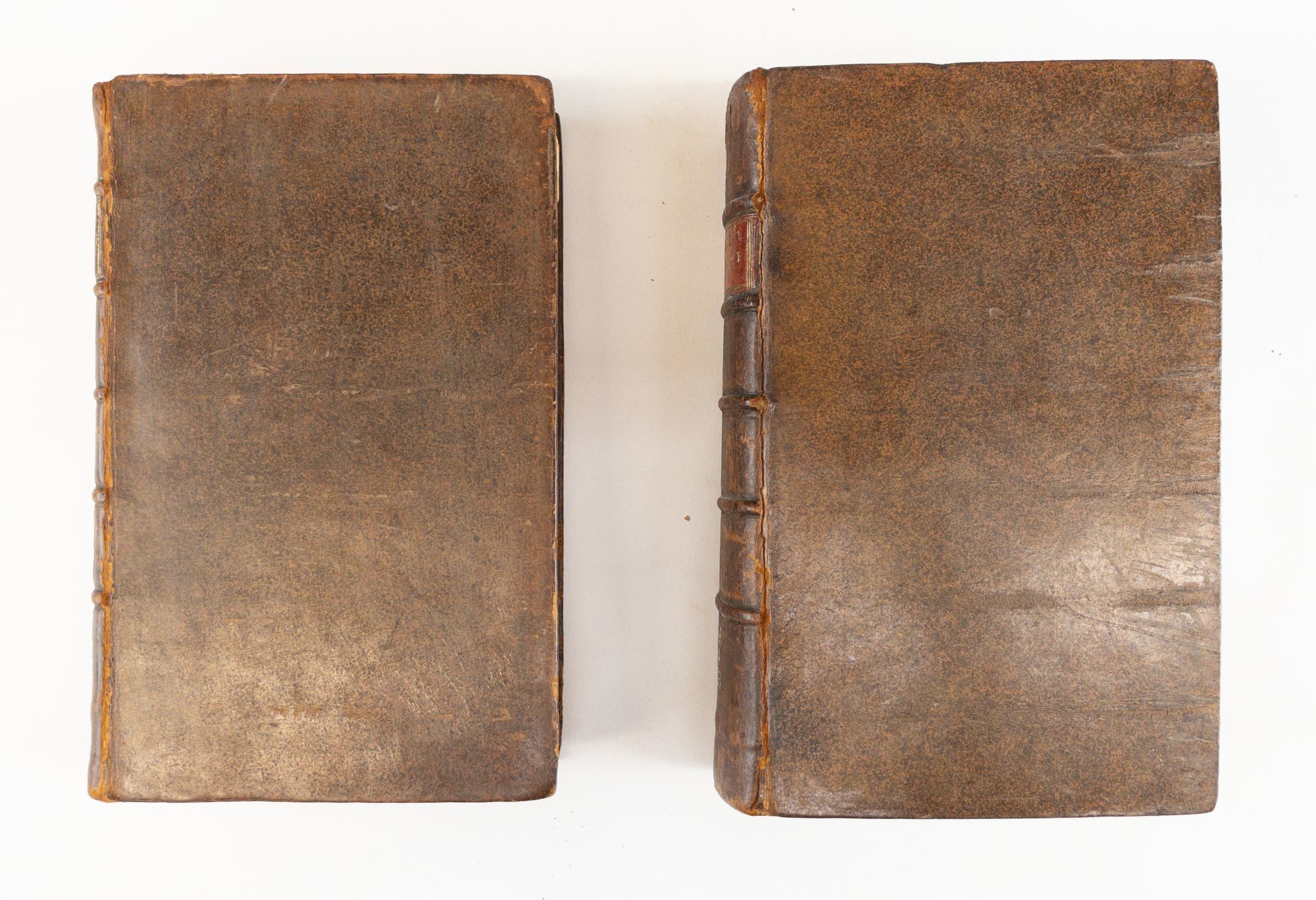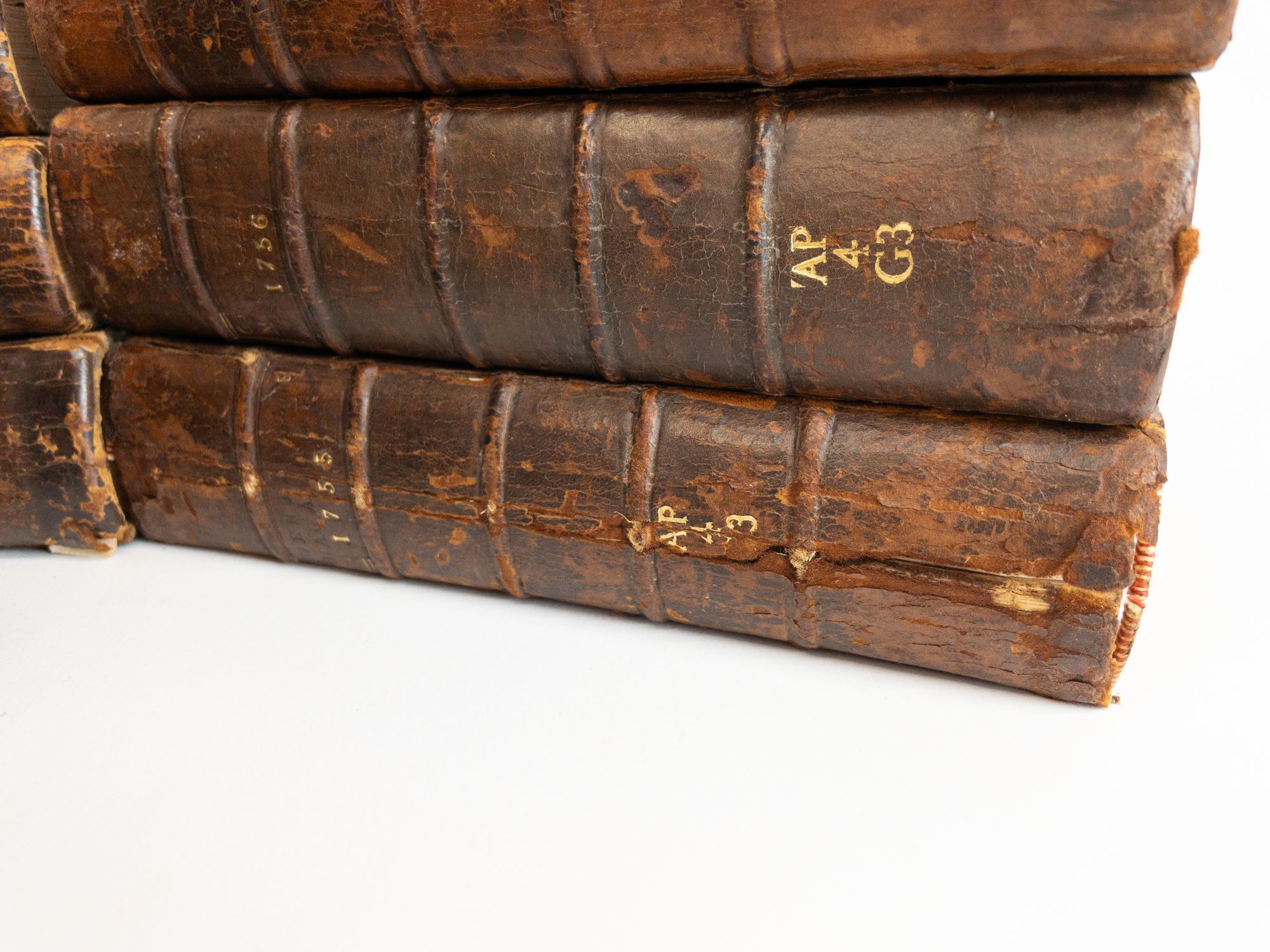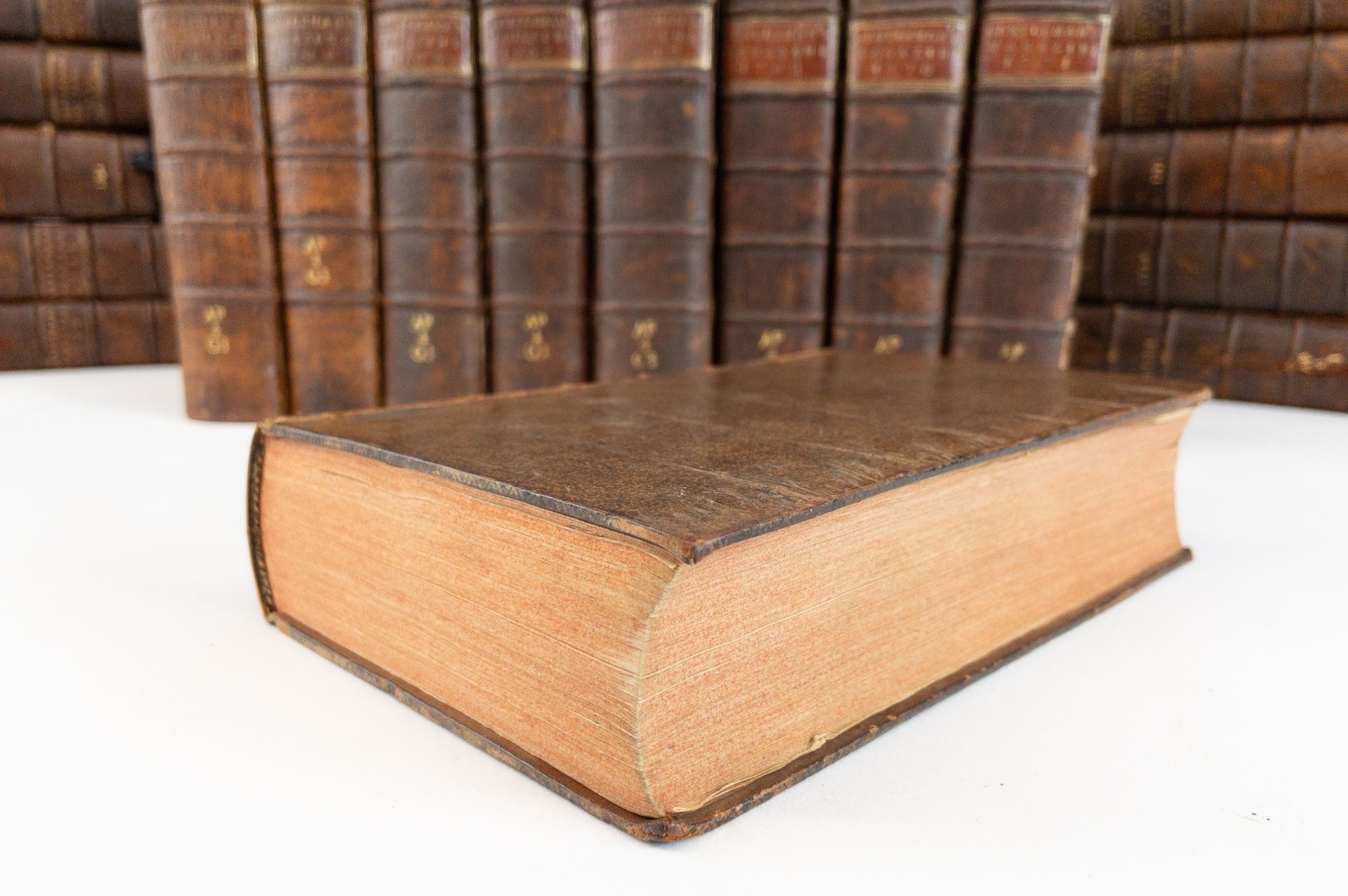 London, 1731-1772. First Edition. Hardcover. Octavos, forty-two volumes. Volumes in Fair to Very Good minus condition; majority of volumes either Good minus or Good. Bound in full brown speckled calf with red leather labels bearing gilt text to spines; thirteen volumes now lacking spine labels, and five with loss of significant portion of label. Two volumes with one board detached but present; additional volumes with loose boards, significant cracking to joints and spines, etc. Multiple volumes with tightly trimmed margins, resulting in minor loss of text near margins; in several instances, an earlier reader has excised columns of text or portions of columns. Most volumes lacking some plates and maps. Light plus age toning and scattered foxing to text blocks. Ink library stamp and personal bookplate to front pastedown of each volume; Folger bookplate and deaccession stamp to rear pastedown of each volume. A volume-by-volume inventory with notes on plates and general condition can be found HERE.
