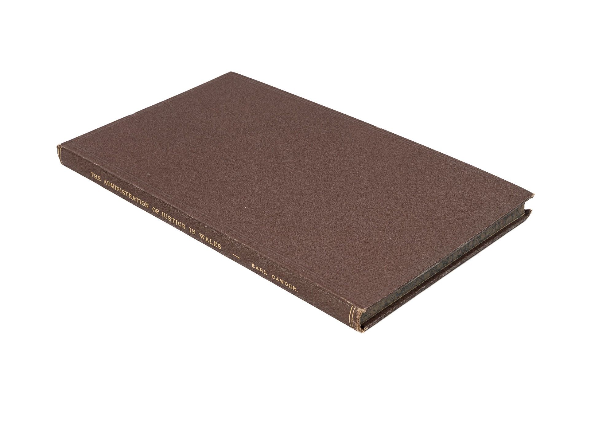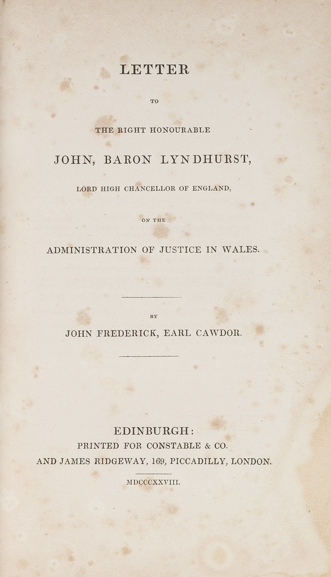 1828. Cawdor, John Frederick. Letter to the Right Honourable John, Baron Lyndhurst, Lord High Chancellor of England, on the Administration of Justice in Wales. Edinburgh: Printed for Constable & Co. and J. Ridgeway, 1828. 78, 17 pp. Modern maroon boards with gilt stamped spine. Marbled page edges, foxing to textblock, else very good. $250. * This book was written during a period of rising pressure to reform or abolish the court system of Wales, a movement known as the Anglo-Welsh legal reform. The letter addresses John Copley, 1st Baron Lyndhurst, who served as Lord High Chancellor of Great Britain during this period and had been appointed Chief Justice of Chester for Wales in 1818.