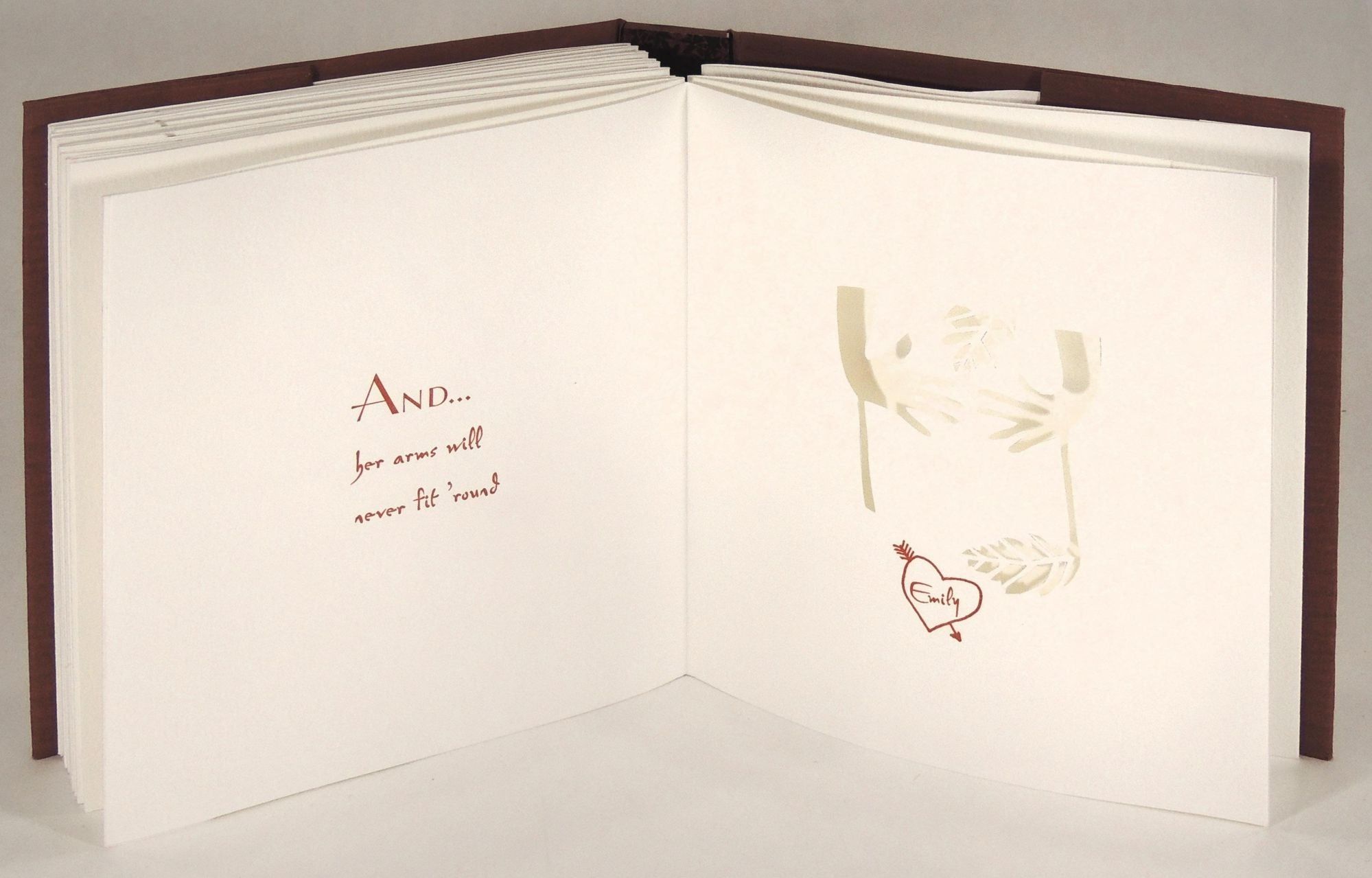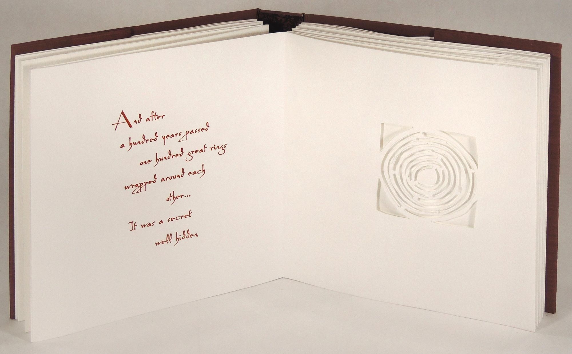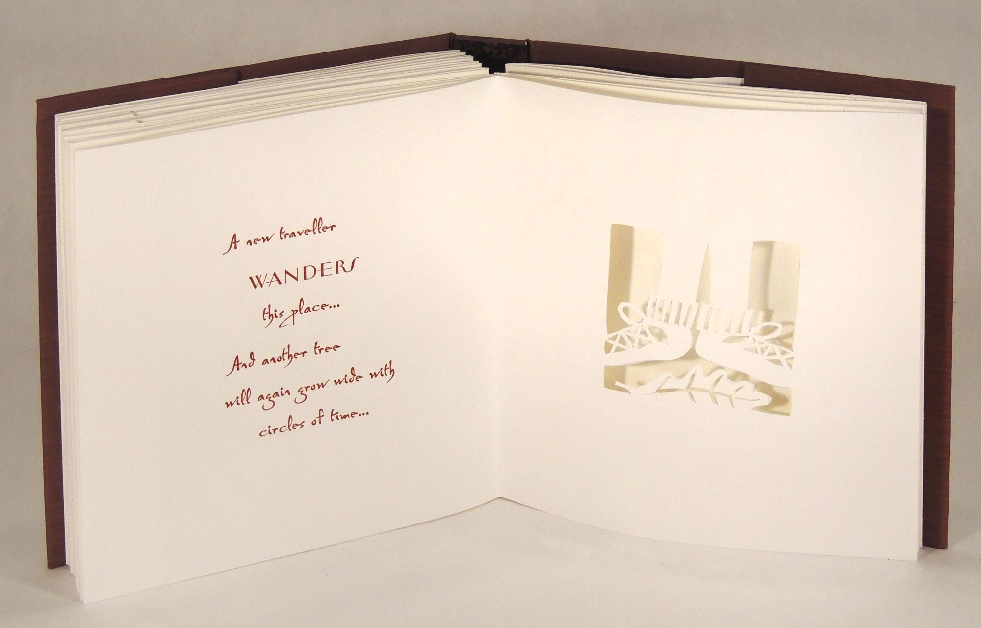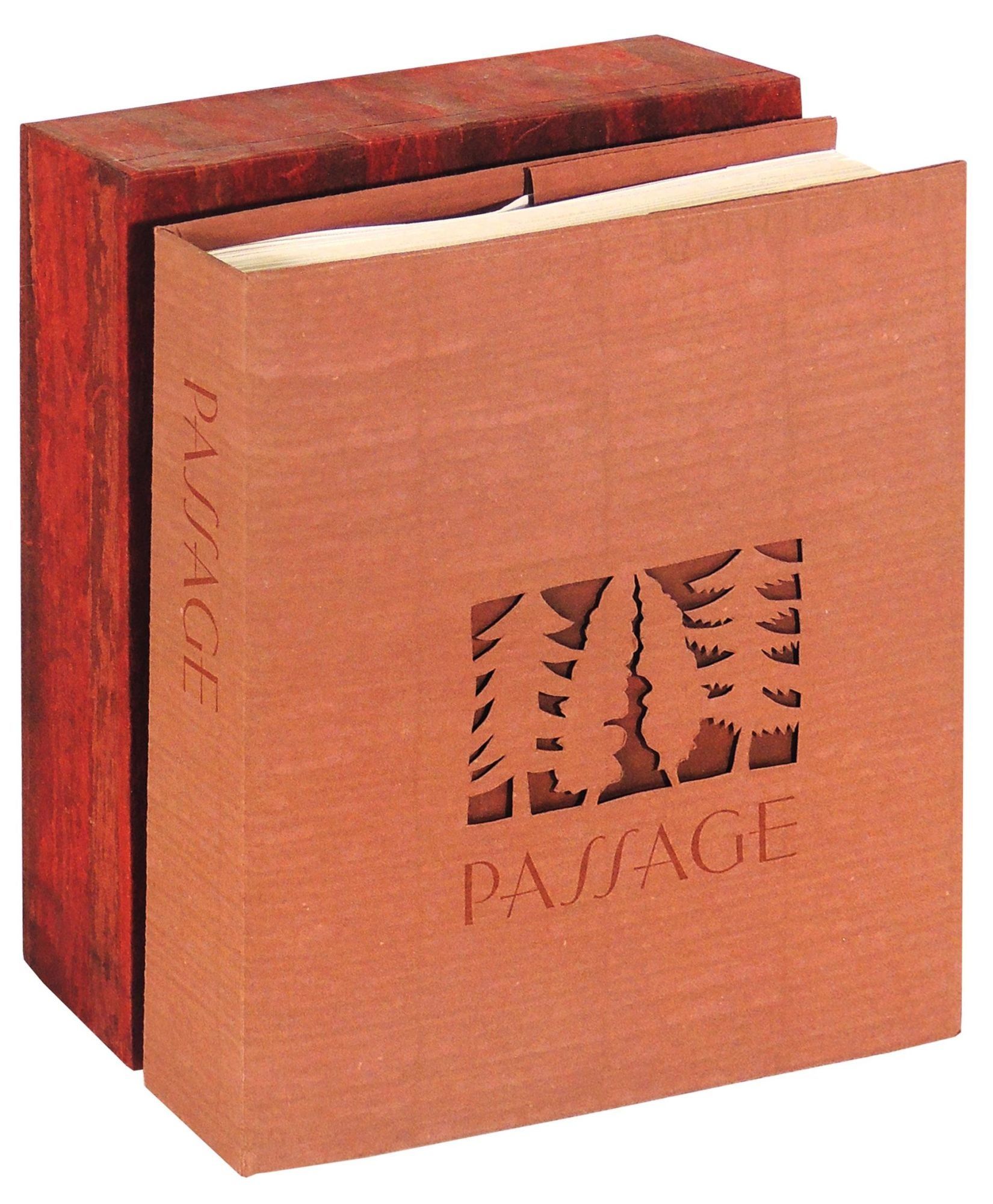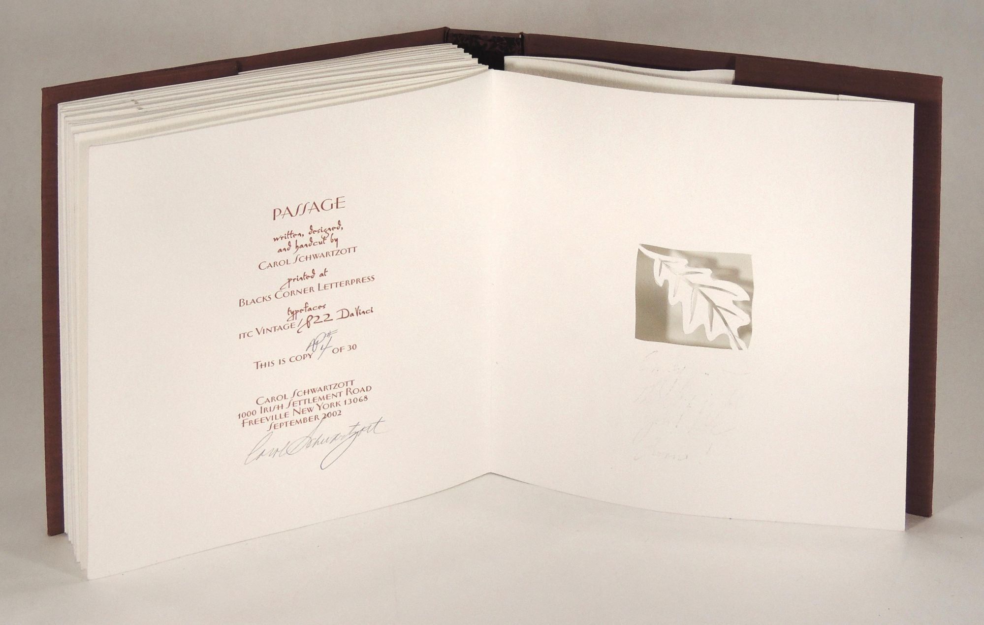 Freeville, NY: Carol Schwartzott, 2002. Hardcover. Fine. Hardcover. AP#4 of 30 copies, signed and numbered by this noted book artist. Carol Schwartzott has been creating artists' books for over twenty-five years. Her work appears in many museums, libraries, and private collections including the Smithsonian, the National Gallery of Art, and the Victoria and Albert Museum. Carol created this evocative book to celebrate nature and the seasons, and the creatures that inhabit the worlds that they create. An excerpt from the text: "A narrow path appeared. It led into deep green...worn true as creatures travelled in time and nature preparing for seasonal change." Passage is a letterpress printed book with an accordion fold structure. There are fourteen intricate, hand-cut illustrations are featured on the right-hand pages of each two-fold spread cut on beautiful textured white paper. The cover is made of brown Fabriano Roma paper folded over boards with a letterpress title and cut away designs. The text is set in ITC Vintage/P22 Da Vinci typefaces, and the book is housed in a red hand-dyed Thai paper slipcase. A beautiful production in fine condition. Measures 6.5 x 7 x 1 inches. Unpaginated. ARTB/120424.