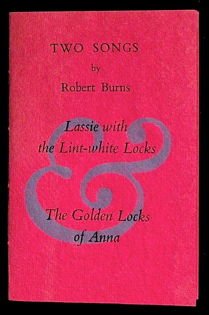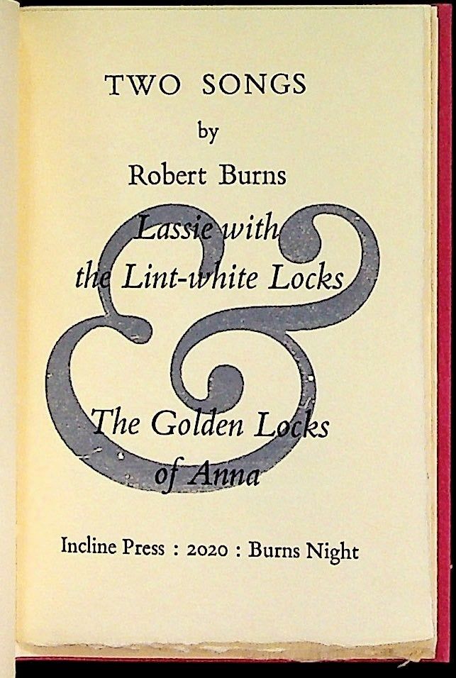 Oldham, England: Incline Press, 2020. Softcover. Fine. Softcover. Number 11 of about 100 copies. This chapbook was printed in honor of Burns Night. In his introduction, the printer Graham Moss, writes that "for all his poetry, it ought to be his songs that Robert Burns be best remembered for." Bound in red handmade paper with the title and titles of songs printed on the front cover. Also on the cover is a handsome ampersand cut in wood by Mark McKellier for use in this chapbook. Its design is based on the Dutch typefaces that became the models for Caslon. The text is set in Monotype Bembo. A charming book in fine condition. PRI/120424.