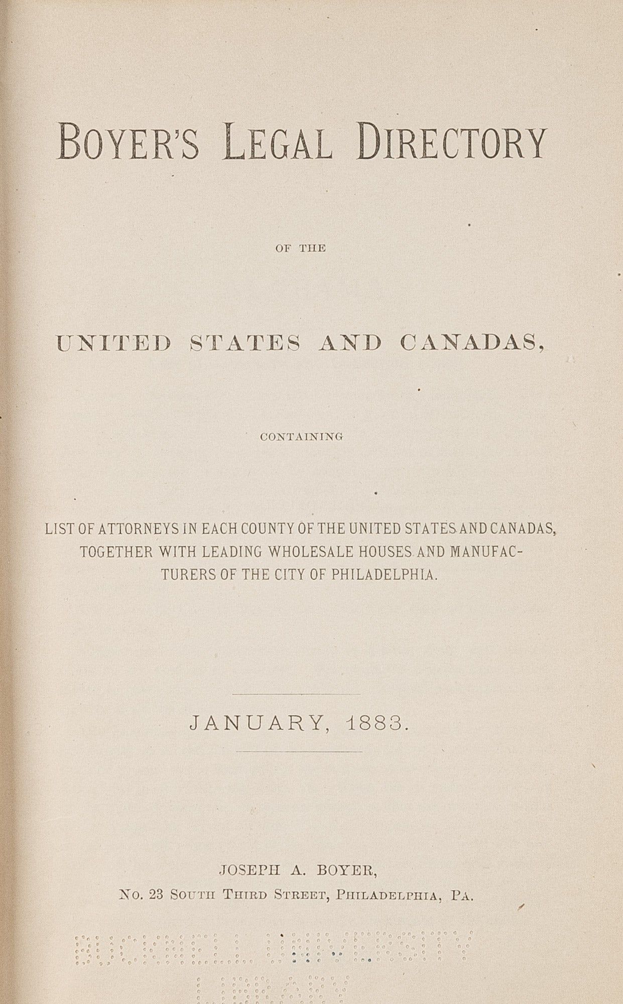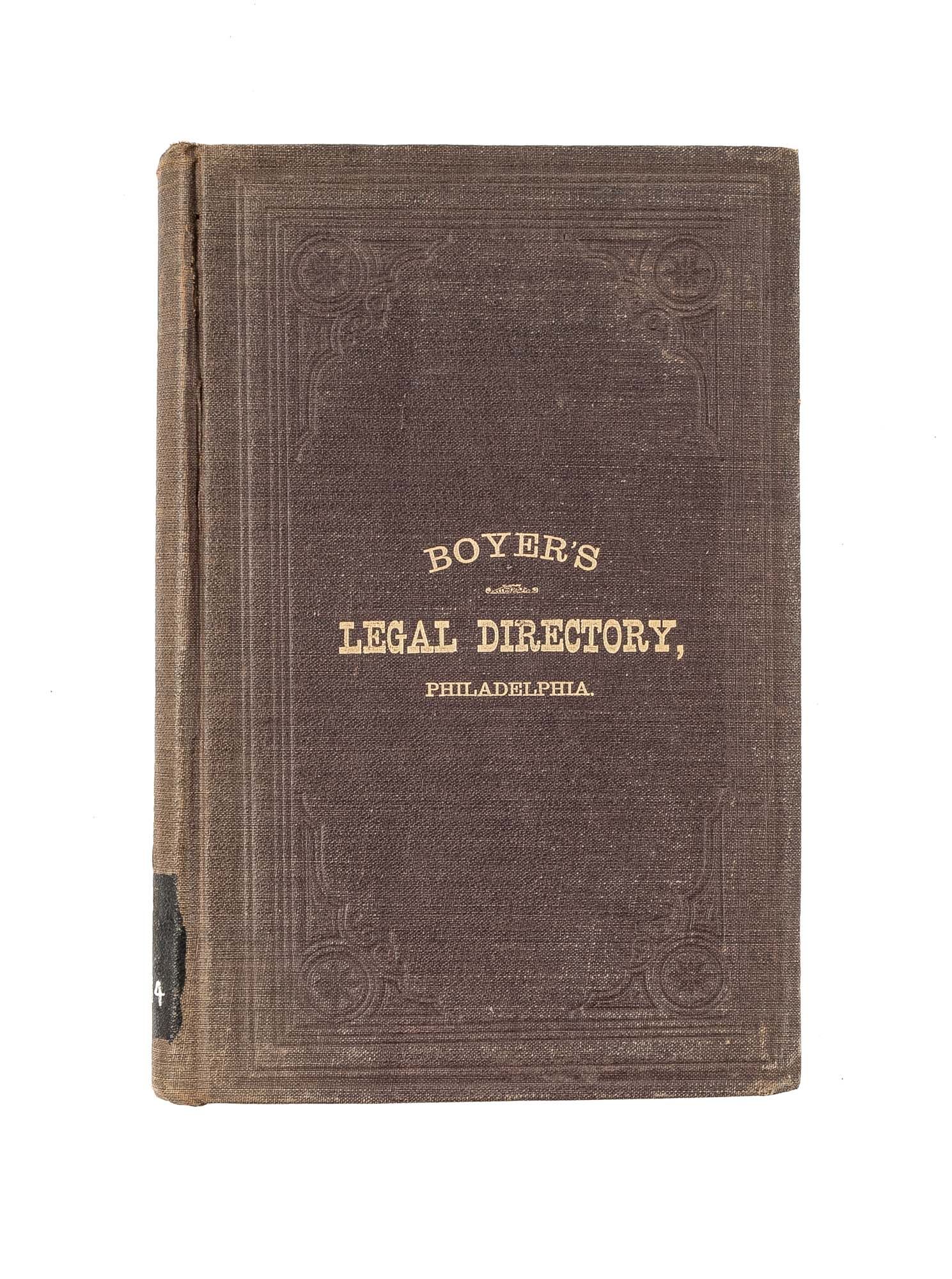 1883. Philadelphia: Joseph A. Boyer, 1883.. Philadelphia: Joseph A. Boyer, 1883. Boyer, Joseph A. Boyer's Legal Directory: Of the United States and Canadas, Containing: List of Attorneys in Each County of the United States and Canadas, Together with Leading Wholesale Houses and Manufacturers of the City of Philadelphia. Philadelphia: Joseph A. Boyer, 1883. 389 pp. Publisher's cloth, with gilt stamped spine and front cover. Moderate shelfwear to spine ends, boards heavily rubbed with stains to rear cover. Hinges cracking but secure. Ex-library, with stamps to spine, front pastedown, perforated stamp to title. $125. * Contains a list of attorneys for every county in the United States and Canada. It included a digest of the collection laws for each U.S. state and territory, as well as for the provinces of Ontario and Quebec. Contains a list of prominent wholesale businesses and manufacturers located in Philadelphia. Later editions expanded to include businesses in other major cities like New York, Baltimore, and Chicago. The book was intended for businesses, such as manufacturers and wholesalers, who needed to find attorneys for matters like debt collection.