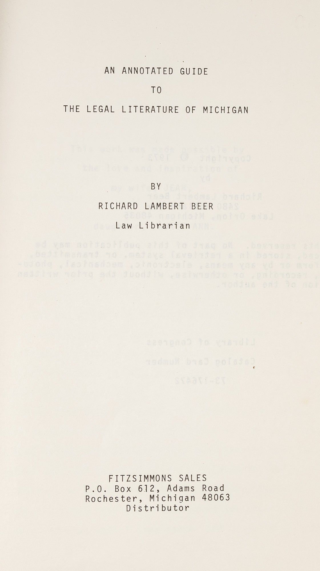 1973. Beer, Richard L. An Annotated Guide to the Legal Literature of Michigan. Rochester, [MI]: Fitzsimmons Sales, [1973]. xvi, 142 pp. Softcover. Light shelfwear and soiling. Internally clean. A very good copy. $20. * Provides an annotated bibliography of legal materials relevant to Michigan for students and practitioners needing to conduct legal research within the state.