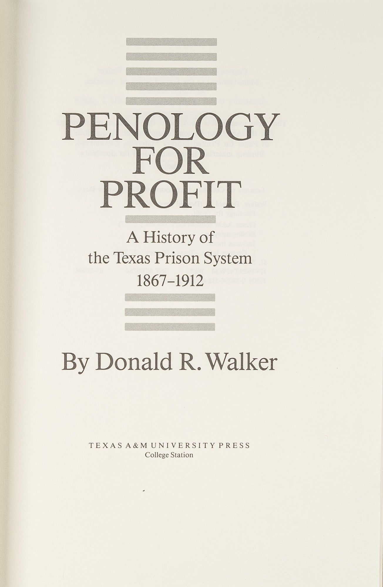 1988. Texas A & M University Press, [1988].. Texas A & M University Press, [1988]. Walker, Donald R. Penology for Profit: A History of the Texas Prison System, 1867-1912. College Station, [TX]: Texas A & M University Press, [1988]. 216 pp. Hardcover in a near-fine, lightly soiled dust jacket. Internally clean. $20. * Contents: Background to Leasing: The Early Years of the Texas Penitentiary; Early Failures, 1867-1878; The Successful Lease, 1878-1883; The State as Lessor, 1883-1912; The Prisoner's Lot; The Powers That Were: Leadership of the Prison System; The End of Leasing; The Texas Experience in Perspective.