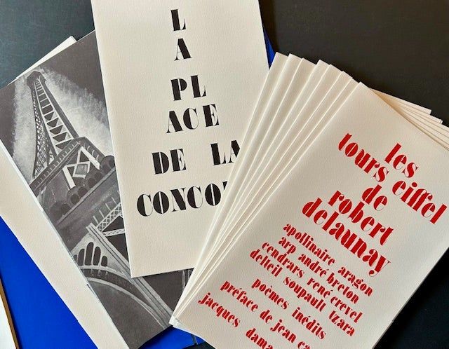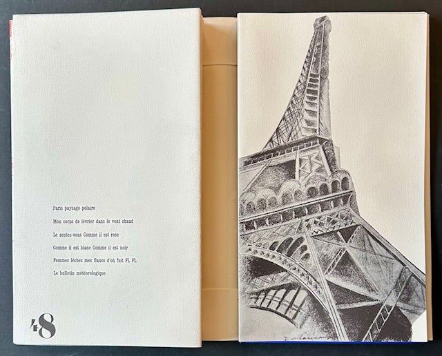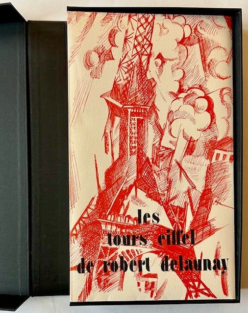 Brussels: Jacques Damase Gallery, 1974. Loose signatures. Near Fine. The wonderful 1974 collective edition, published by the Jaques Damase Gallery of Brussels. With lavish illustrations by the great French artist Robert Delaunay (1885-1941), inspired by his interpretations of the Eiffel Tower. Including accompanying verse by Apollinaire, Aragon, Arp, Andre Breton, Cendrars, Rene Crevel, Delteil, Souplault and Tristan Tzara, with the Peface by Jean Cassou. #12 OF ONLY 150 COPIES (within the larger limitation of 1,150 copies) WHICH INCLUDE A BROWN INTAGLIO ETCHING BY ROBERT DELAUNAY, SIGNED IN PENCIL BY HIS WIDOW SONIA DELAUNAY. Loose sheets (as issued), in bright, Near Fine to Fine condition. All contained within an elegant pictorial chemise and the publisher's handsome, decorative dark box.