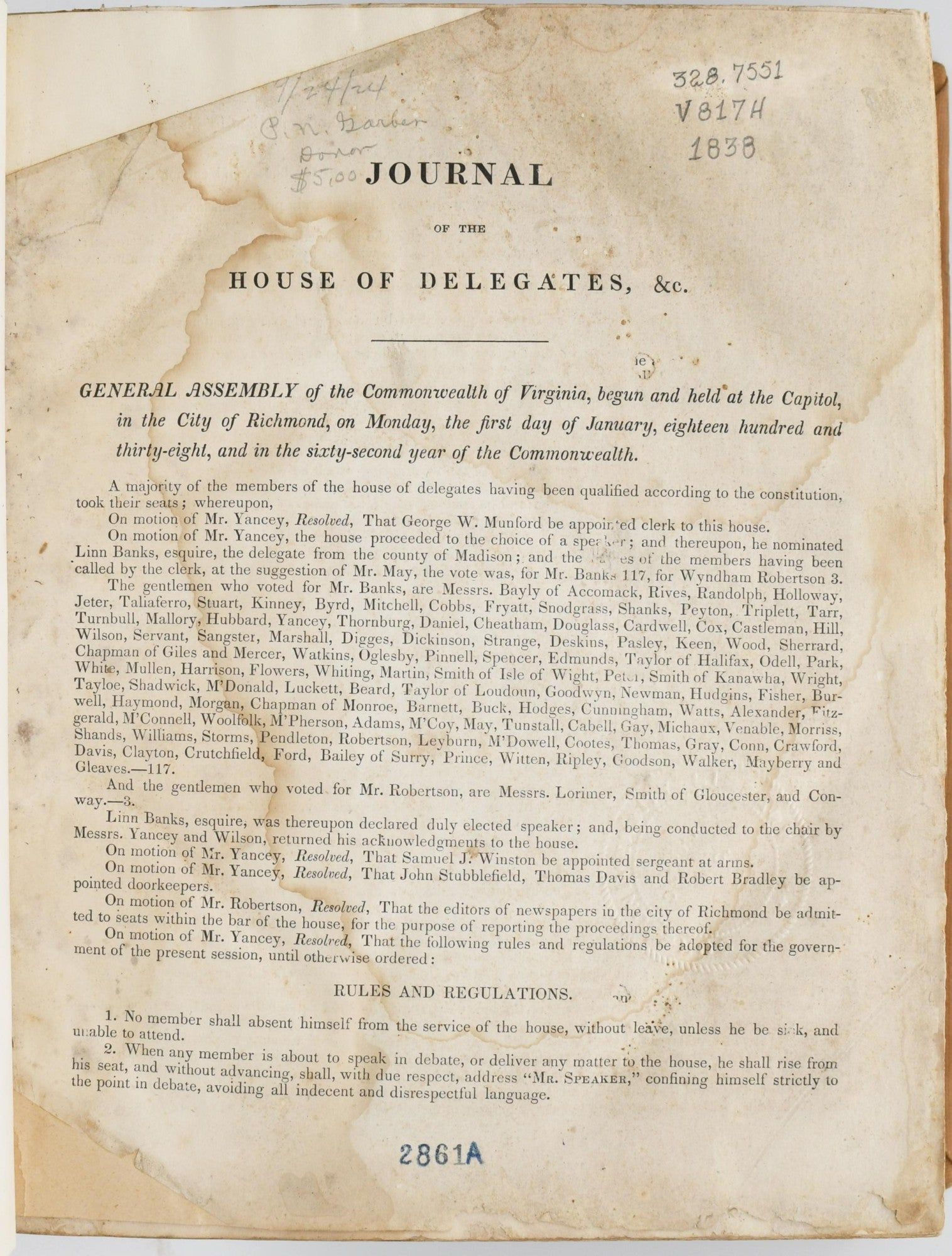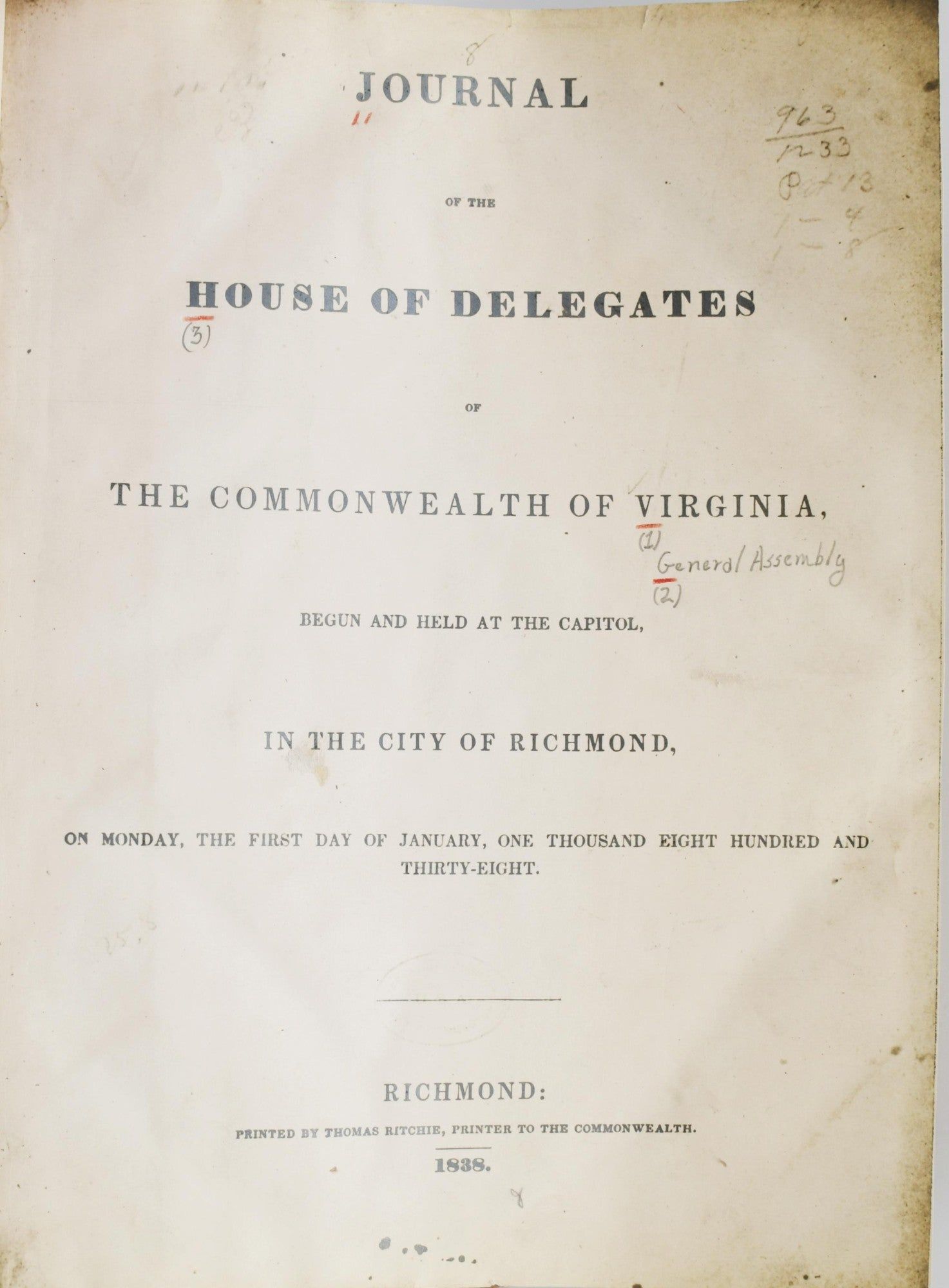 [LAW] JOURNAL OF THE HOUSE OF DELEGATES OF THE COMMONWEALTH OF VIRGINIA, BEGUN AND HELD AT THE CAPITOL IN THE CITY OF RICHMOND, ON MONDAY THE FIRST DAY OF JANUARY, ONE THOUSAND EIGHT HUNDRED AND THIRTY-EIGHT