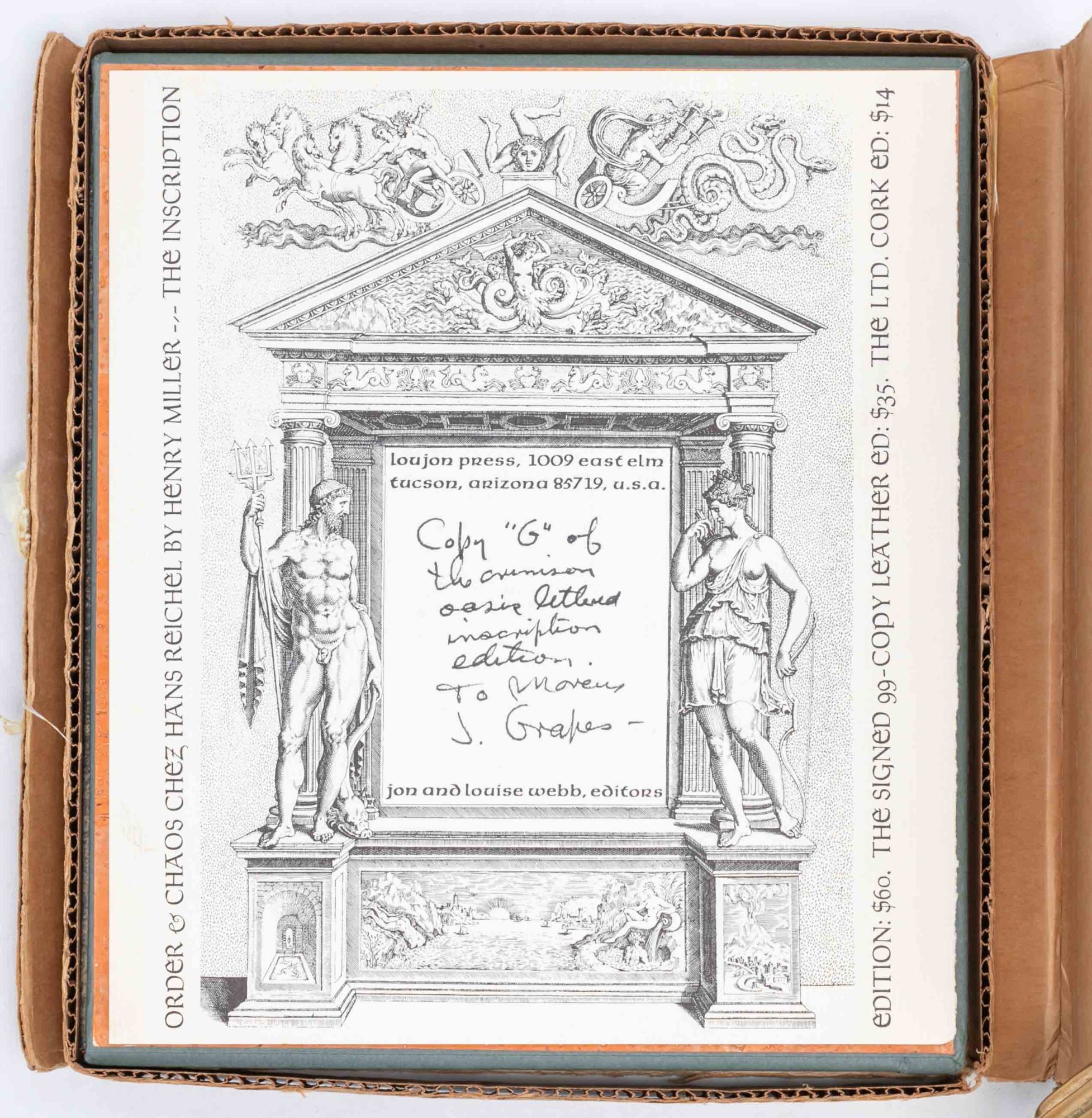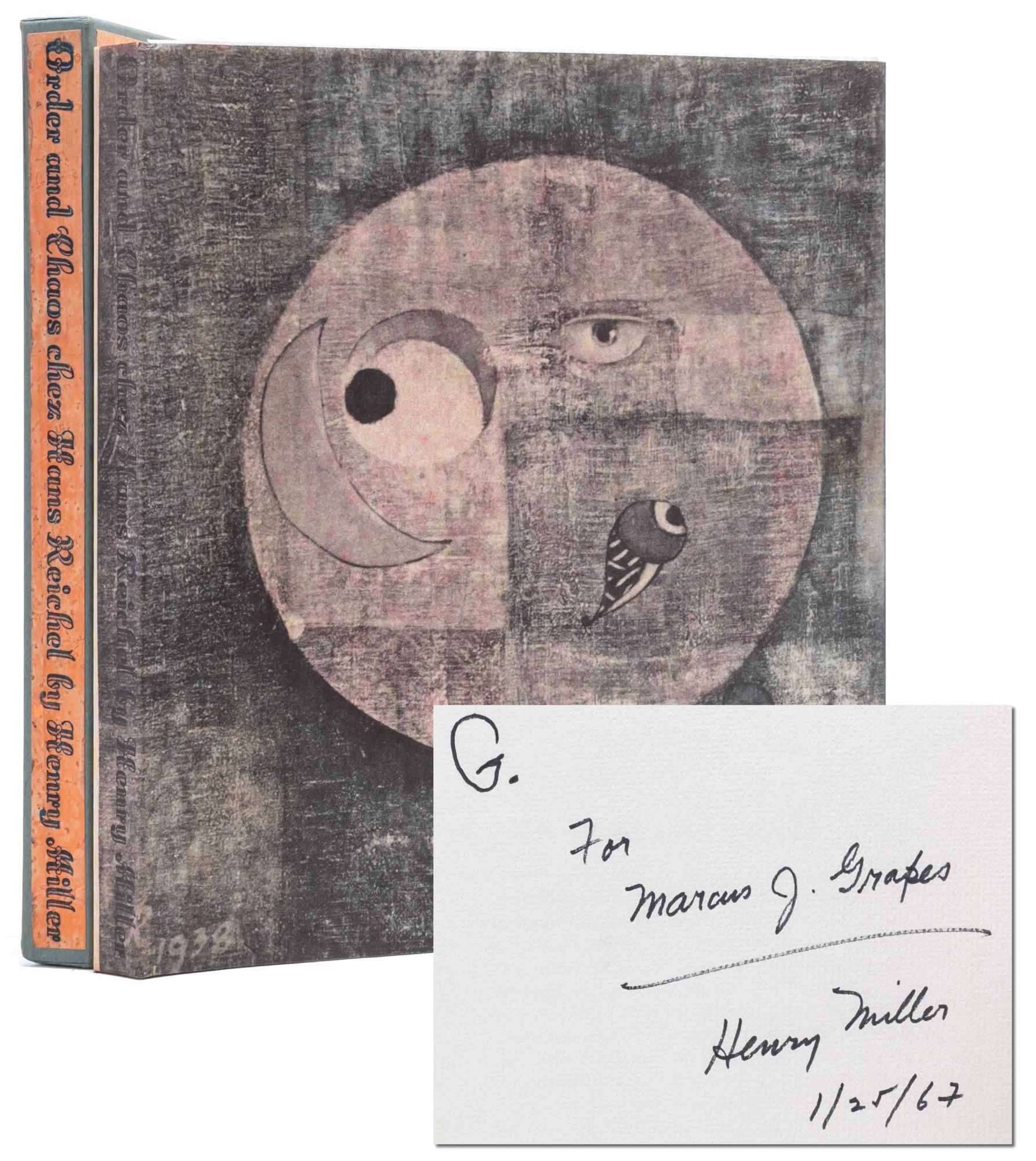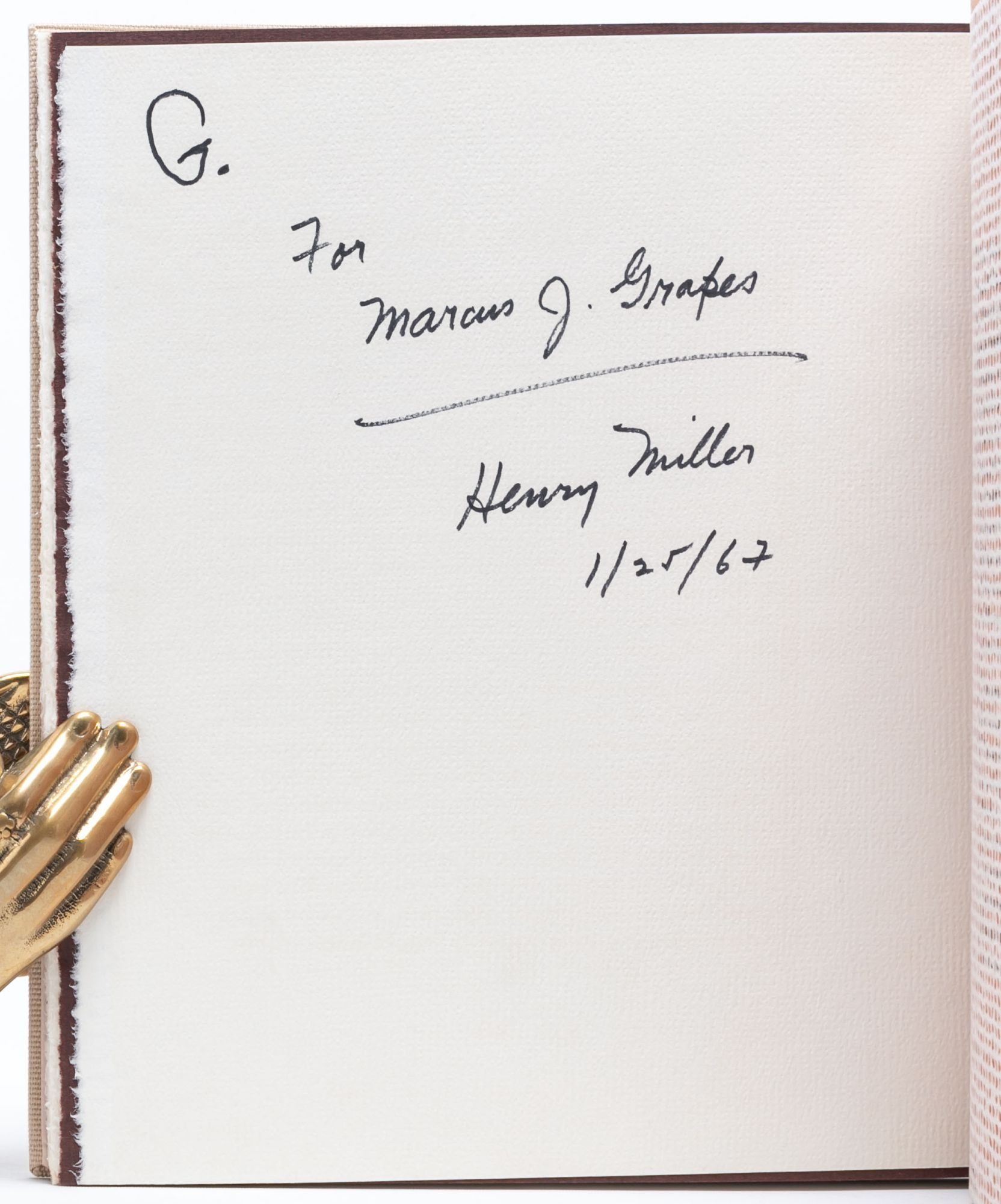 Tucson: Loujon Press, 1966. First edition. Fine/Very Good +. One of 26 copies in the "A to Z Leather Inscription Edition" inscribed by Henry Miller to the poet Jack Grapes (this being copy G). The inscribed copies were the most limited in a total edition of 1,524 (which also included 99 signed copies). Beautifully bound in half crimson morocco by the Schuberth Bookbindery in San Francisco. This is a lovely, quirky production designed, edited, and letterpress printed by Loujon Press editors Louisa and Jon Webb in Tucson, Arizona (on "Loujon's ancient 8 x 12 C&P Letterpress"). 87 pp., plus illustrations. A Fine copy in the Very Good+ dustjacket (some offsetting to inside of jacket and small tear to lower corner of back panel) and Fine publisher's slipcase with the Loujon Press prospectus (with a handwritten note from the press) and the original shipping box.