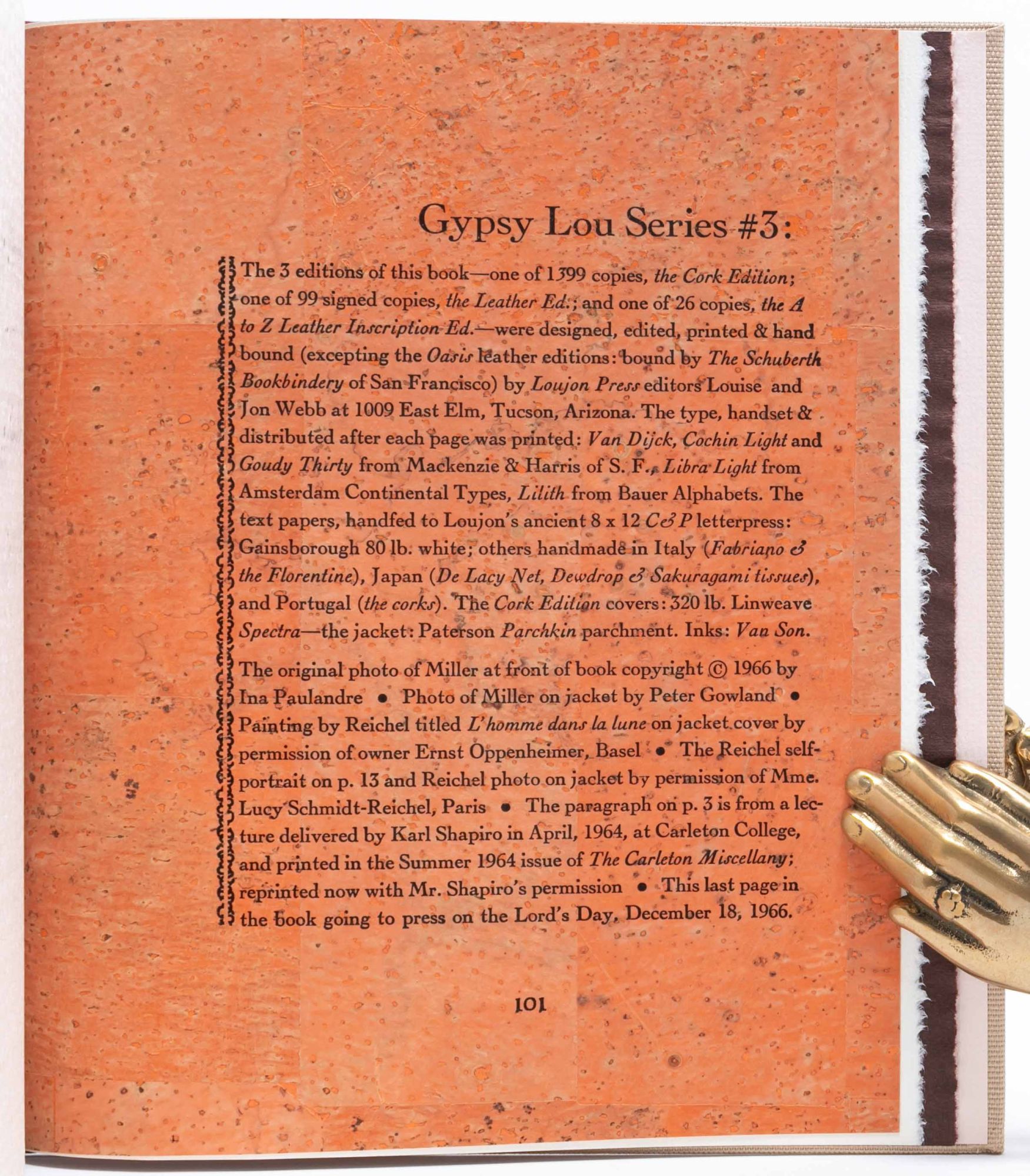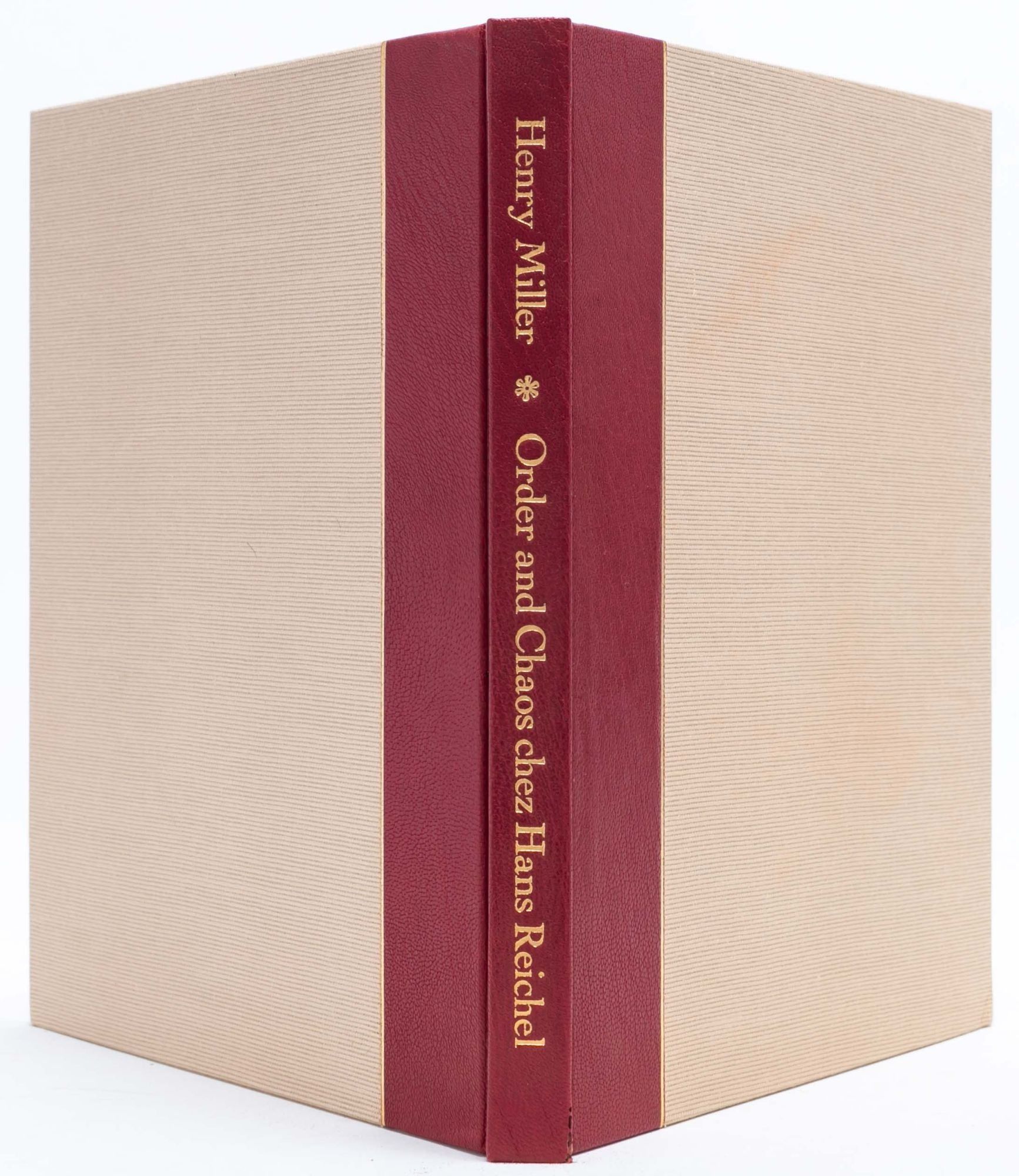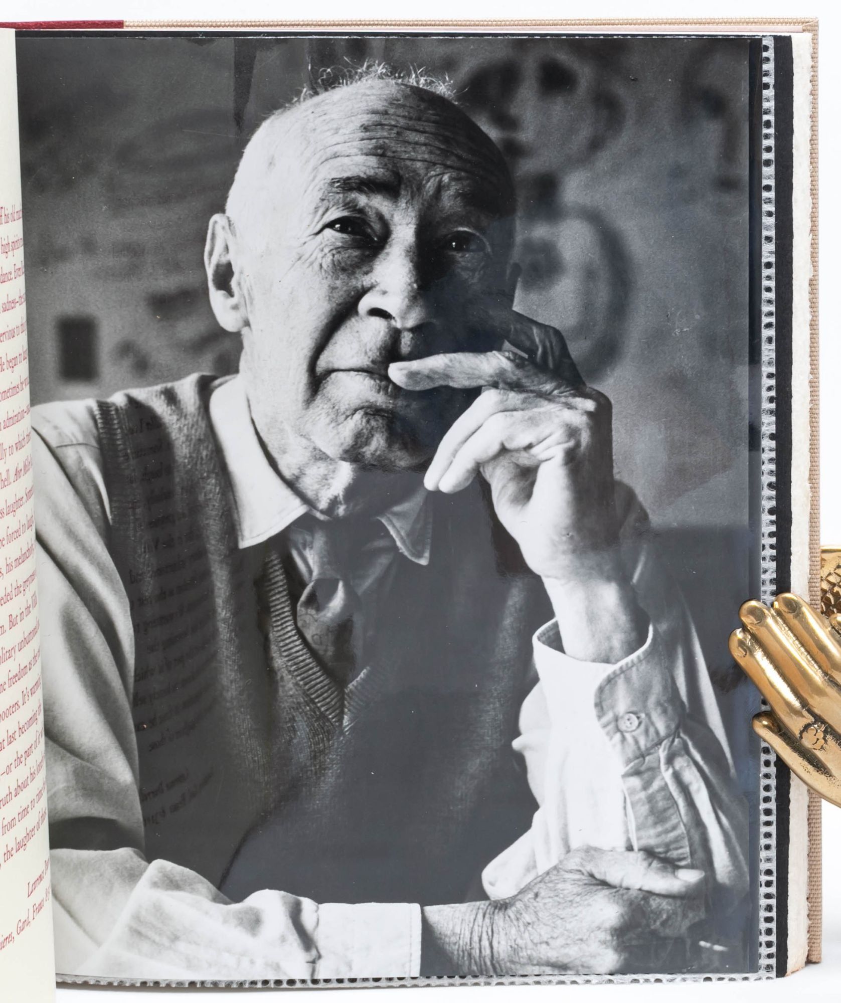 Tucson: Loujon Press, 1966. First edition. Fine/Very Good +. One of 26 copies in the "A to Z Leather Inscription Edition" inscribed by Henry Miller to the poet Jack Grapes (this being copy G). The inscribed copies were the most limited in a total edition of 1,524 (which also included 99 signed copies). Beautifully bound in half crimson morocco by the Schuberth Bookbindery in San Francisco. This is a lovely, quirky production designed, edited, and letterpress printed by Loujon Press editors Louisa and Jon Webb in Tucson, Arizona (on "Loujon's ancient 8 x 12 C&P Letterpress"). 87 pp., plus illustrations. A Fine copy in the Very Good+ dustjacket (some offsetting to inside of jacket and small tear to lower corner of back panel) and Fine publisher's slipcase with the Loujon Press prospectus (with a handwritten note from the press) and the original shipping box.