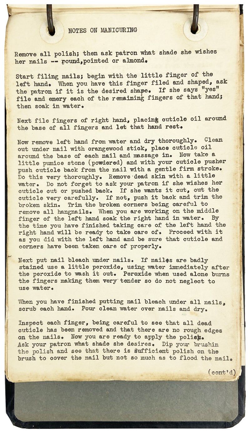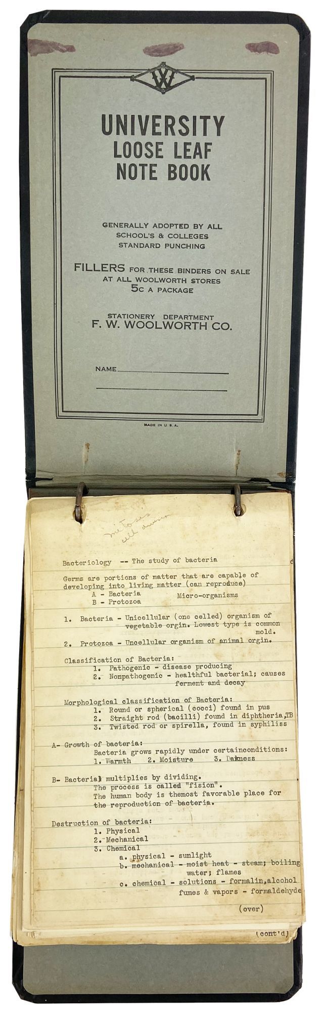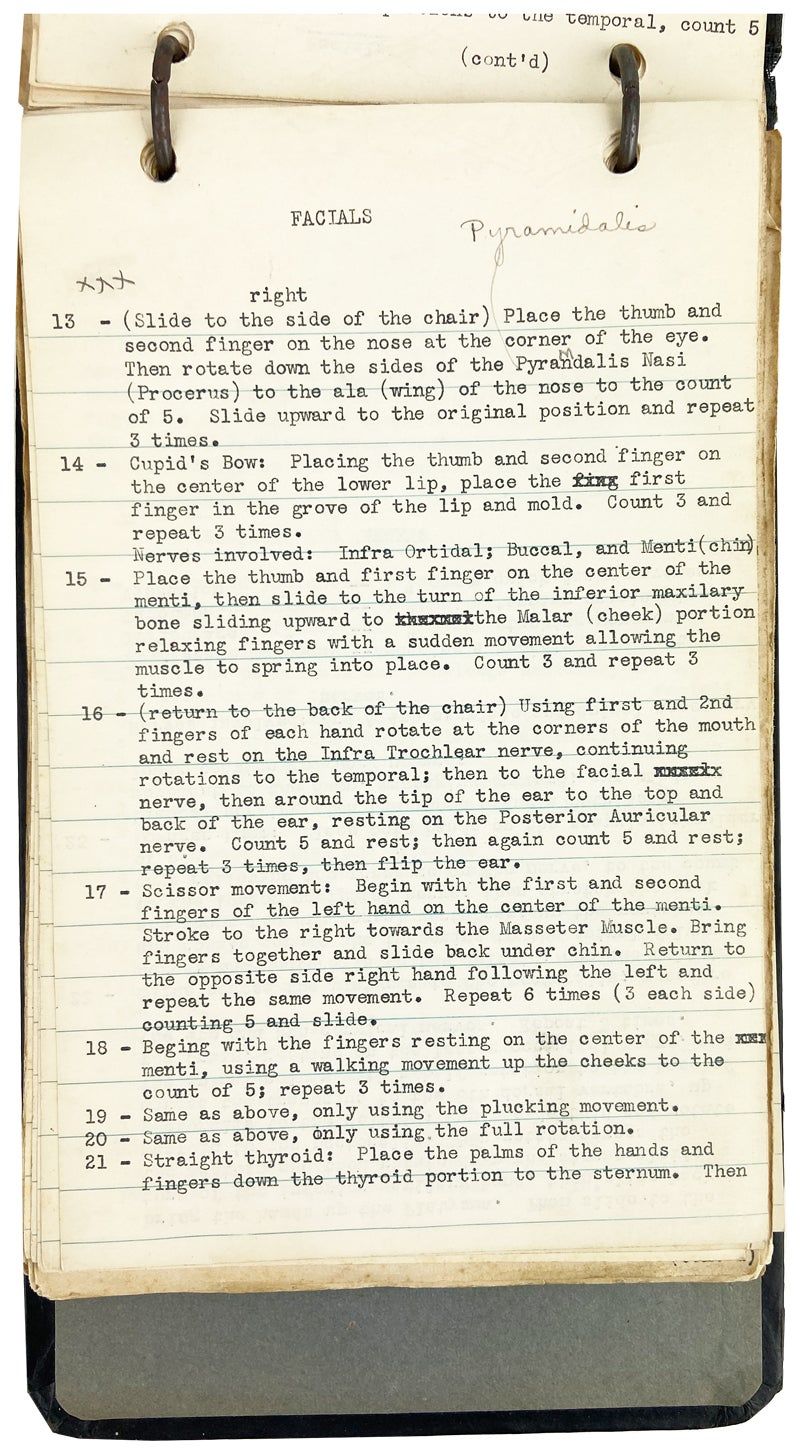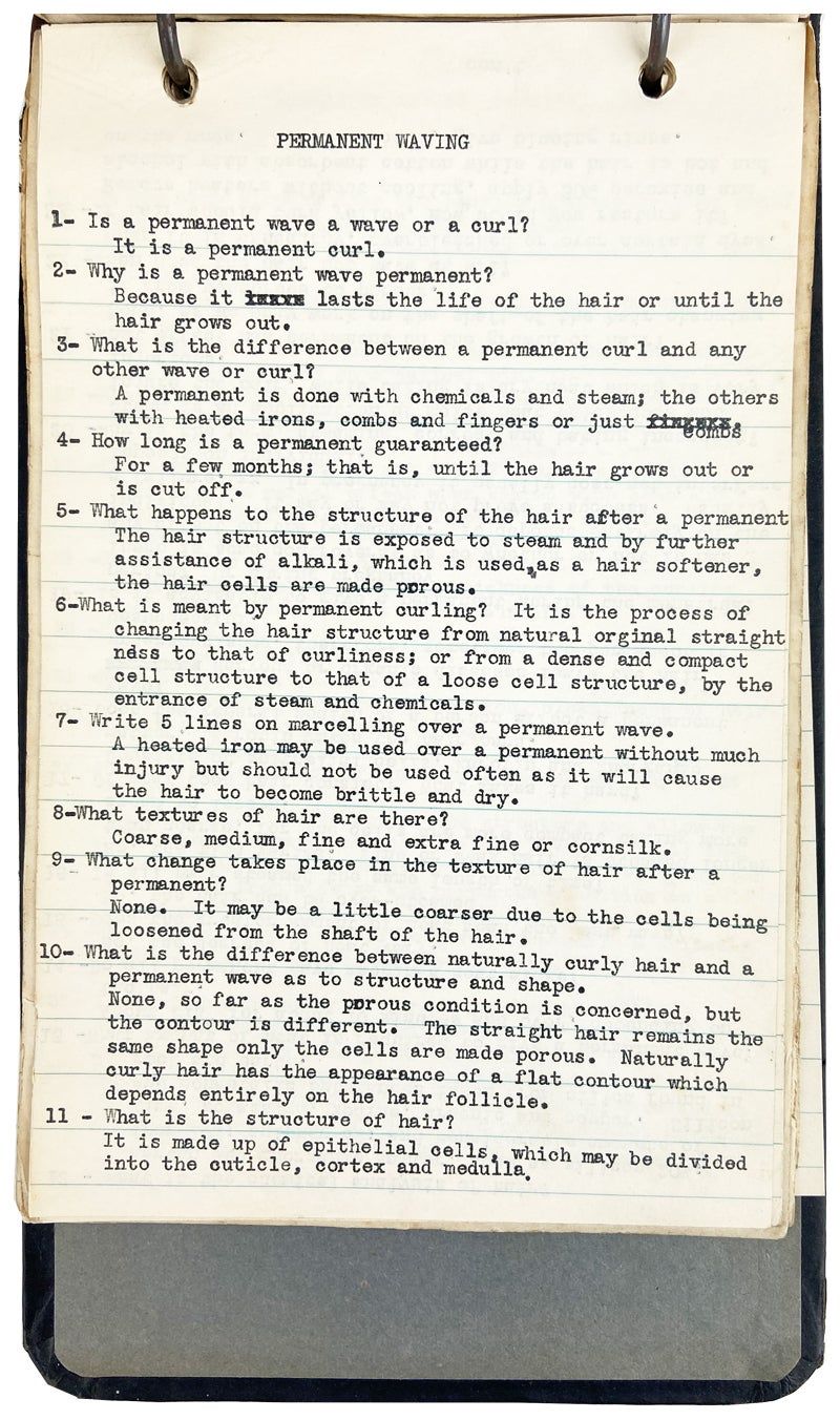 Dutifully-used University Loose Leaf Note Book purchased from a Woolworth and filled with neatly typed up notes to seventeen disparate, alphabetically-organized lessons on topics ranging from Bacteriology, Bones, and Cells, to Facials, Hair Dyeing, and Manicuring. The fourteen pages relating to Electricity are followed by a short page on the art of dyeing eyelashes and eyebrows, while the lesson on Marcelling (i.e. hair curling) is followed by Myology and Permanent Weaving. The lessons conclude with the Respiratory System, Shampooing, Scalp Treatments, and the Vascular System.