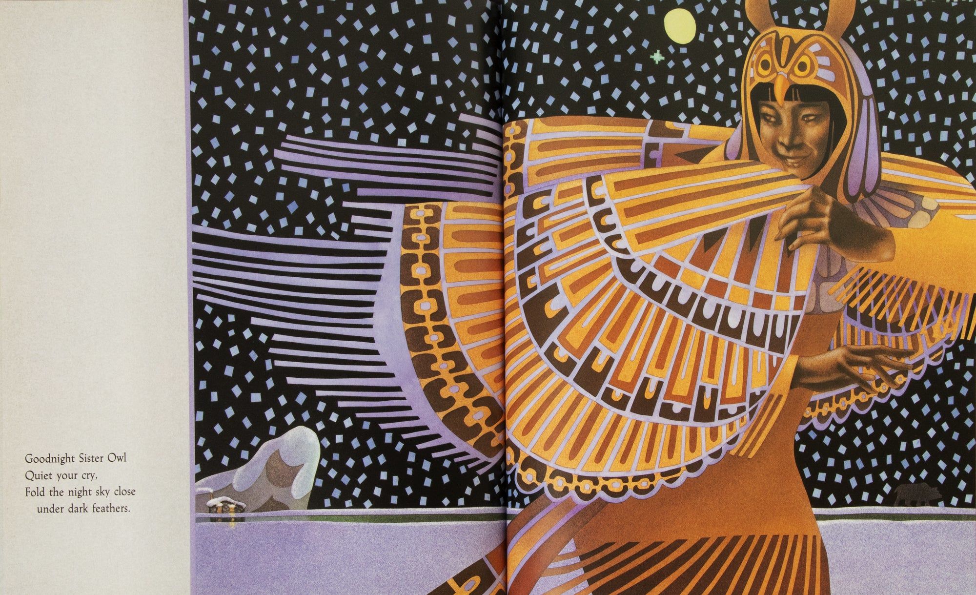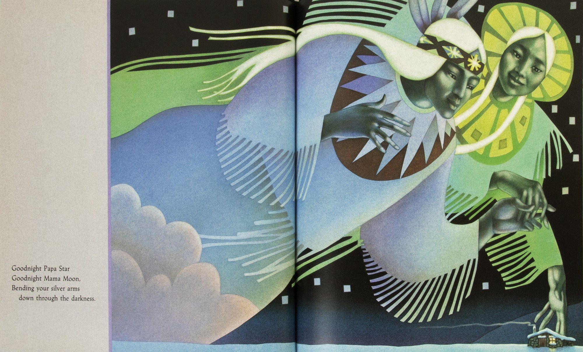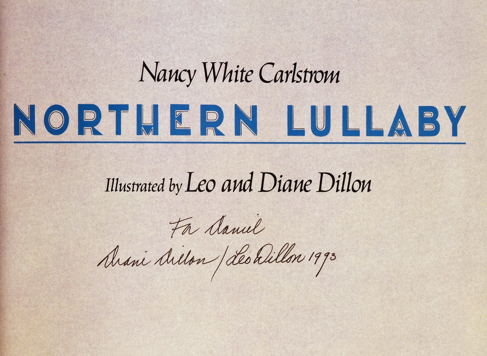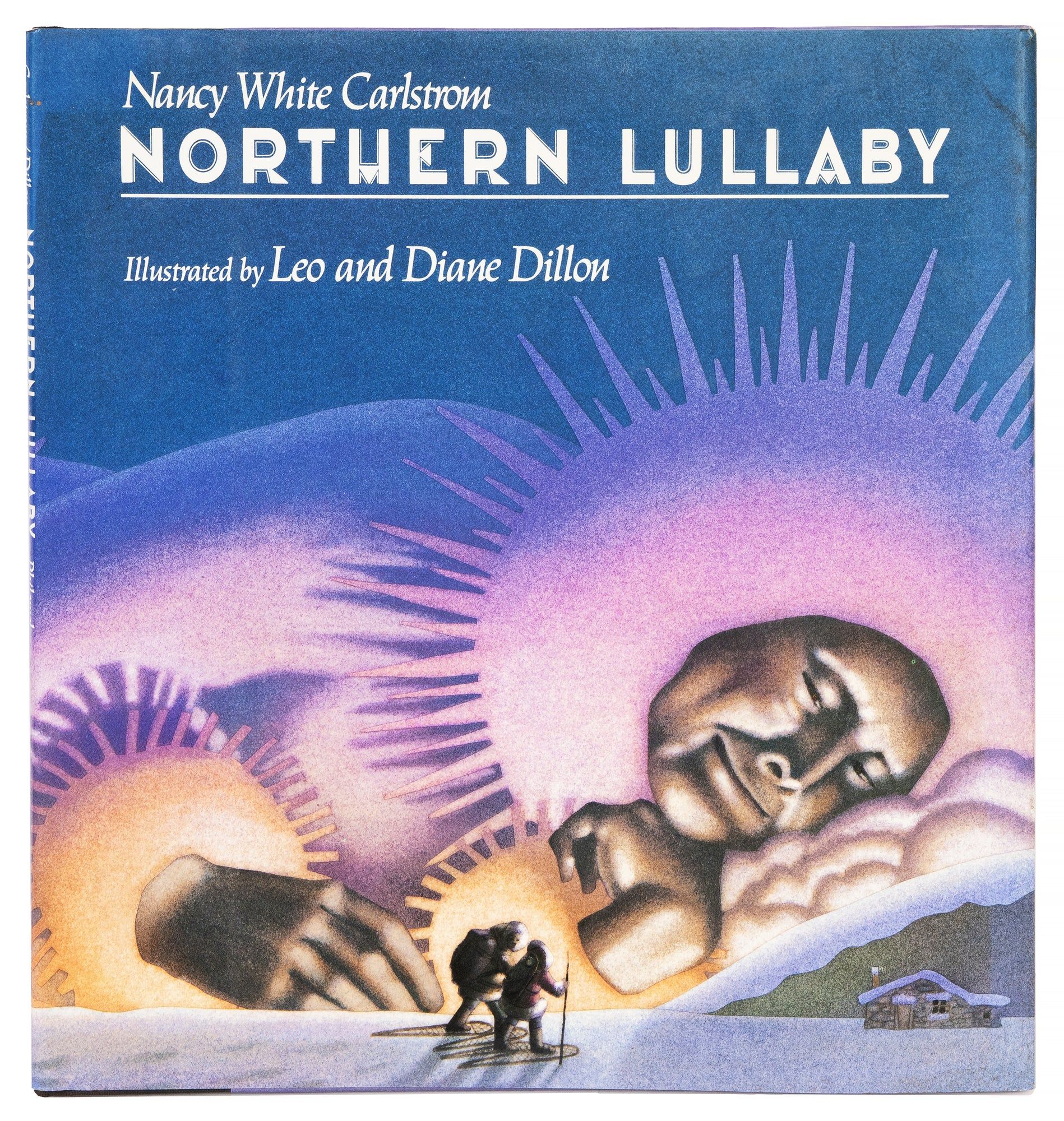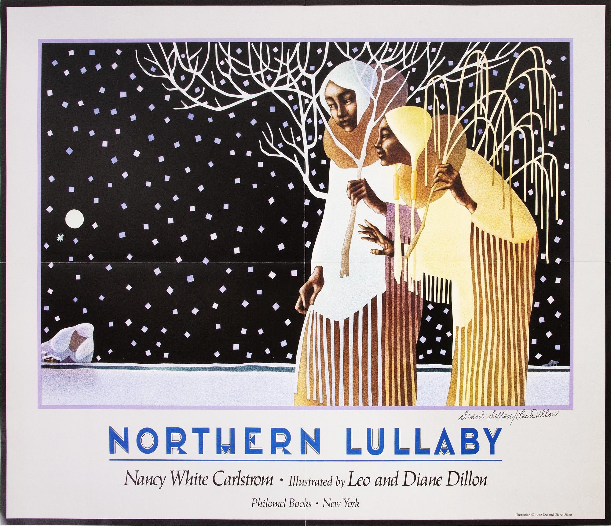 New York: Philomel Books, 1992. First edition, review copy, of Nancy White Carlstrom’s Alaskan bedtime story, richly illustrated with Native American imagery by Leo and Diane Dillon, accompanied by the publisher’s signed promotional poster. A sleepy young narrator bids goodnight to the Earth, each feature of the snow-covered landscape imagined as part of the family: “Goodnight Papa Star / Goodnight Mama Moon, / Bending your silver arms / down through the darkness.” Leo and Diane Dillon won numerous awards over the course of their long career, including back-to-back Caldecott Medals in 1976 and 1977, for Ashanti to Zulu and Why Mosquitoes Buzz in People’s Ears, the only consecutive medals given to date. They would win the 1992 Society Of Illustrators Gold Medal for the vibrant airbrush and watercolor images in Northern Lullaby. The publisher’s poster reproduces their two-page spread of the tree spirits Auntie Willow and Auntie Birch, “standing in long flannel gowns in the silence.” A near-fine inscribed copy of a stunning book, accompanied by a signed poster. Single volume, measuring 11 x 10 inches: [26]. Original black cloth spine lettered in silver, purple pictorial boards stamped in blind, original unclipped color pictorial dust jacket, color pictorial endpapers. Color illustrations on every page. Inscribed “For Daniel,” signed, and dated 1993 by Dillons on title page. Publisher’s review slip laid in. Poster measuring 18.5 x 21.5 inches, signed at lower right. Lightest shelfwear to book, horizontal and vertical creases to poster from folding.