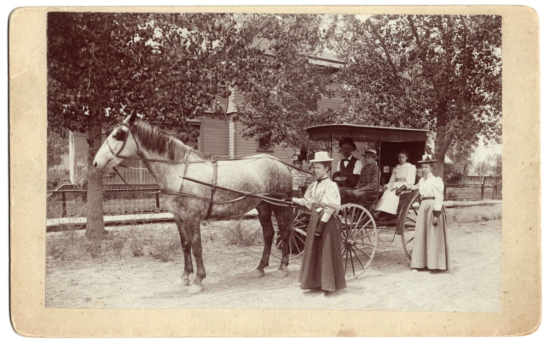 Grand Junction, Colo: D. N. Wheeler, Photographer, 1892. Photograph. Very Good. Albumen photograph [11.5 cm x 17.5 cm] on a plain tan card mount [12.5 cm x 20 cm]. "D. N. Wheeler, Photographer, Grand Junction, Colo." stamped in black on the reverse. Some minor rubbing to the surface of the image. Small bump and crease to the top left corner of the mount (does not affect the image). Close shot of a horse drawn carriage on a dirt road in front of a house and two trees. Three people are seated in the carriage and three people are standing near it, all of them in formal attire.
