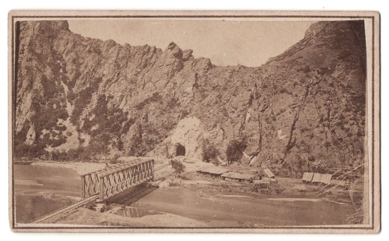 Salt Lake City, UT: Savage & Ottinger Fine Art Gallery, 1860. Photograph. Very Good +. Carte de visite. Albumen photograph [5.5 x 9.5 cm] mounted on a white card [6 x 10 cm] with a gold border on the front. Savage & Ottinger Fine Art Gallery backstamp (with beehive garden illustration). Faint pencil notation on the reverse. Two small stains also on the reverse (does not affect photograph, nor does it obscure the backstamp). The image is bright and clear, showing nice contrasts. A wide view looking down on the railroad tracks and bridge leading over the Weber River and into tunnel number three in Weber Canyon, UT. Several small building structures are visible to the right of the tunnel.
