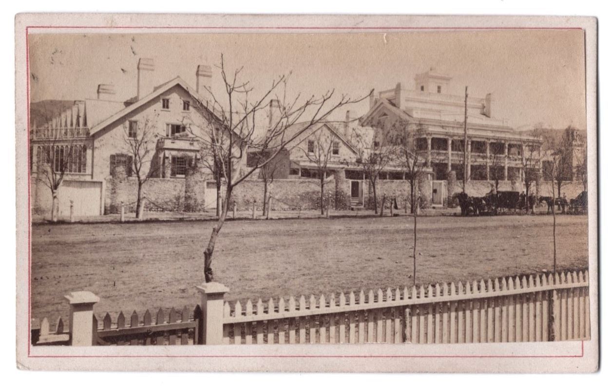 Salt Lake City, UT: C. R. Savage, Pioneer Art Gallery, 1870. Photograph. Very Good. Carte de visite. Albumen photograph [5.5 x 9.5 cm] mounted on a white card [6 x 10 cm] with a red border on the front. "C. R. Savage, (Late Savage & Ottinger.) Pioneer Art Gallery" backstamp. Nice contrast and detail in the photograph. Pencil notation in a neat hand on the reverse. The photograph is just barely starting to curl away from the card along the top. Shows a direct view of Brigham Young's residences from across the road on South Temple street looking north and slightly east. A white picket fence can be seen in the immediate foreground. A few horse drawn carriages can be seen parked in front of the Beehive House.