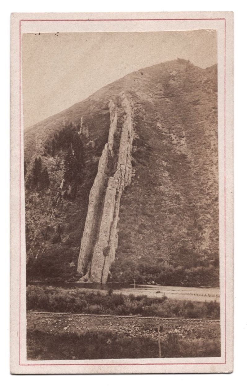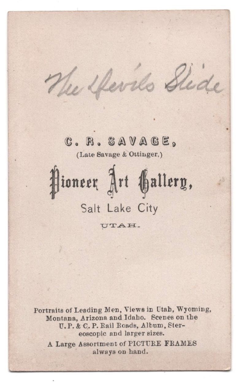 Salt Lake City, UT: C. R. Savage, Pioneer Art Gallery, 1870. Photograph. Near Fine. Carte de visite. Albumen photograph [9.5 x 5.5 cm] mounted on a white card [10 x 6 cm] with a red border on the front. "C. R. Savage, (Late Savage & Ottinger.) Pioneer Art Gallery" backstamp. Pencil notation in a neat hand on the reverse. The photograph shows clear focus and excellent contrast. A straight-on, portrait-oriented view of the iconic protruding limestone strata, The Devil's Slide. Railroad tracks (Union Pacific line) and the Weber River can be seen in the foreground at the base of the towering geological formation.