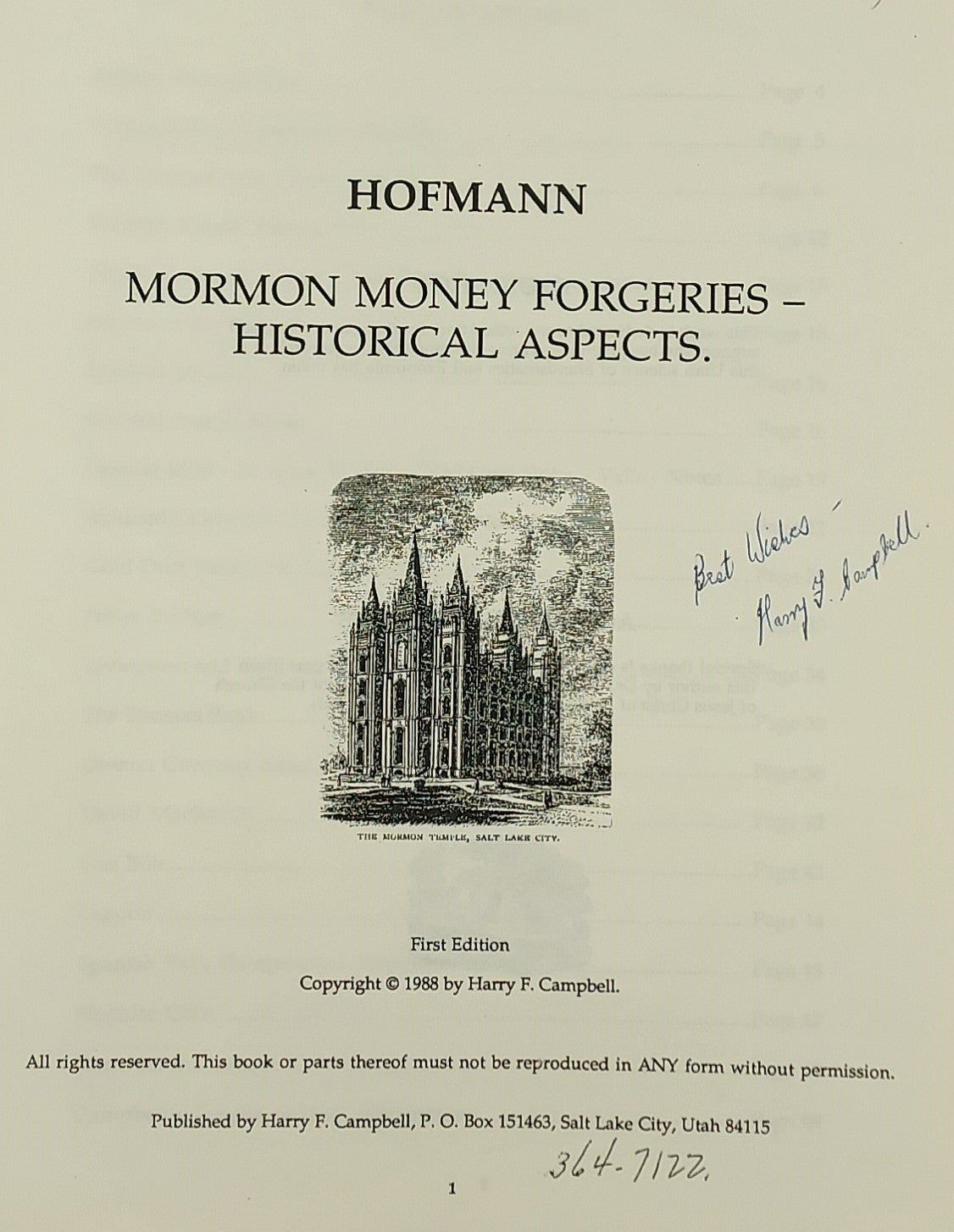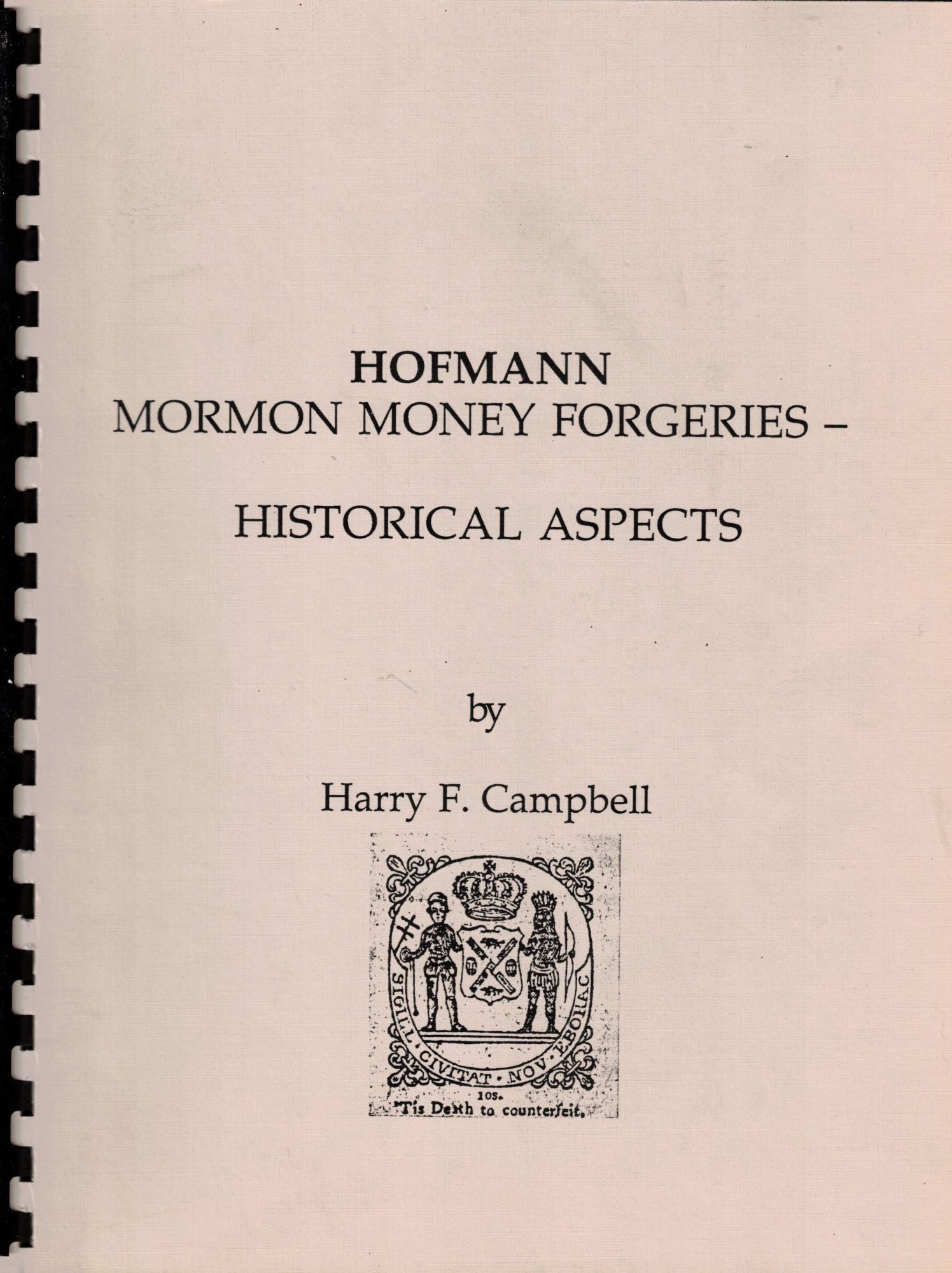 Salt Lake City, UT: Published by the author, 1988. First edition. Spiral Bound. Very Good +. SIGNED. 48pp. Quarto [28 cm] Tan spiral bound wrappers with printed title on front panel. With only very trivial soiling to the front wrap. An examination of Mark Hofmann Mormon currency forgeries with illustrated examples. Inscribed by the author on the title page: "Best Wishes - Harry F. Campbell.