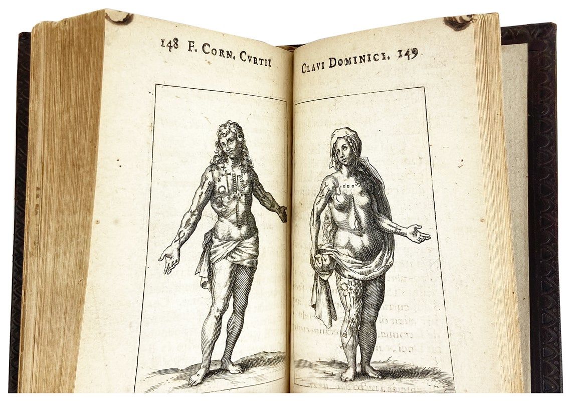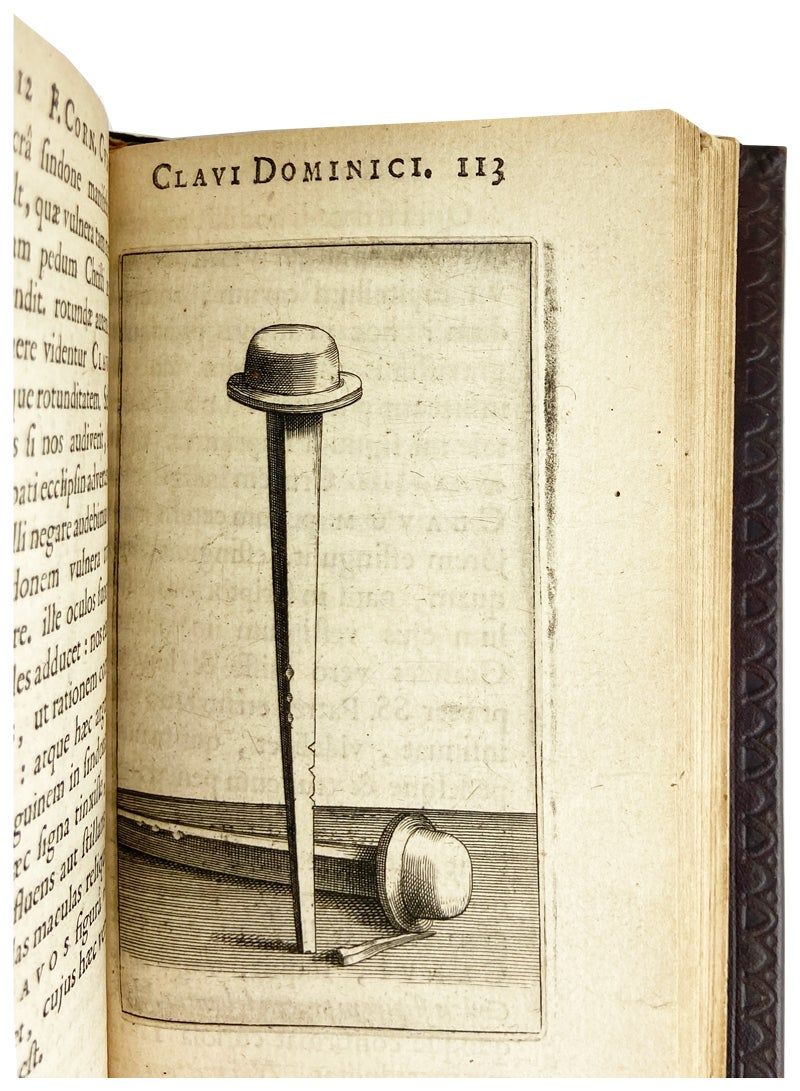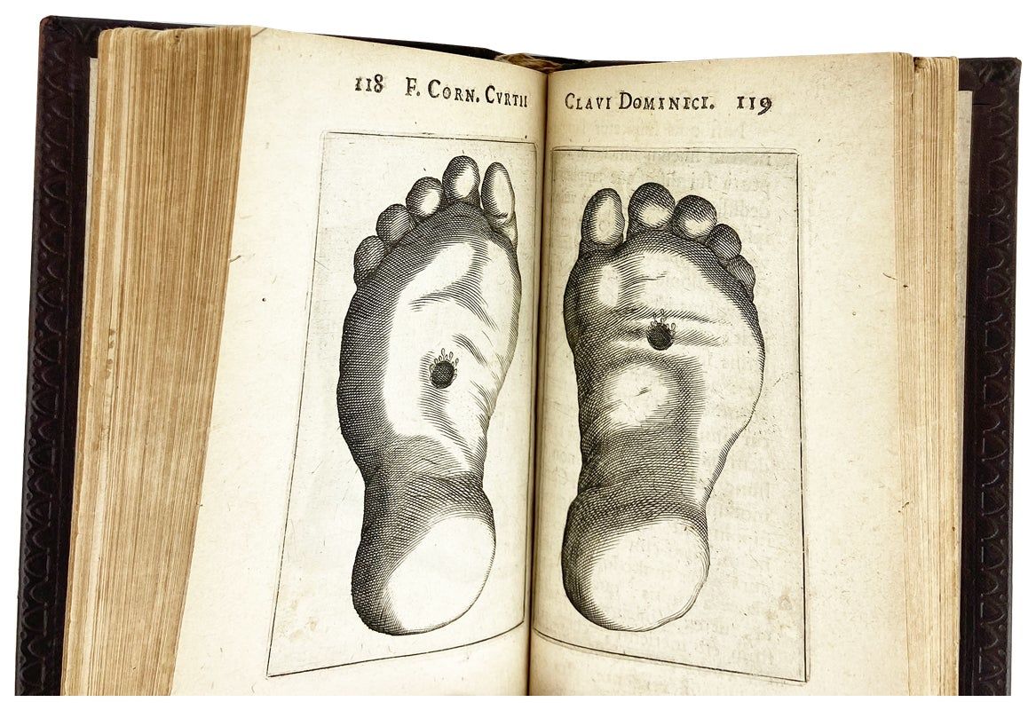 Generously-illustrated study of the crucifixion by Belgian Augustin monk Cornelius Curtius (1590-1638) adorned with a myriad of representations of Christ on the cross, as well as depictions of the nails used, and views of the crucified feet from the side and from above.