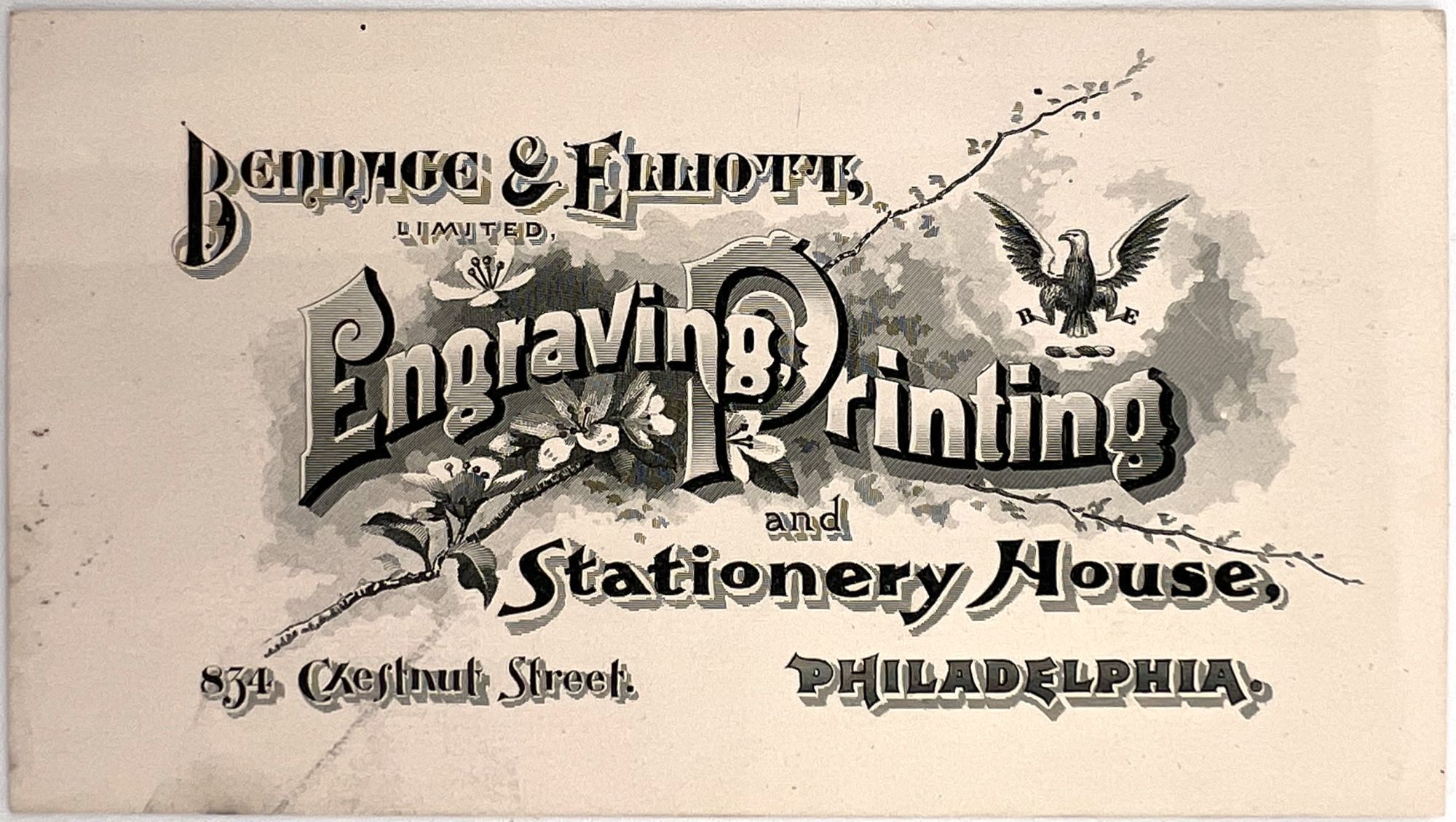 Philadelphia, Pennsylvania: Bennage & Elliott, 1890. Very good to near-fine. Minor toning, dust soiling.. A stylish engraved trade card for Bennage & Elliott, an engraving, printing, and stationery housed based in Philadelphia. Utilizes a faux three dimension effect in its typography, as well as cherry blossoms and an eagle for imagery. An effective advertisement for their own product. Measures approx. 2.25" by 4