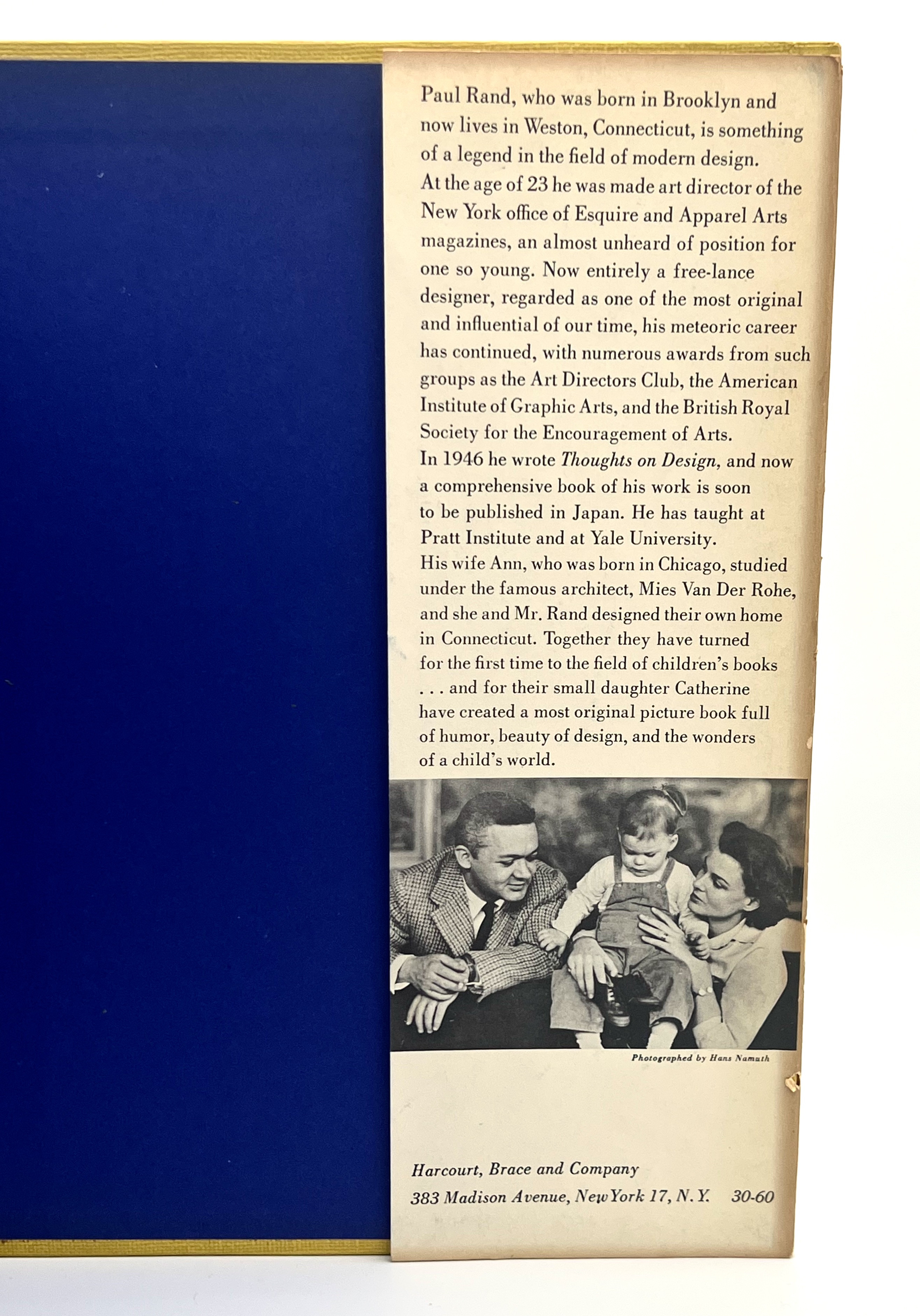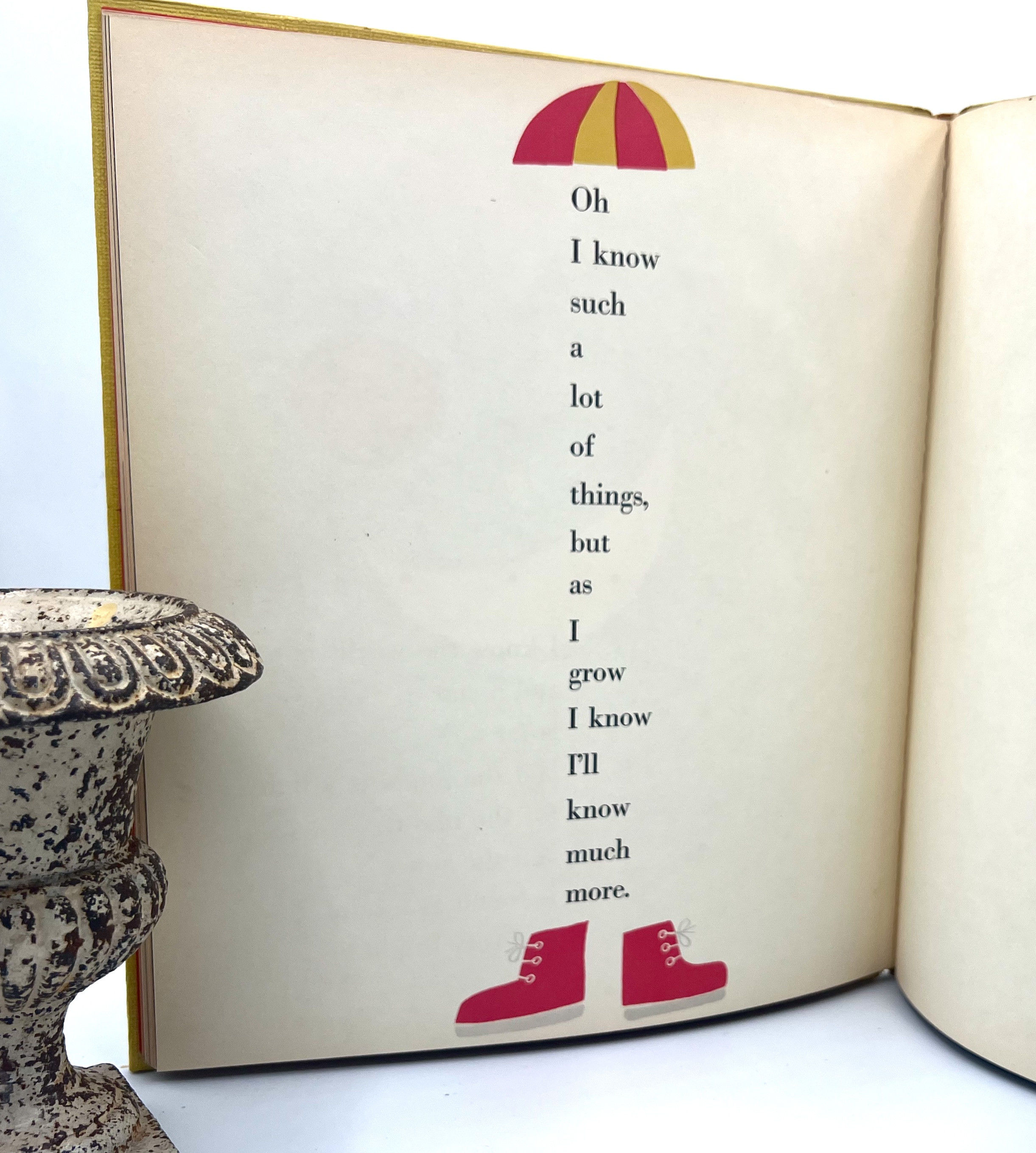 New York: Harcourt, Brace and Company, 1956. First Edition. Hardcover. Yellow illustrated cloth covered boards. Very good, in good dust wrapper. Unpaginated [29 pp.] 26 x 22 cm. A masterful collaborative effort by Ann and Paul Rand. Ann, an architect and Paul, an award winning art director fashioned this innovative, modern children's book for their daughter, Catherine. Highlighting brightly colored graphic cut paper techniques, the story helps children realize they really DO know a lot of things. Its rhythm and rhyme reflect the Rands' short and direct writing. Interior clean and crisp. Boards rubbed at head and tail of spine. Dust wrapper with loss to spine, chipping and some toning. Covered in protective mylar.