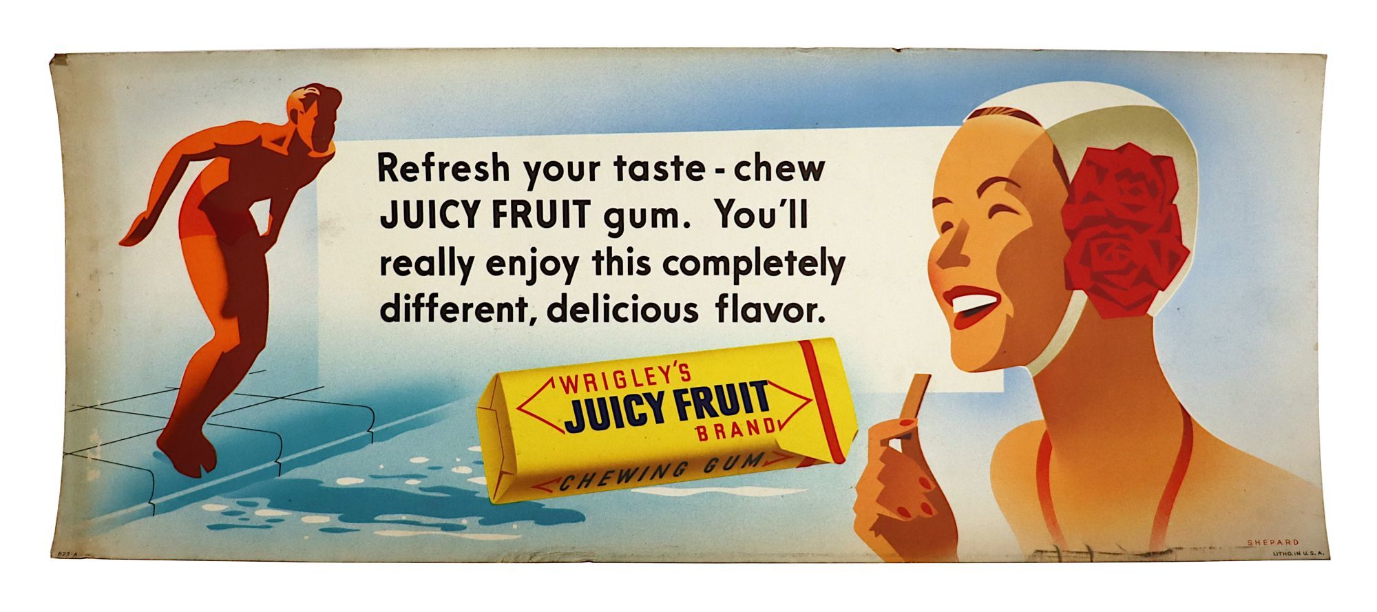 Uncommon lithograph produced by the husband and wife design team Otis and Dorothy Shepard, who began working for William Wrigley, Jr. in 1932, Otis serving as art director for the company for the next 32 years. In the early years of their tenure the couple designed at least a dozen such images promoting Juicy Fruit, all fabulously Art Deco, often with a sporty theme. In this example the Juicy Fruit consumers are pool-side, the woman in her floral bathing cap about to pop a strip in her mouth while she watches a muscular man get ready to dive in. "You'll really enjoy this completely different, delicious flavor.