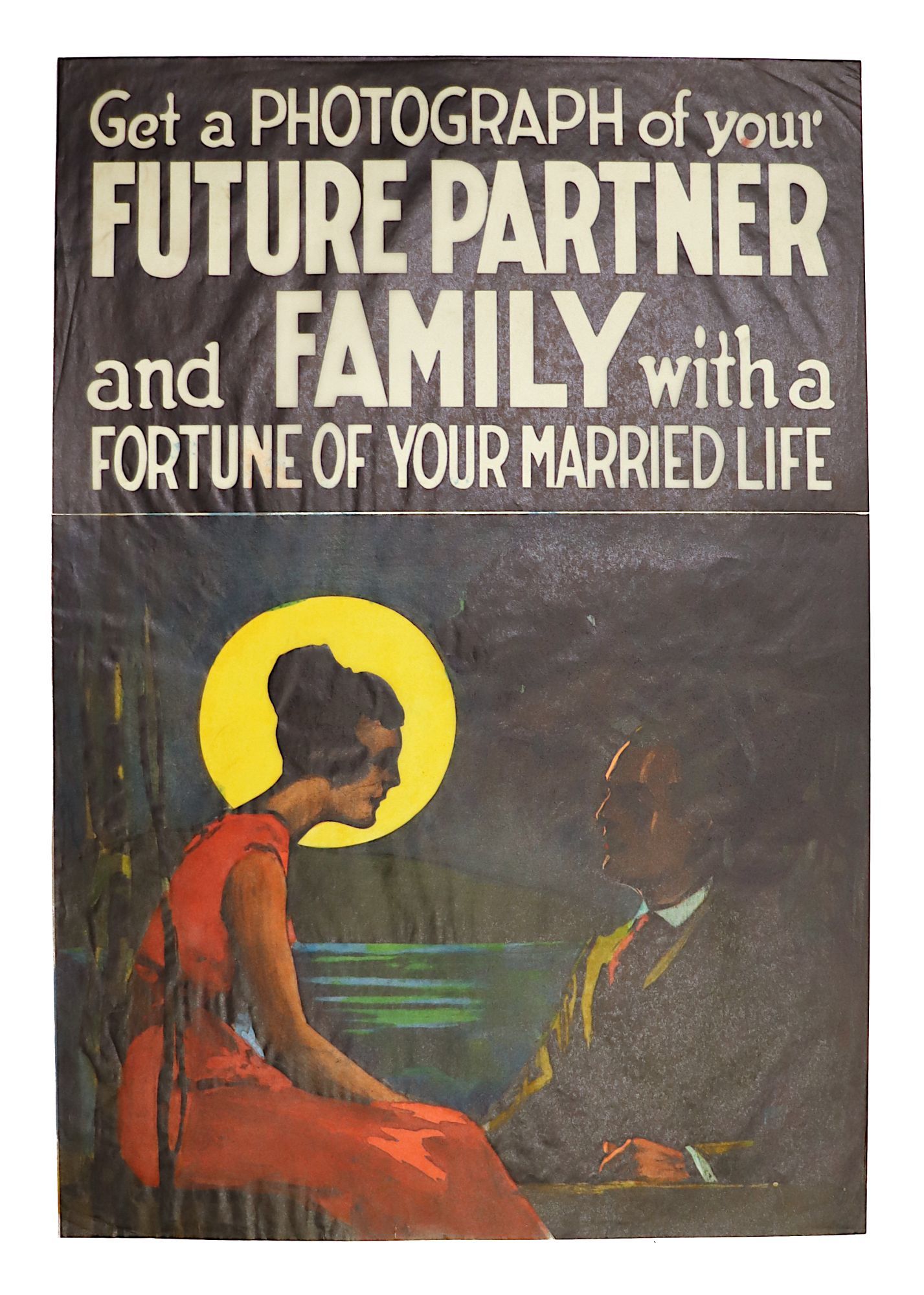 Display poster advertising a fortune-telling arcade game manufactured by the Exhibit Supply Co., which often employed backlit posters on translucent stock. The image shows a romantic young couple sitting beside a moonlit lake. Exhibit Supply Co., which manufactured card dispensers and arcade games, often fell in with the law for producing machines that encouraged illegal gambling.