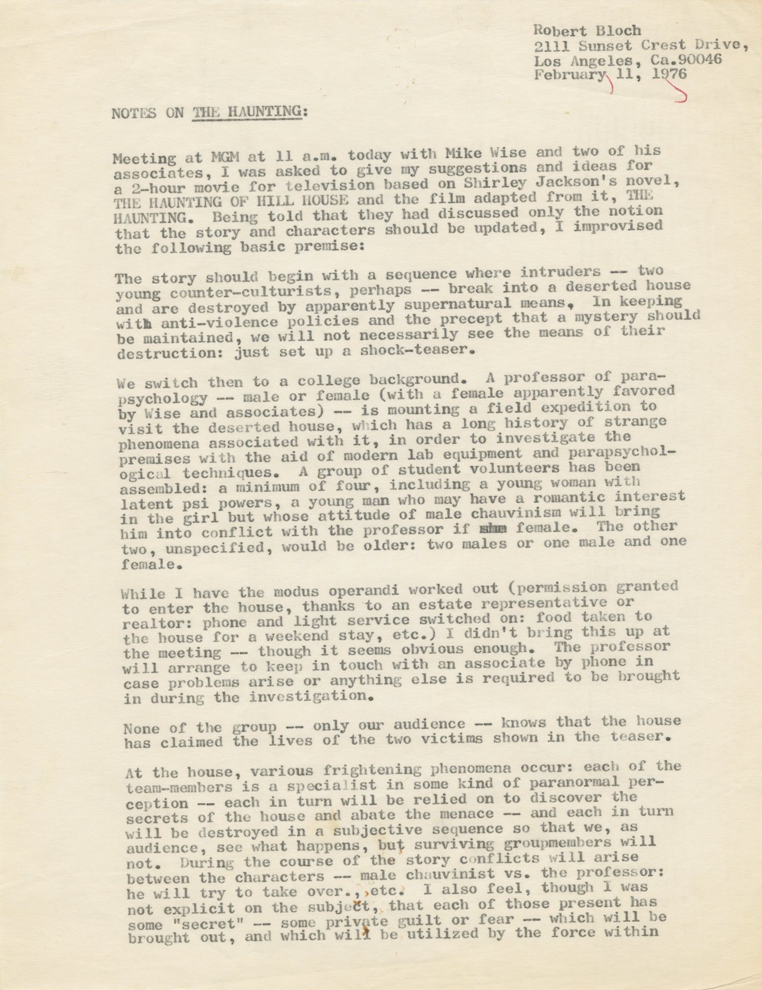 N.p.: N.p., 1976. Vintage six-page gathering of typescript and carbon typescript notes by Robert Bloch, detailing a meeting at Metro-Goldwyn-Mayer with producer Mike Wise, writer Lou Randolph, and associates to discuss a then-forthcoming, ultimately unproduced television movie based on Shirley Jackson's 1959 novel "The Haunting of Hill House." Notes dated between February 11 and March 1, 1976.