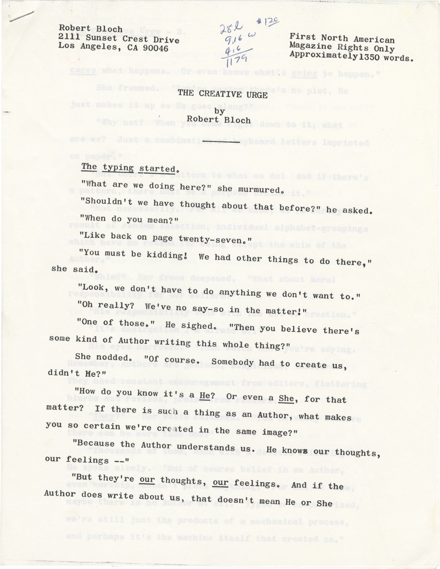N.p.: N.p., 1990. Vintage five-page xerographically duplicated manuscript of Robert Bloch's 1991 short story. Annotations in manuscript ink in Bloch's hand on the first leaf, evidently detailing payment for the story, and noting a single editorial revision on the fifth leaf.