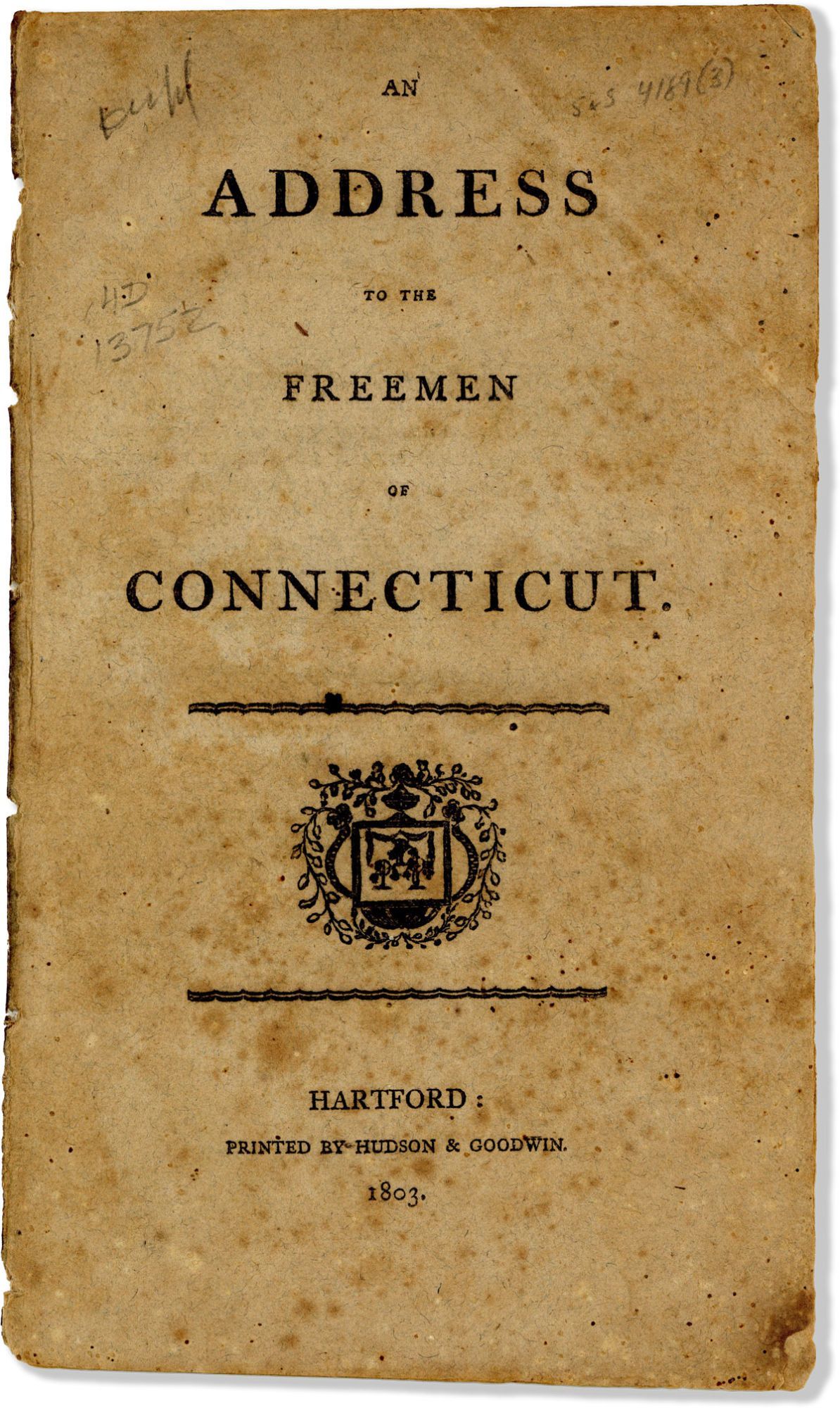 Hartford: Printed by Hudson & Goodwin, 1803. First Edition. Octavo. Sewn pamphlet, 7pp. Removed; expected tanning to text; Very Good. An anonymously published political pamphlet by Noah Webster, promoting Federalist candidates for the State Assembly. Concludes with a list of approved candidates, including Oliver Ellsworth, Roger Newbury, Simeon Baldwin, and seventeen others. S&S 4189. GAINES (Political Works of Concealed Authorship) 309.
