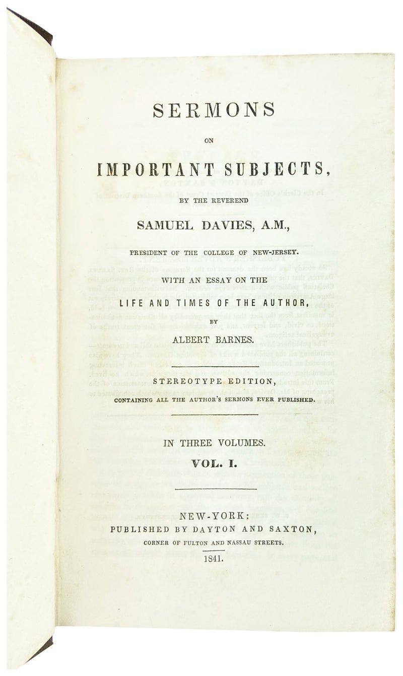 Sermons on Important Subjects, by the Reverend Samuel Davies, A.M., President of the College of New-Jersey. With an essay on the Life and Times of the Author, by Albert Barnes [Spine title: Davies' Sermons Vol I]
