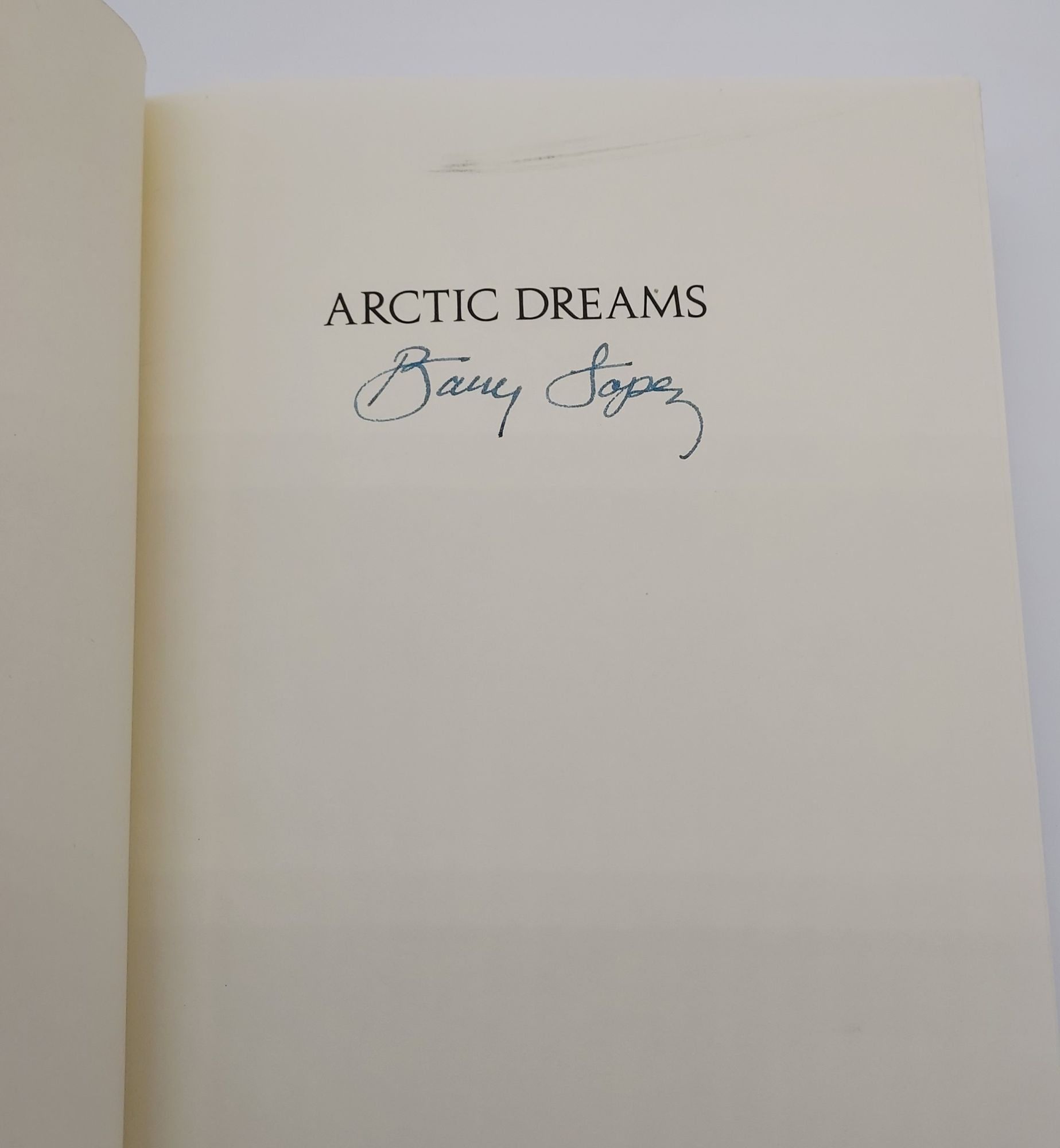 New York: Charles Scribner's Sons, 1986. First edition. Hardcover. Very Good/Very Good. SIGNED. 464pp. Large octavo [24 cm] 1/2 ivory colored cloth with navy blue paper covered boards. Spine ends gently bruised. Small scuff mark to foot of the text block. Light mark above author's signature. In the illustrated dust jacket, with rubbing and a couple of faint indentations to the surface. Lopez's celebration of the arctic landscape. Arctic Dreams won the National Book Award for Nonfiction, the Christopher Medal, a Pacific Northwest Booksellers Association Award, and an Oregon Book Award for literary nonfiction. Signed by Barry Lopez on the tipped-in half title page.