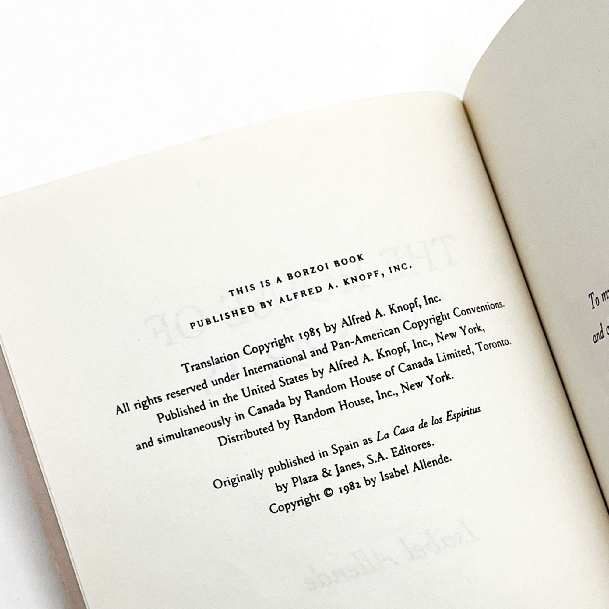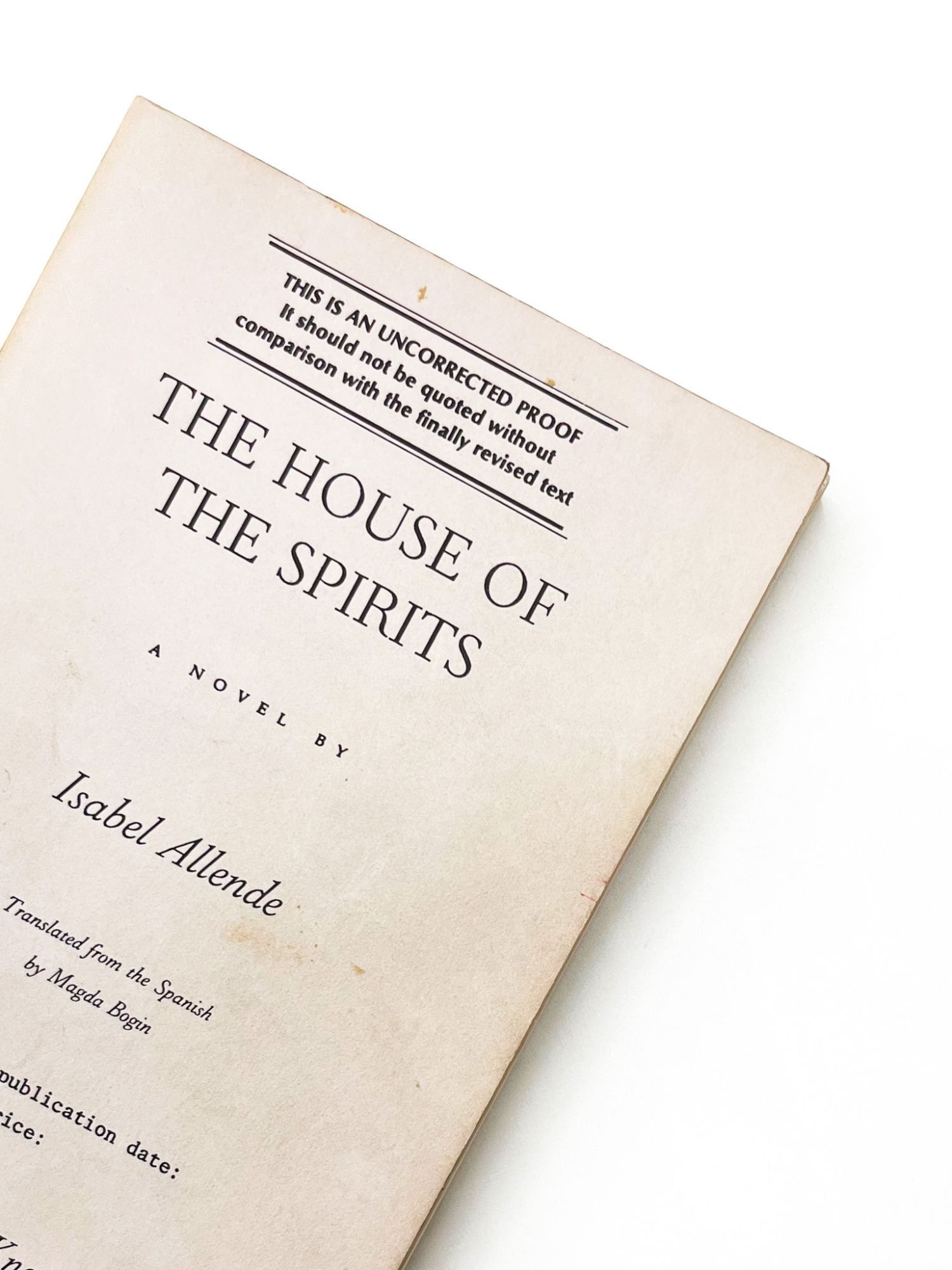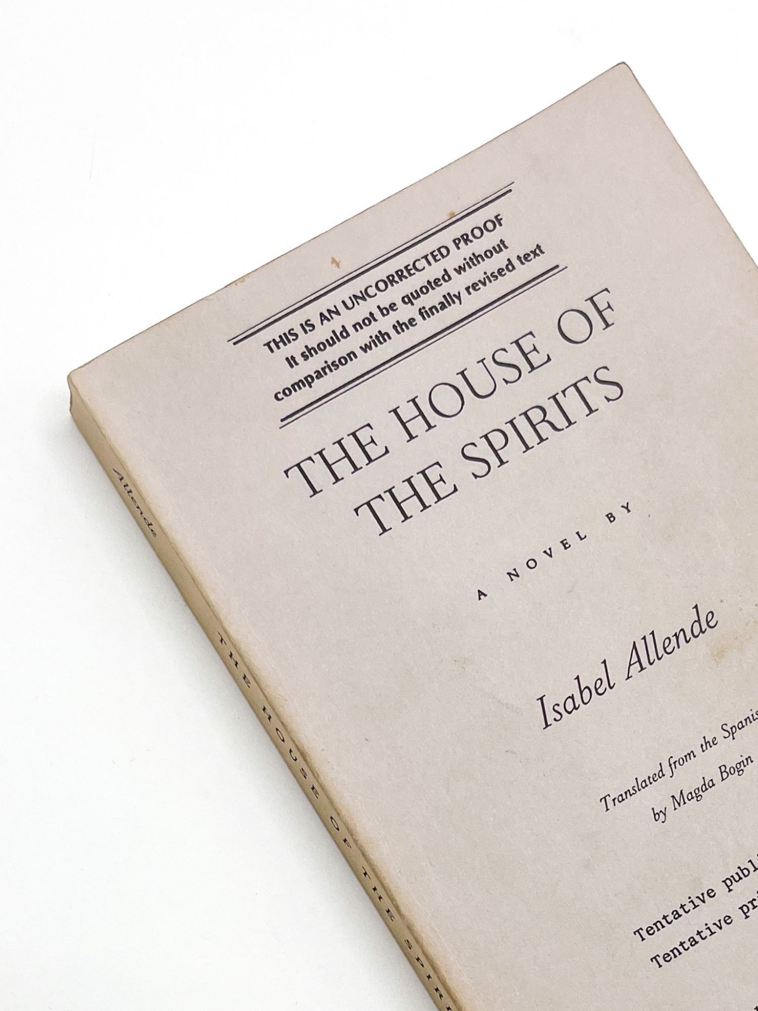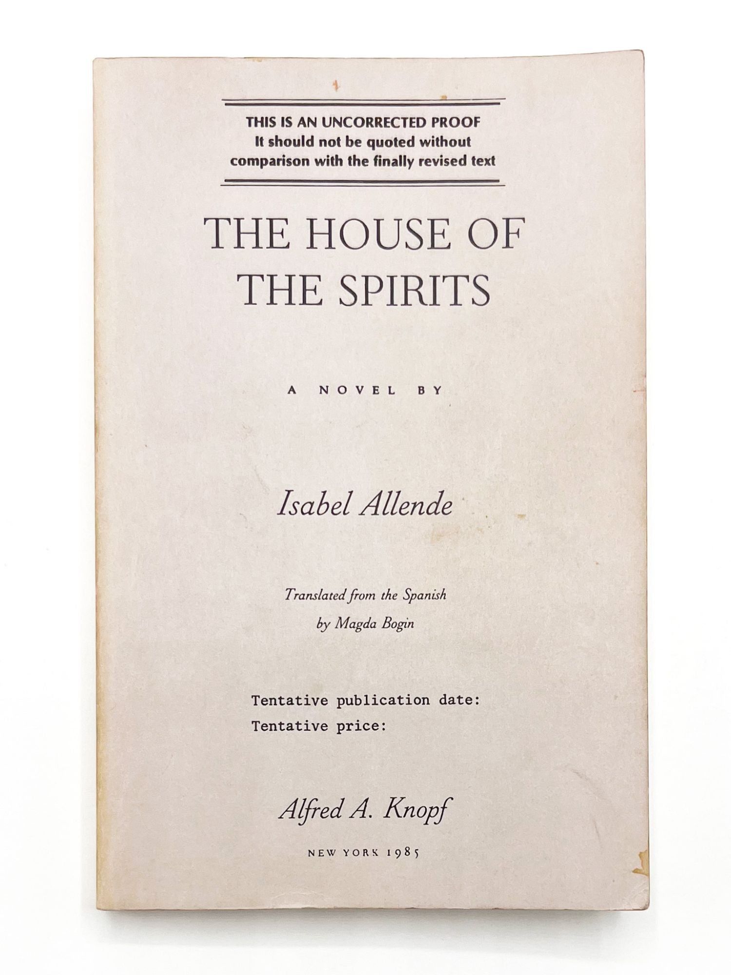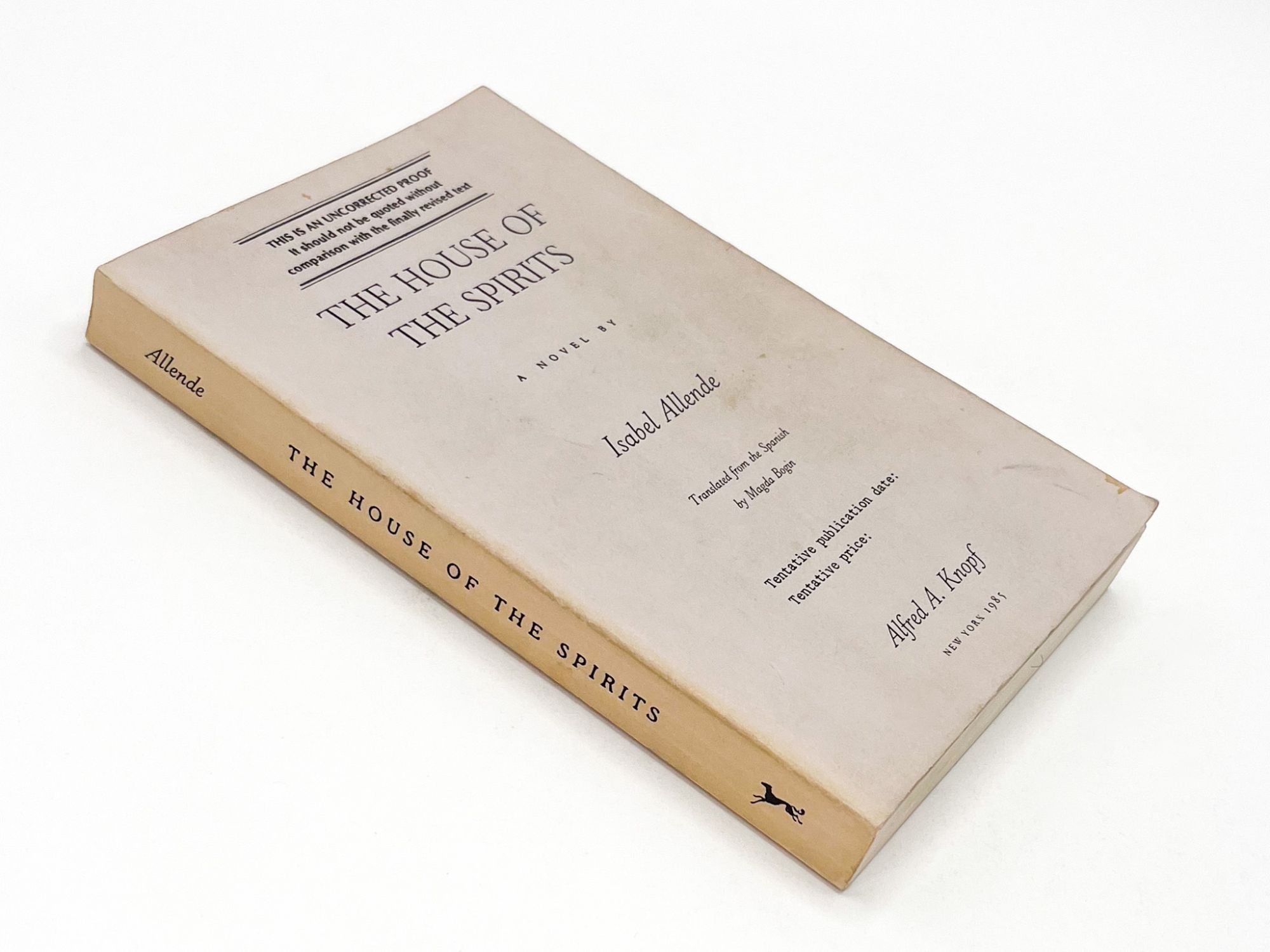 New York: Alfred A. Knopf, 1985. First printing. Very good.. Uncorrected proofs for the first US edition of Allende's debut novel, a multigenerational saga and classic of magic realism. In a later interview, Allende recalled the circumstances of her first novel's composition: "I started my first novel, 'The House of the Spirits,' on January 8, 1981 because I was living in exile in Venezuela and my grandfather was dying in Chile. And I could not return to be with him, so I started a letter for him that turned into 'The House of the Spirits,' [...] a very successful book." 8.25'' x 5.25''. Original printed grey wrappers. 353, [1] pages. Light edgewear, minor soil, sunning to spine.