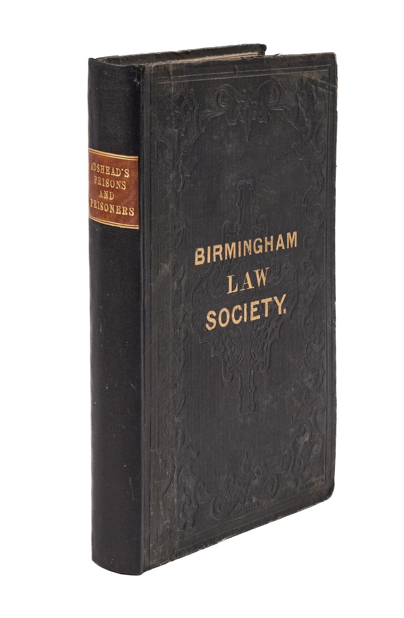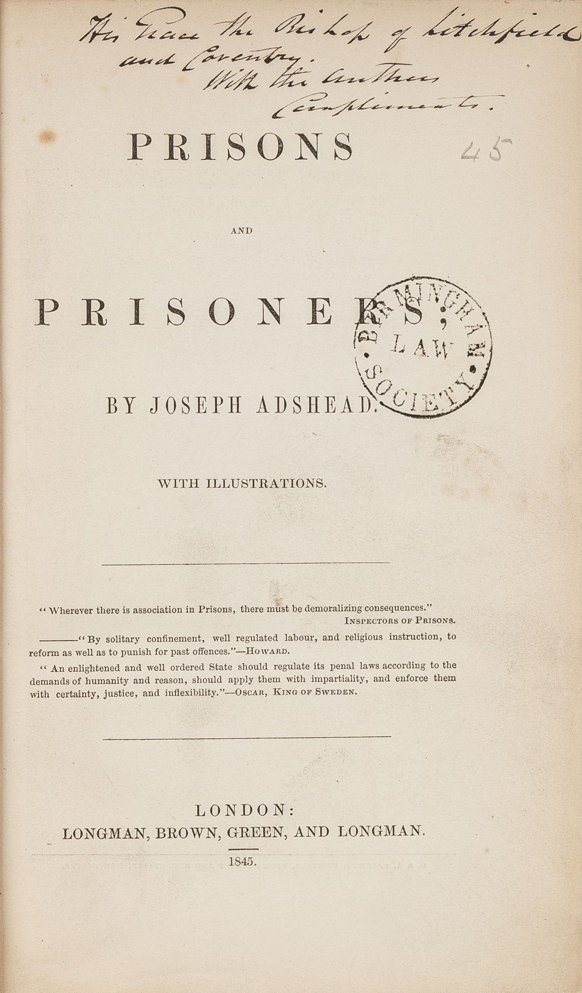 1845. London: Longmans, Brown, Green, 1845.. London: Longmans, Brown, Green, 1845. A Presentation Copy to the Bishop of Lichfield Adshead, Joseph [1800-1861]. Prisons and Prisoners. London: Longman, Brown, Green, and Longman, 1845. xvii, 320 pp. 2 copperplate illustrations, 1 folding. Lacking frontispiece; plate depicting Pentonville Prison obscured by darkening. Octavo (8-3/4" x 5-1/2"; 22 x 13.5 cm). Original textured cloth, rebacked, blind-stamped frames and ornaments to boards, endpapers retained, hinges mended. Light soiling to exterior, light rubbing to boards, gilt-stamped library name (Birmingham Law Society) to front board, moderate rubbing to board edges, small bookseller's ticket and library bookplate to front pastedown. Moderate toning to interior, negligible light foxing and soiling to a few pages, internally clean. Presentation inscription "His Grace the Bishop of Litchfield [sic]/ and Coventry./ With the Authors/ Compliments." to head of title page. Library stamps to title page and a few other leaves. A good copy. $150. * First edition. Adshead was a Manchester reformer and pamphleteer who served as an alderman for St. Anne's Ward and had a significant interest in penal reform. Prisons and Prisoners, like his other penal works, is broadly aligned with the views of Francis Lieber and argues in favor of the then-recent Pennsylvania system, also known as the "separate system." Based on Quaker beliefs in the redemptive power of silence and introspection, it put all convicts in solitary confinement. The separate system had come under increasing scrutiny, including by Charles Dickens, who wrote about the topic in American Notes (1842). Much of Prisons and Prisoners is dedicated to refuting these attacks, including a chapter titled "The Fictions of Dickens upon Solitary Confinement." Ultimately, critics of the Pennsylvania system were vindicated. The deprivation of social contact proved to be detrimental to the mental health of inmates. Some lost their sanity. This copy of Prisons and Prisoners was presented to John Lonsdale [1788-1867], who served as bishop of Lichfield from 1843 until his death. Lonsdale had entered Lincoln's Inn before his ordination in the Church of England, returning as the Inn's preacher from 1836-1843. He also served as principal of King's College, London, where he had a significant administrative role in the college and the hospital. He likely would.