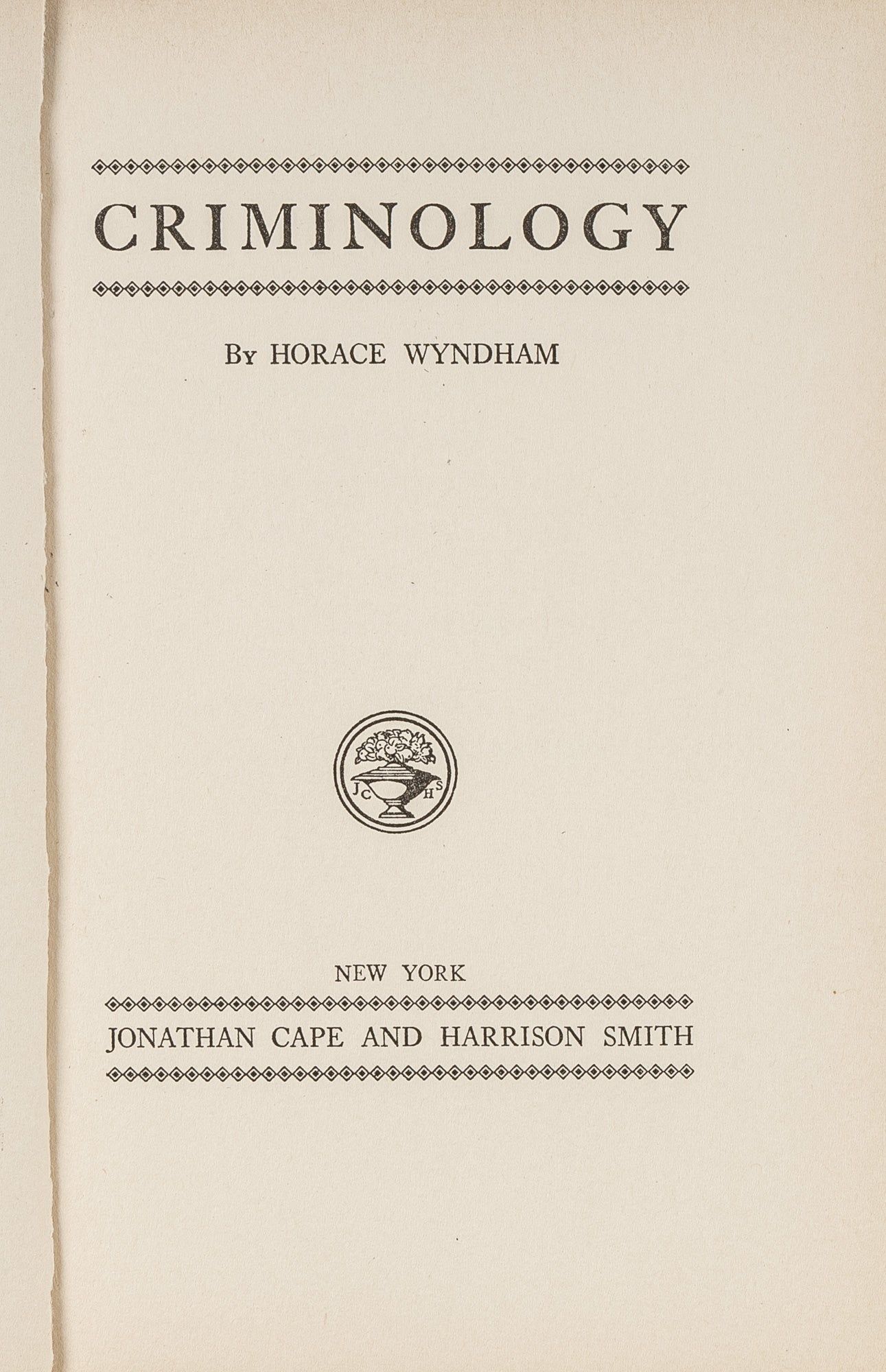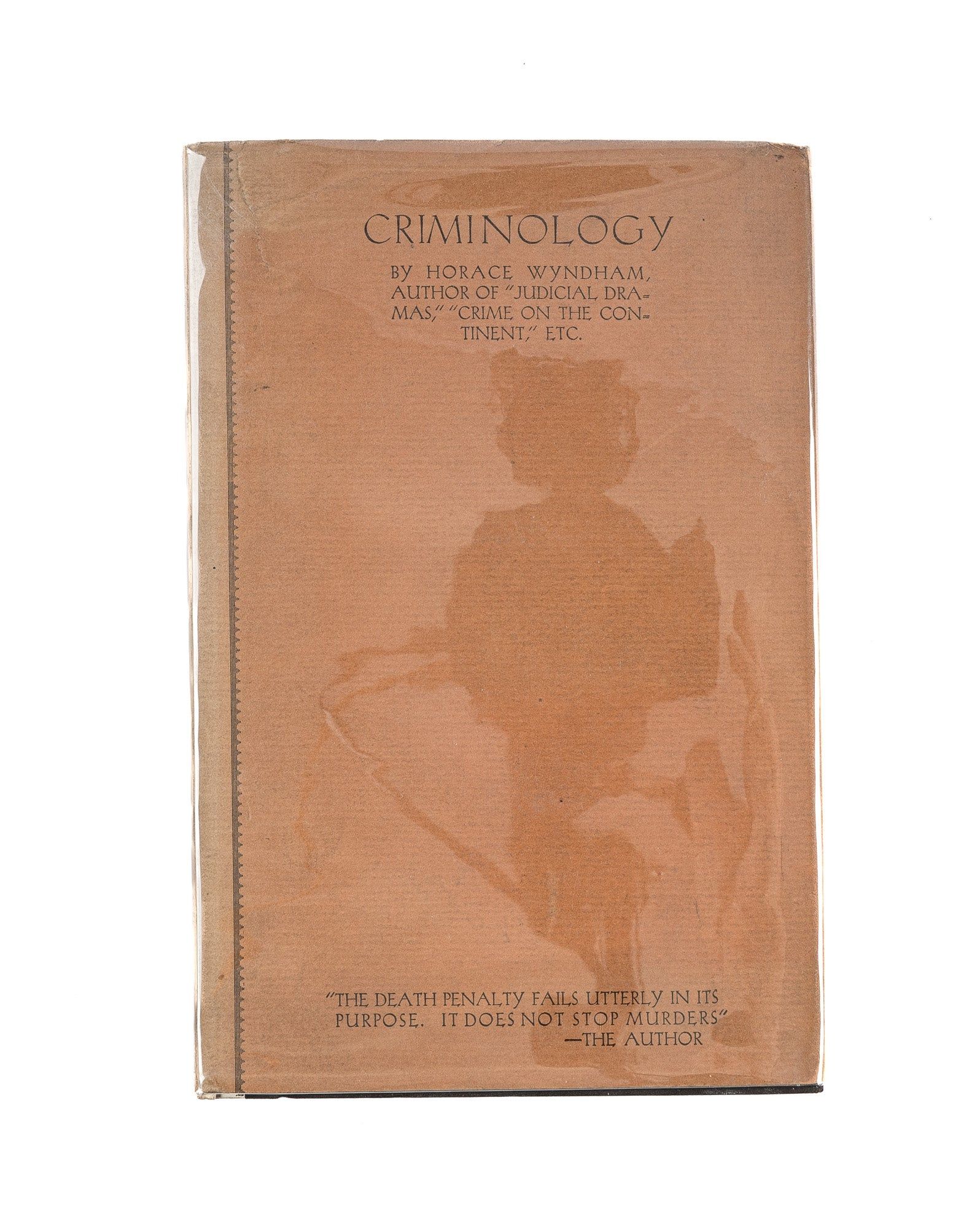 1929. Wyndham, Horace. Criminology. New York, J. Cape and H. Smith, 1929. 105 pp. Original black cloth with white spine. Light shelfwear, internally clean. In a lightly worn dust jacket. A very good copy. $20. * A prolific writer of biographies and accounts of famous trials, Wyndham's work approaches criminology through a historical and societal lens for a general audience rather than an academic text.