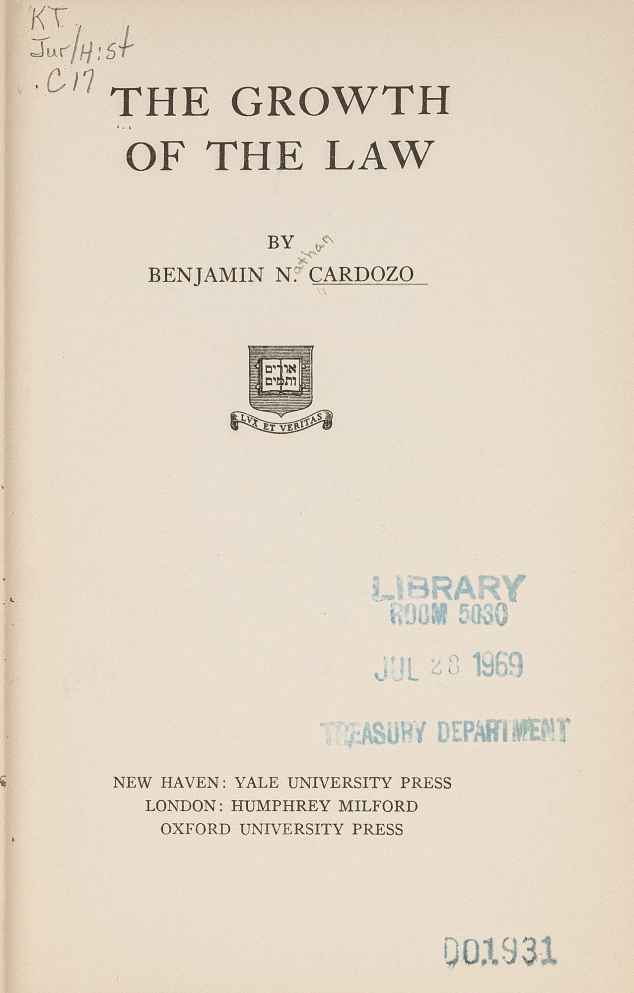 1939. Cardozo, Benjamin N. [1870-1938]. The Growth of the Law. New Haven: Yale University Press, 1934. 145 pp. Publisher's original cloth, with gilt stamped spine. Light rubbing to boards, spine ends and corners. Ex-library with shelf location label to top corner of front cover. Card pocket to rear pastedown. Property stamps to endleaves. Card pocket to rear pastedown. Internally clean. $20. * Sixth printing. First published October 1924. Intended as a supplement to The Nature of the Judicial Process, this is the published version of a series of lectures delivered at Yale Law School in 1924. "A scholarly and stimulating little book.": H.F. Goodrich, Columbia Law Review 50:881 cited in Marke, Catalogue of the Law Collection at New York University (1953) 903.