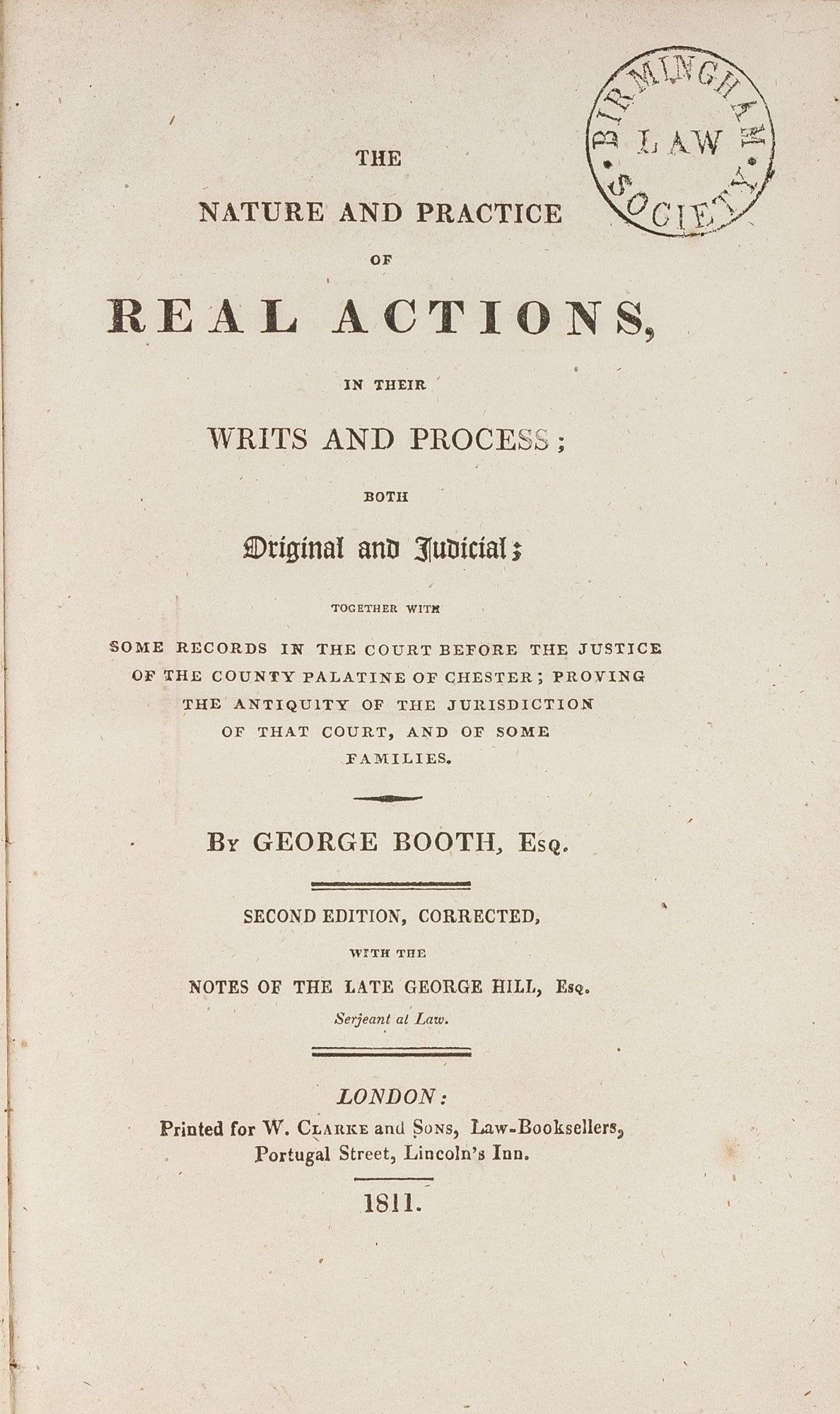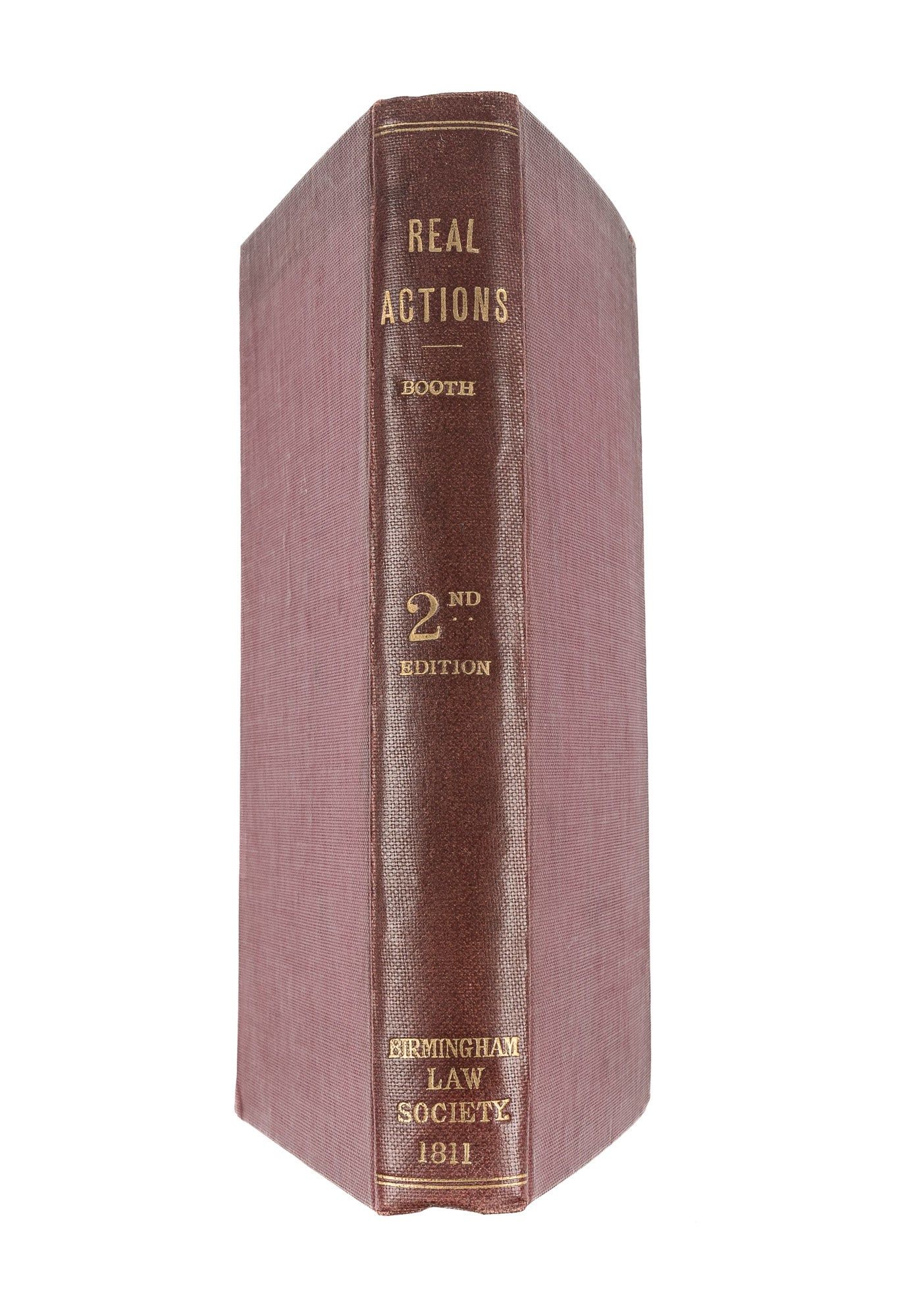 1811. London: W. Clarke and Sons, 1811. Second Edition. London: W. Clarke and Sons, 1811. Second Edition. Booth, George. Hill, George, Editor. The Nature and Practice of Real Actions, In Their Writs and Process; Both Original and Judicial; Together with Some Records in the Court Before the Justice of the County Palatine of Chester; Proving the Antiquity of the Jurisdiction of That Court, and of Some Families. London: W. Clarke and Sons, 1811. Second Edition. Corrected with the notes of the late George Hill. xvi, 319 pp. Paging irregular, following the paging of the original edition, inset in the margin of the text. Original burgundy cloth with gilt stamped spine. Moderate shelfwear. Light bumping to corners. Ex-library with bookplate to front pastedown. Property stamp title page. Internally clean. $150. * This treatise focuses on real actions, which are judicial proceedings in common law for the recovery of land providing the nature and practice of real actions, including the writs and processes involved, both original and judicial. It includes historical records from the court of the Justice of the County Palatine of Chester. Which aim to demonstrate the historical jurisdiction of the Chester court and its connection to the antiquity of some families within the region. Intended to be a guide for legal professionals and scholars interested in the history of real property law in England.