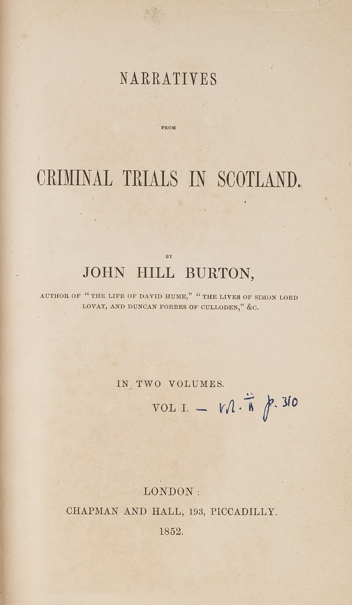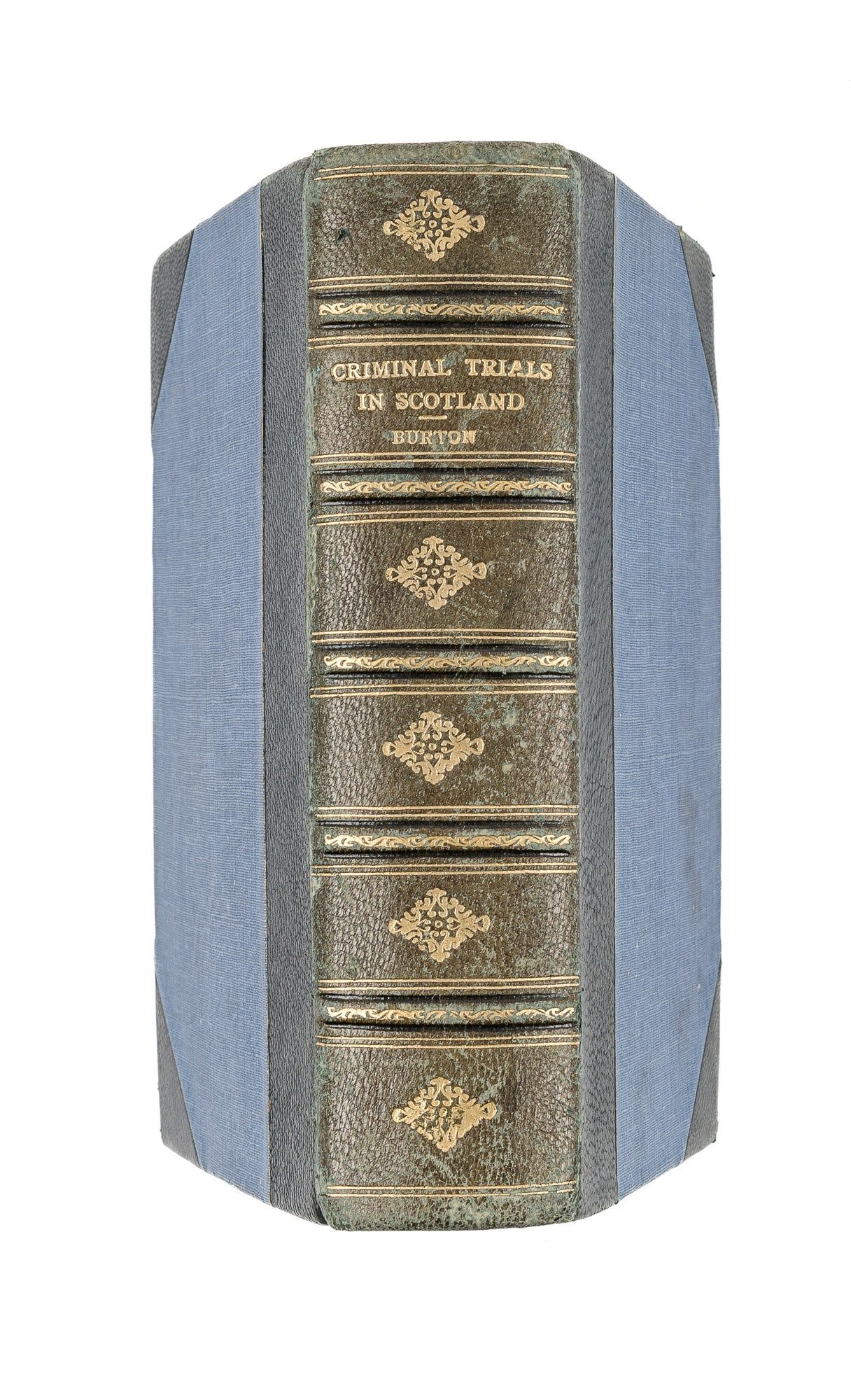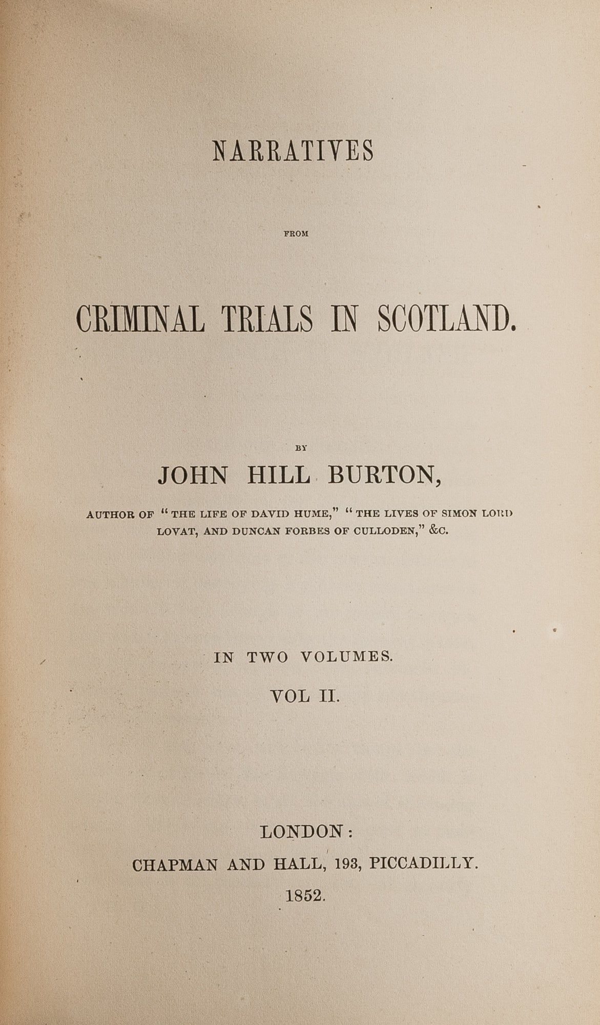 1852. London: Chapman & Hall, 1852.. London: Chapman & Hall, 1852. Burton, John Hill. Narratives from Criminal Trials in Scotland. 2 Volumes bound in one. London: Chapman & Hall, 1852. iv, 310; 319 pp. Three quarter blue morocco over cloth, rubbed and worn, gilt stamped spine. Internally clean and bright. $125. * First edition. Key trials detailed in the book include: The Darien Expedition: This section covers the tragic story of Scotland's attempt to establish a colony in Panama and the subsequent trials surrounding the failure of the venture. Trial of James Stewart: Burton narrates the trial of James Stewart for the murder of Colin Campbell of Glenure, the historical event that served as the backdrop for Robert Louis Stevenson's novel Kidnapped. Trials for Witchcraft: A significant portion of the book is dedicated to witch trials, offering a chilling glimpse into the superstition and legal processes of the era. Burton reflected that studying these trials "leaves behind it a frightful intelligence of what human nature may become". The book includes an account of the legal actions taken against the MacGregor clan. Piracy and Murder: The trial of Captain Green for piracy and murder is also covered. This work moves beyond simple summaries of legal proceedings using the criminal records to explore broader themes of social history and human nature, providing an insight into the development of Scottish jurisprudence and the values of the time. The book is seen as a historically and culturally important artifact that illuminates a dark and fascinating aspect of Scotland's past.
