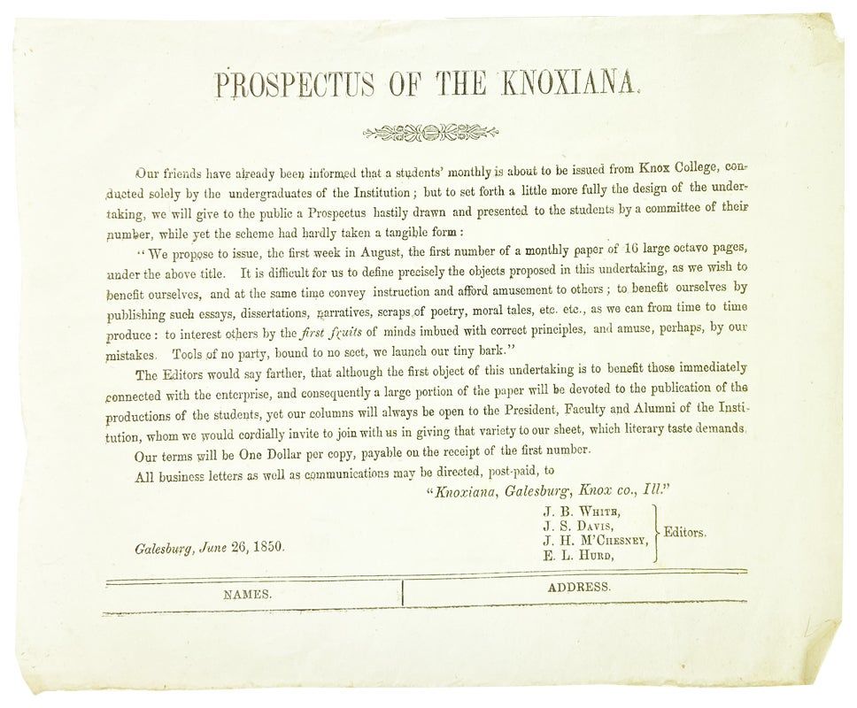 Prospectus for a proposed students' monthly to be issued out of Knox College, "conducted solely by the undergraduates of the Institution." "It is difficult for us to define precisely the objects proposed in this undertaking, as we wish to benefit ourselves, and at the same time convey instruction and amusement to others; to benefit ourselves by publishing such essays, dissertations, narratives, scraps of poetry, moral tales, etc. etc. as we can from time to time." Though the majority of contributions would be written by the undergraduates, the prospectus promises to leave room for columns by the College's President, faculty, and alumni. Price: One dollar per copy.