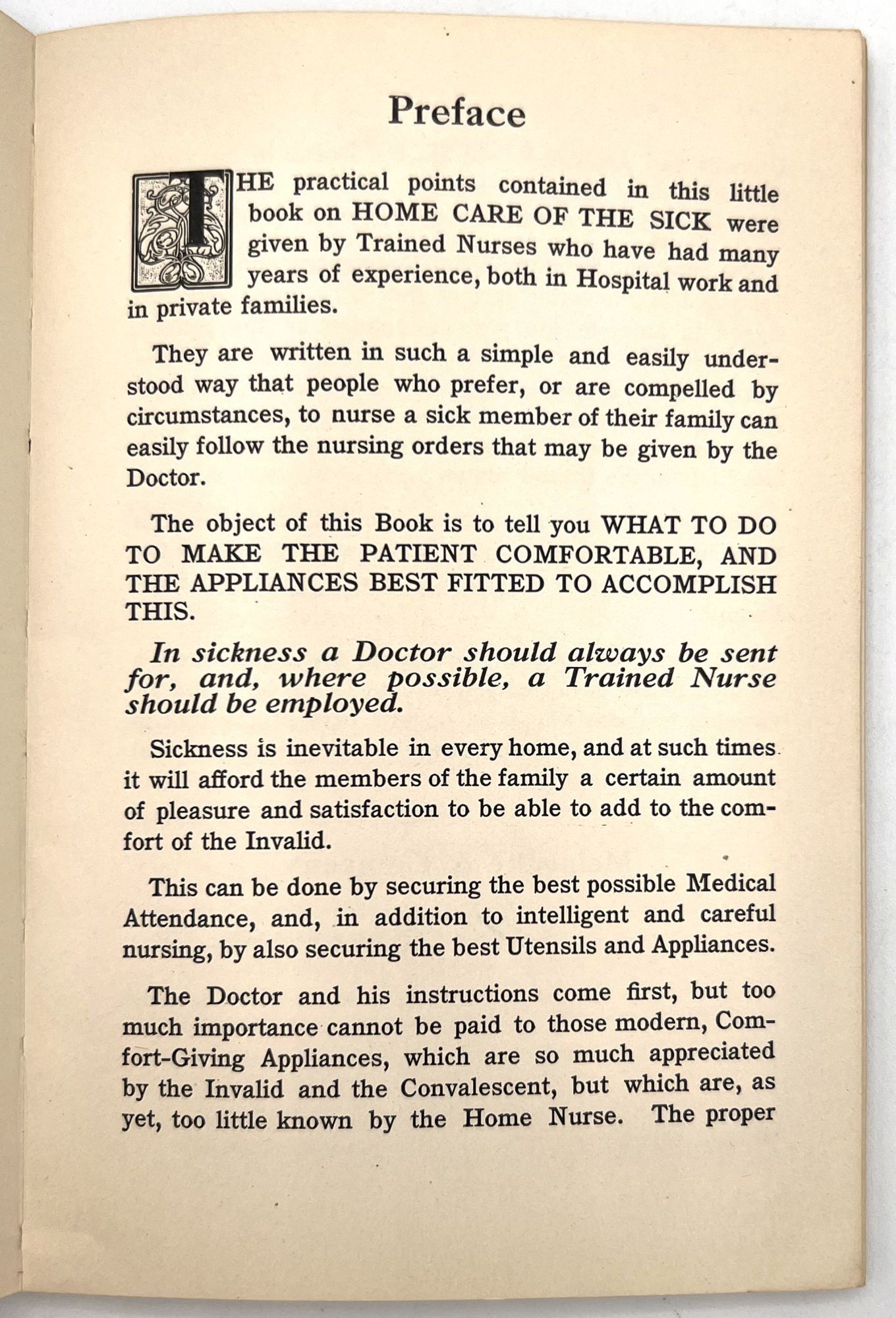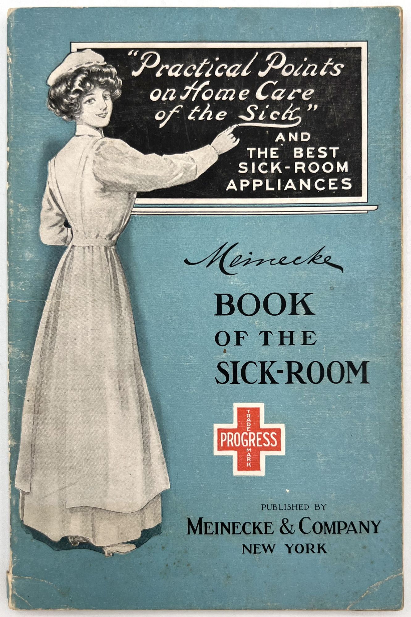 New York, New York: Meinecke & Company, 1914. Good. Toning with light wear and dust soiling to wrappers, a couple chips to spine.. A DIY guide for homemakers to nursing the sick at home, complete with an illustrated trade catalogue of helpful equipment for the sick room sold by Meinecke & Company of New York. Published just before the start of the First World War, it provides a look into the state of the profession at this time, and the kinds of skills and knowledge considered important for wives and homemakers responsible for domestic home care who lack servants or a trained nurse at home (i.e. most of the population). Subjects addressed include: readying and furnishing the sick room; general routine in the sick room; the care of the bed (e.g. use of a rubber sheet); hygienic care of the patient; bed sores and how to relieve them; how to care for delirious patients; practical nursing hints; and items and medicines to keep on hand. The guide is followed by a trade catalogue of Meinecke & Company products such as bedside tables, serving trays, bed pans, urinals, bandages, thermometers, and even a pocket "sputum" flash for tuberculosis patients. Stated second edition. Single vol. (7" by 4.5"), pp. [2], 80, [2], original illustrated blue wrappers with illustration of a nurse in her bright white uniform writing on the chalk board, "Practical Points on Home Care of the Sick and the Best Sick-Room Appliances".