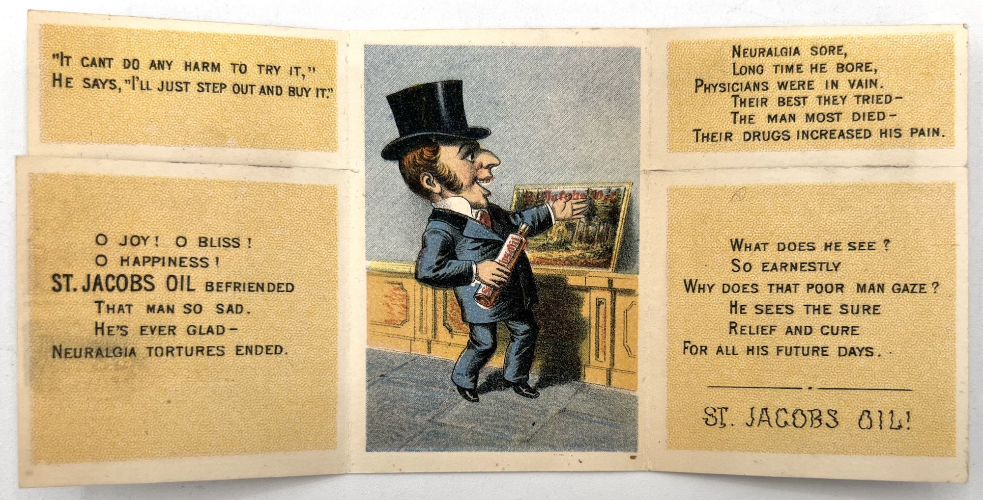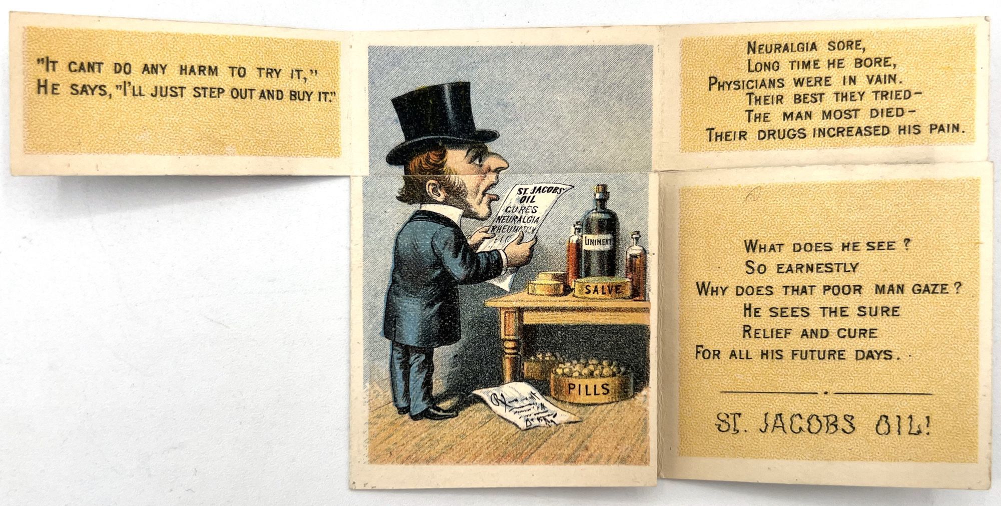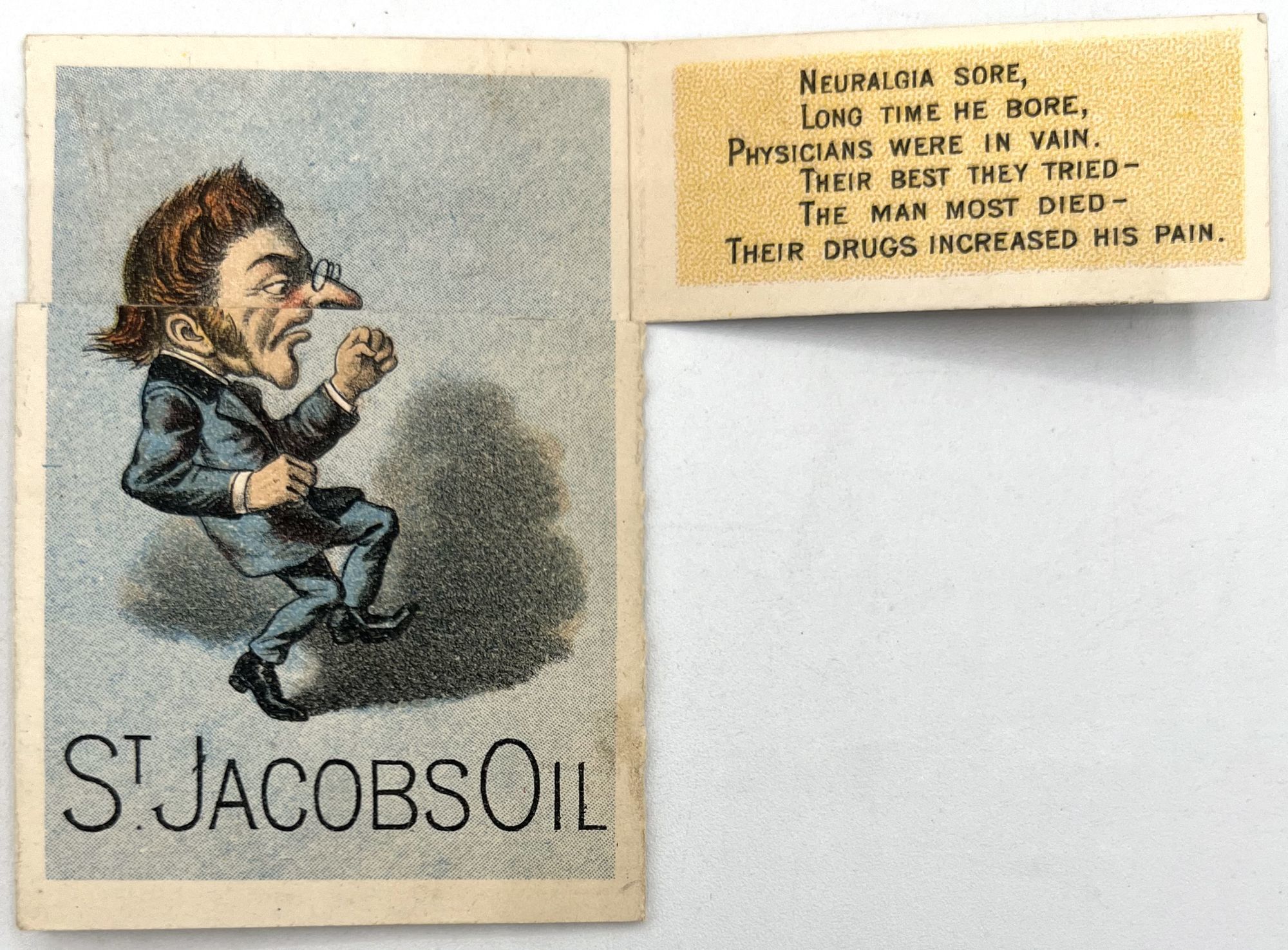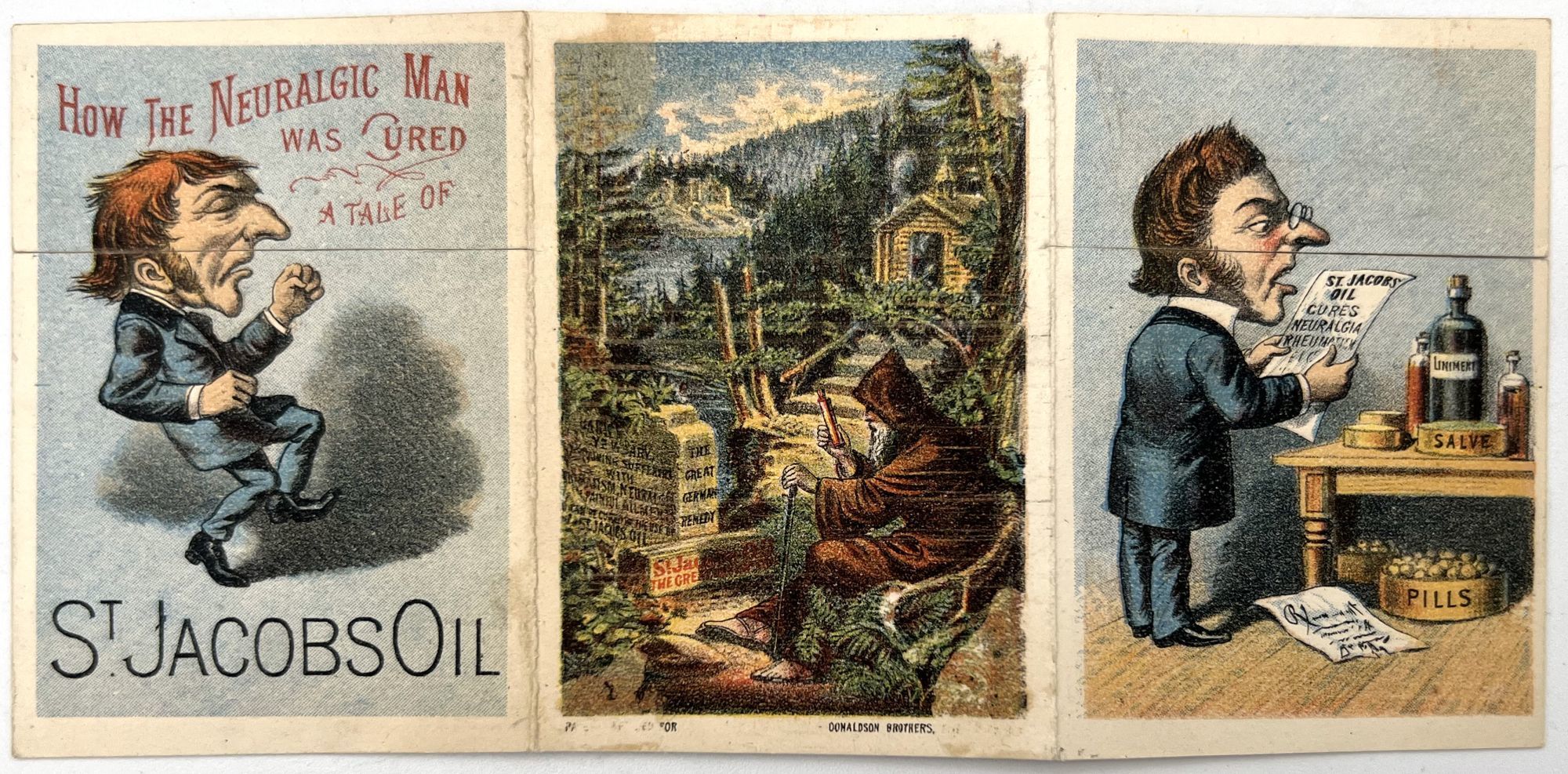 New York, New York: Donaldson Bros, 1890. Very good. Light toning, wear to hinges, small surface tears.. A comical transformation advertising St. Jacobs Oil, a kind of liniment used for aches, pains and rheumatism akin to today's "Icy Hot" patches. The transformation is made from three panels, the two panels on either side of the center panel bisected. To read the story, the reader lifts each panel in alternation. The final panel reveals a smiling cured man with the caption "O Joy! O Bliss! O Happiness! St. Jacobs Oil Befriended That Man So Sad. He's Ever Glad- Neuralgia Tortures Ended". The back panel depicts a monk in the forest. Chromolithographed, measuring approx. 3.25" by 2.25" folded.