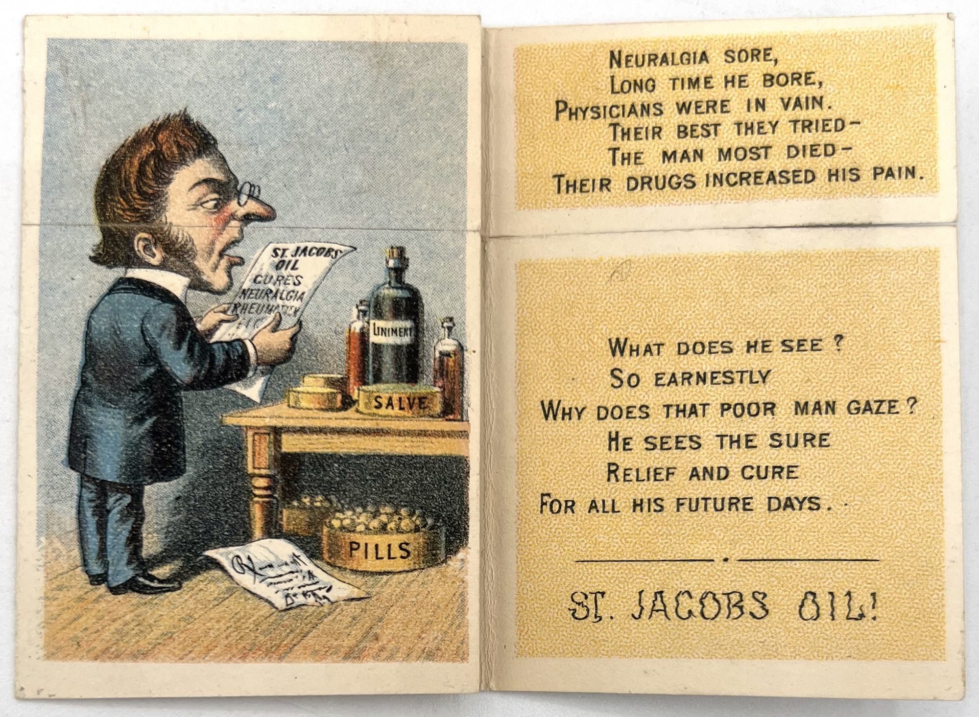 How the Neuralgic Man was Cured: A Tale of St. Jacobs Oil" -- Humorous Transformation Advertisement