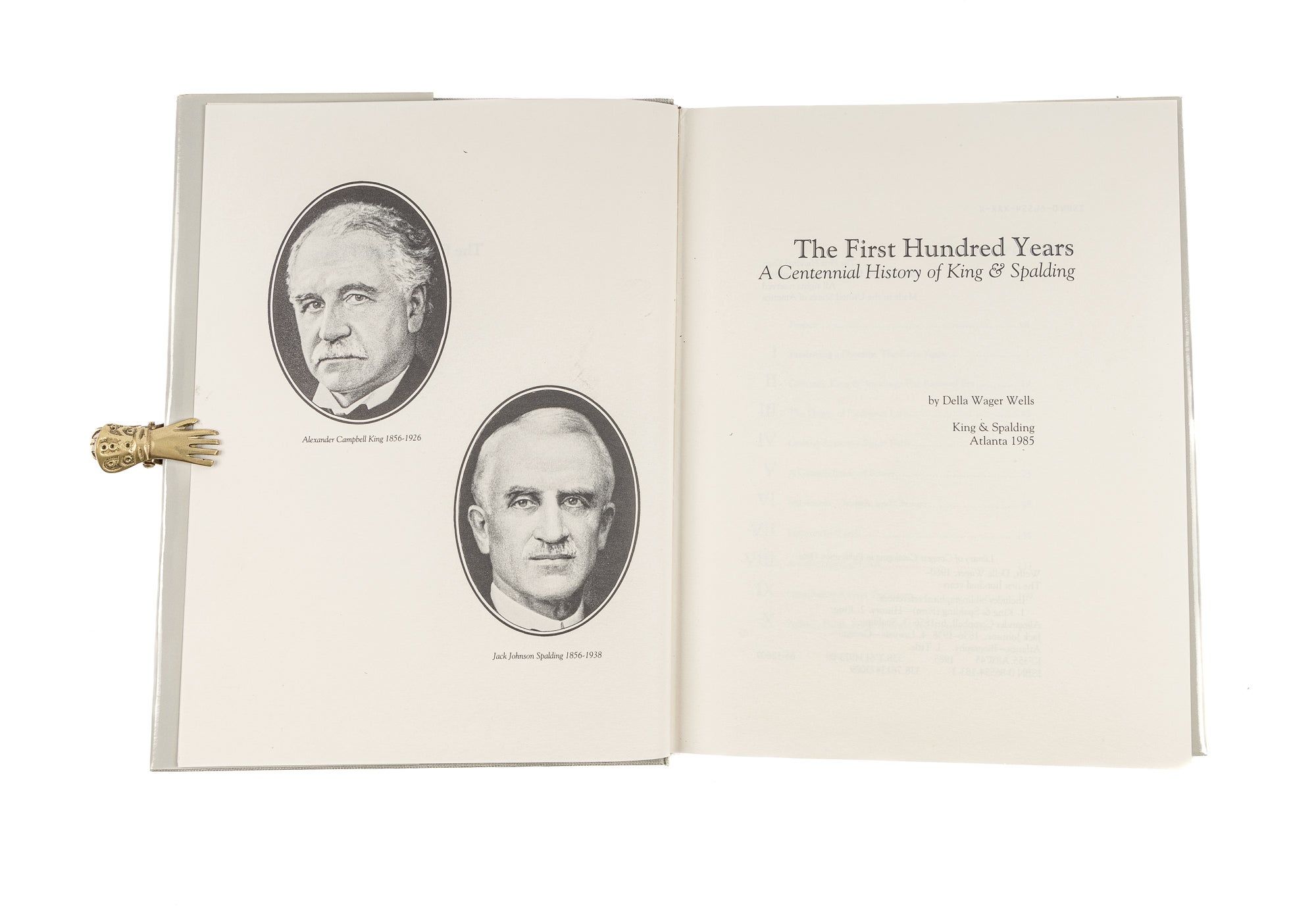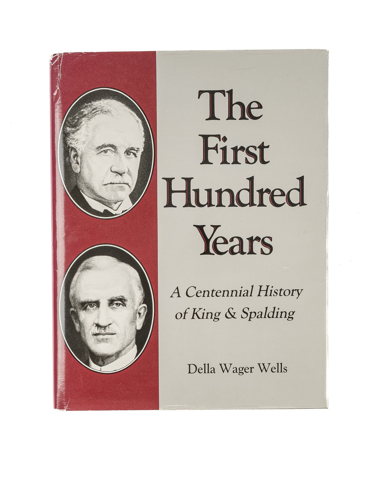 1985. Wells, Della Wager. The First Hundred Years: A Centennial History of King & Spalding. Atlanta: King & Spalding, 1985. Frontispiece. Illustrations. ix, 334 pp. Original gray and red gilt lettered cloth. Photo reproductions on front and rear endpapers. Dust jacket worn at spine ends. Very good. $25. * Commemorating the firm's 100th anniversary, the book details the history of King & Spalding from its founding in 1885. It provides an in-depth account of the firm's rich heritage and serves as a record for legal historians.
