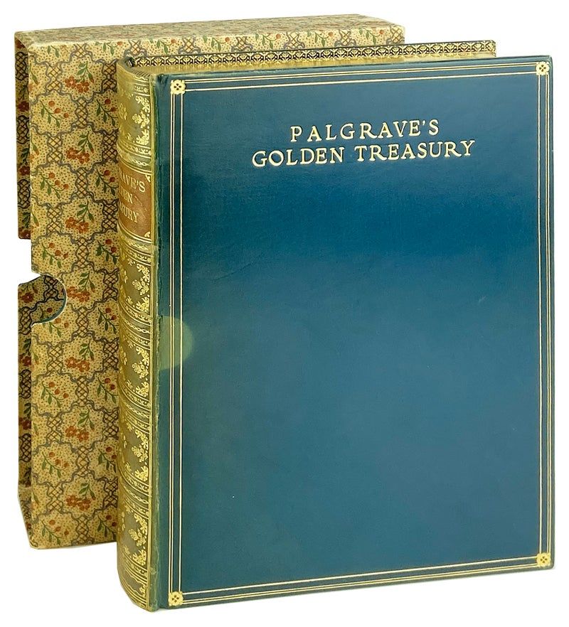 London: J.M. Dent, 1927. Very Good +. London: J.M. Dent, 1927. Reprint. Large octavo. 366 pp. Color plates including frontispiece with tissue guard; complete. Bound by Sangorski & Sutcliffe in full blue calf; five raised bands, leather label, and gilt decoration to spine; all edges gilt; floral endpapers; gilt turn-ins; silk ribbon. Housed in custom made floral slipcase. Edges lightly rubbed and spine sunned. Binding sound. Previous owner's bookplate to front pastedown; interior else unmarked. Slipcase lightly worn along edges, else sound and sturdy. A Very Good or better, handsome copy of Palgrave's famous anthology of English songs and poems.
