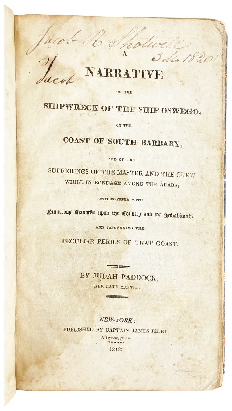 Popular account of shipwreck and forced bondage published by abolitionist Captain James Riley (1777-1840), himself made famous by his own enslavement in the Spanish Sahara following a shipwreck off the Cape Bajador. Riley was eventually purchased by the British and returned to the United States where he wrote the 1817 best-seller "An Authentic Narrative of the Loss of the American Brig." Paddock's account, something of a companion piece to Riley's, was published a year later.