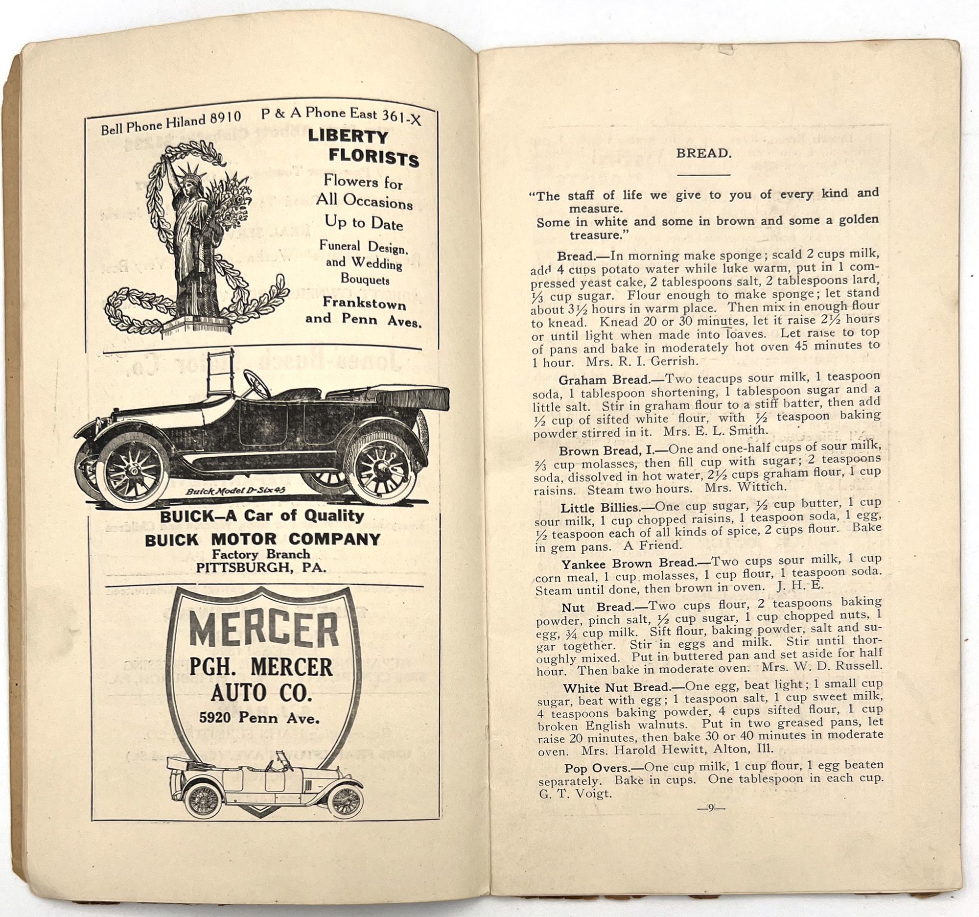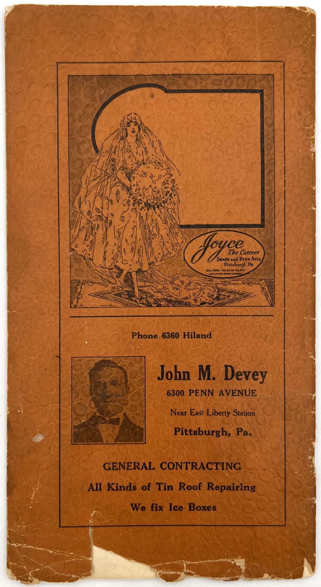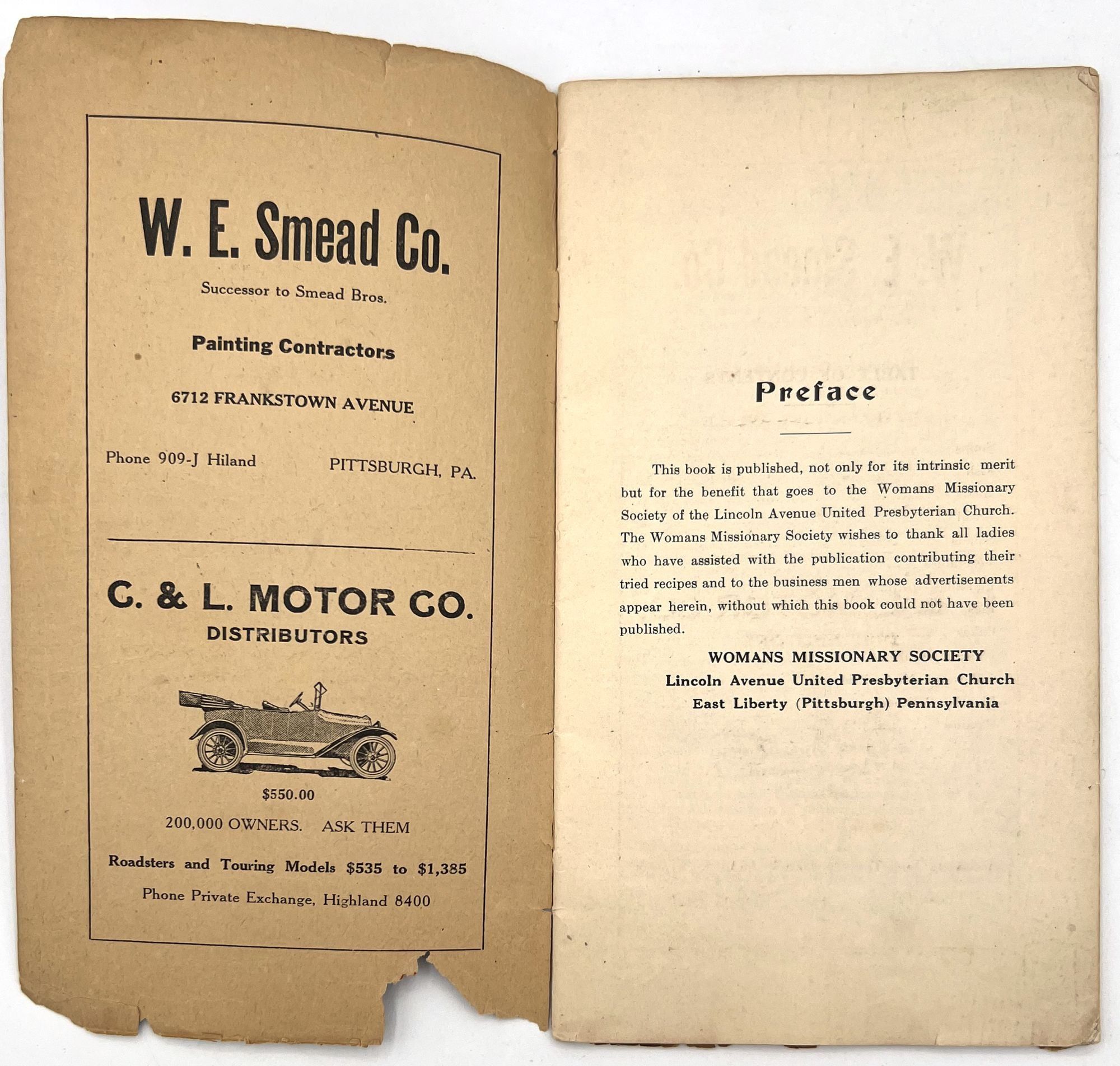 East Liberty (Pittsburgh), Pennsylvania: Womans Missionary Society of the Lincoln Avenue United Presbyterian Church, 1917. Good. Toned with dust soiling, chipping and short tears to wrappers with some loss to foot.. A compilation of recipes by members of the Womans Missionary Society of the Lincoln Avenue United Presbyterian Church in East Liberty, Pennsylvania. Published in 1917, it contains dozens of tried and tested recipes from the members themselves, shared with each other and the community to promote their mission and activities. Some of the recipes are signed, some are not, but all share the same goal of providing housewives with cost-efficient, labor saving, and nutritious meals. Divided into chapters: Soups, Fish, Meats, Bread, Salads, Vegetables, Puddings, Pies, Cakes, Ices and Drinks, Jellies and Marmalades, Pickles and Relishes, and Candies. Includes advertisements throughout from local businesses. Single vol. (9.25" by 5"), pp. 28, in original illus. textured orange paper wrps. The Womans Missionary Society of the Lincoln Avenue United Presbyterian Church appears to have been founded in the 1910s and operated into at least the 1930s.